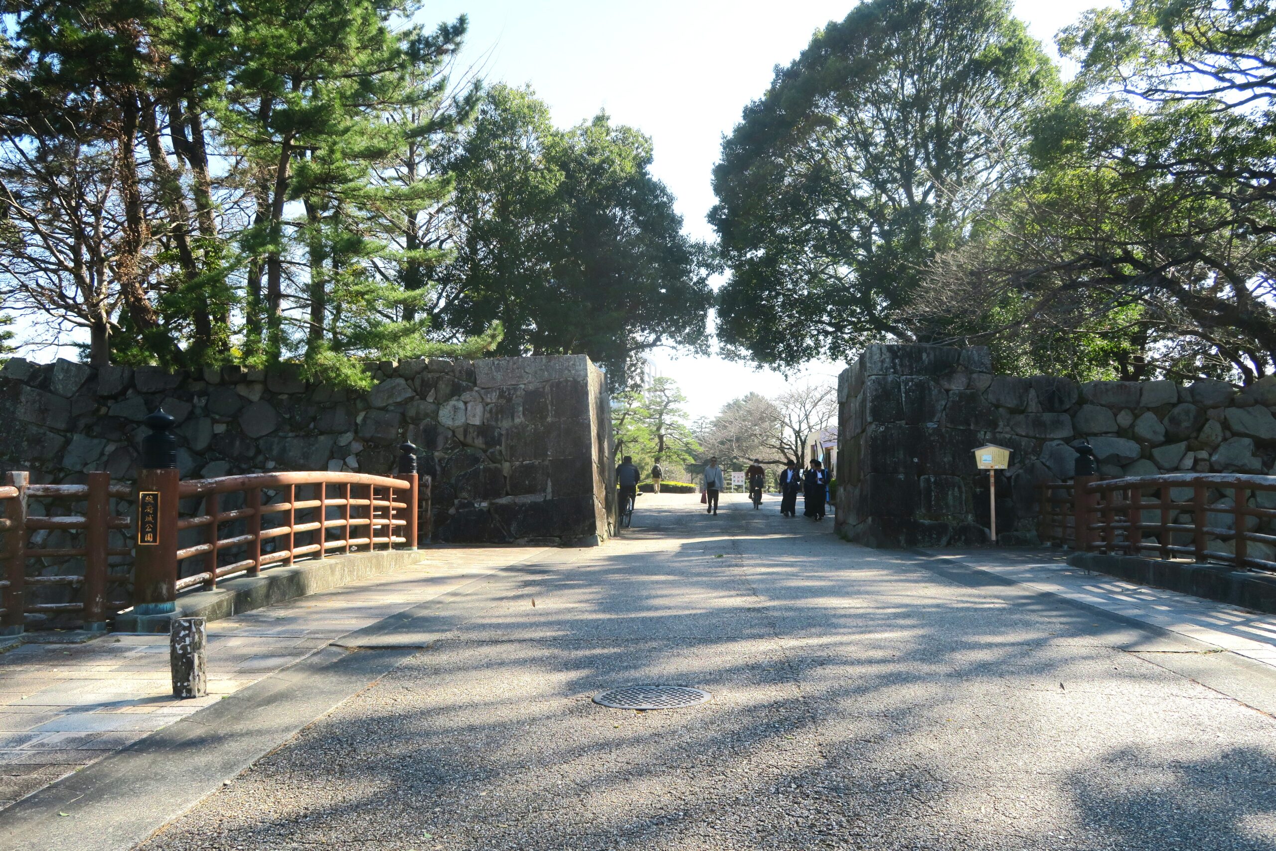 東御門橋を渡り東御門から城内に入ります。東御門は駿府城に二の丸の東に位置する主要な出入口でした。東御門の前が安藤帯刀直次(紀州藩附家老)の屋敷があったことから「帯刀前御門」、また台所奉行であった松下淨慶にちなんで「淨慶御門」と呼ばれ主に重臣たちの出入口として利用されました。