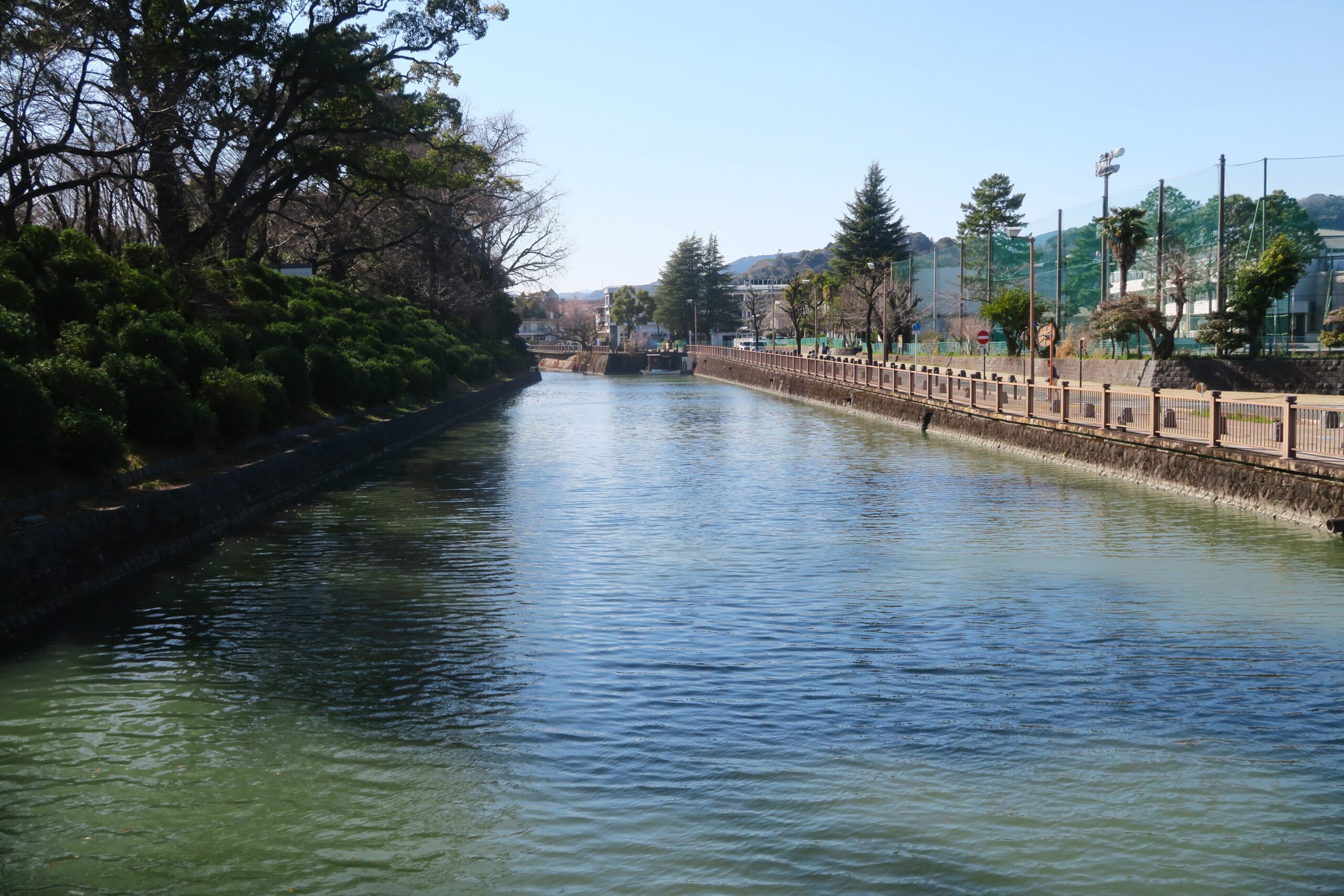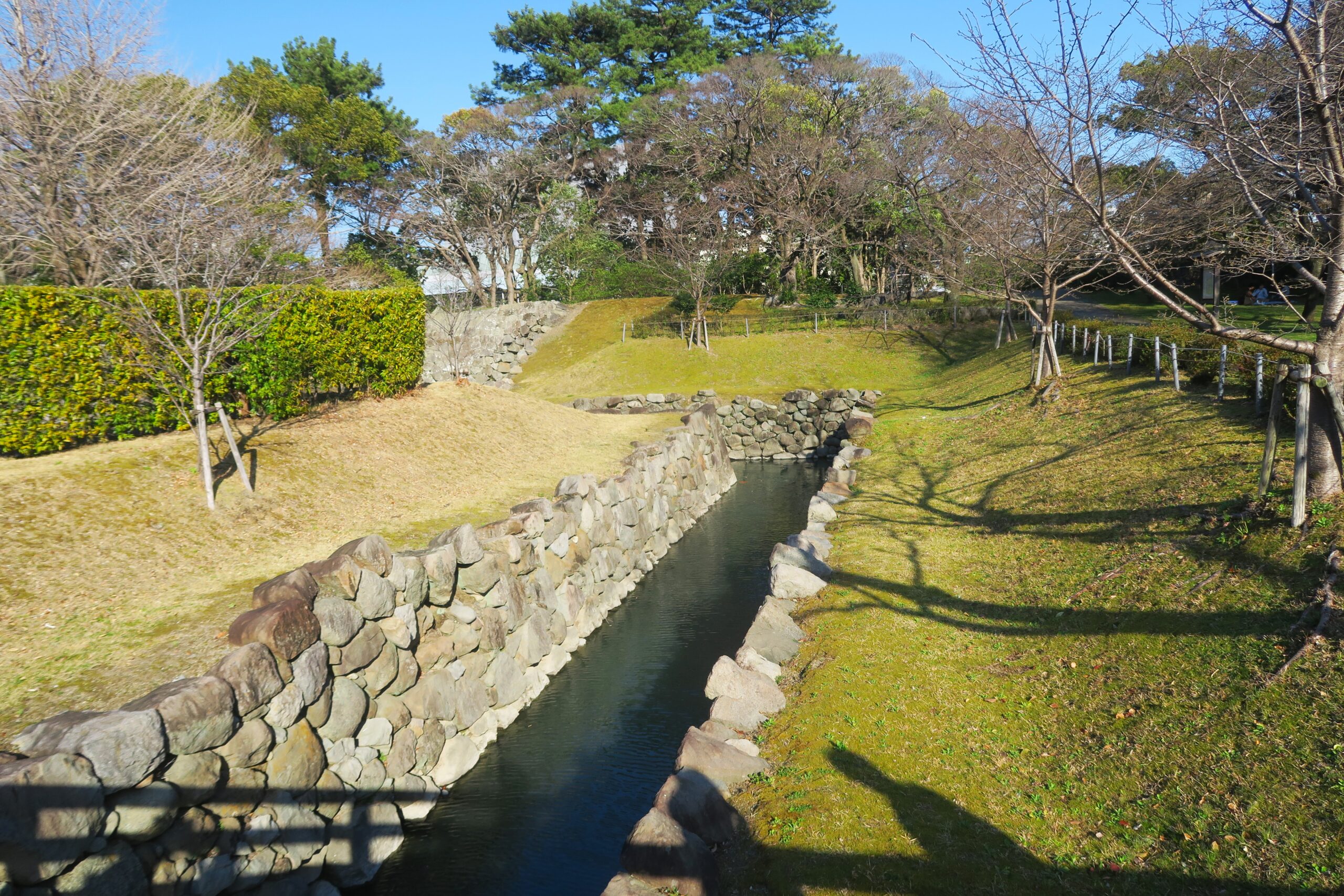 本丸堀と二ノ丸堀をつなぐ二ノ丸水路もよくできた水路です。珍しい石敷きの水路が構築され、本丸堀の水位調整をしていました。この水路は巴川と合流して清水までつながっているので、清水港に集まる荷物を米蔵などに運び込んでいました。