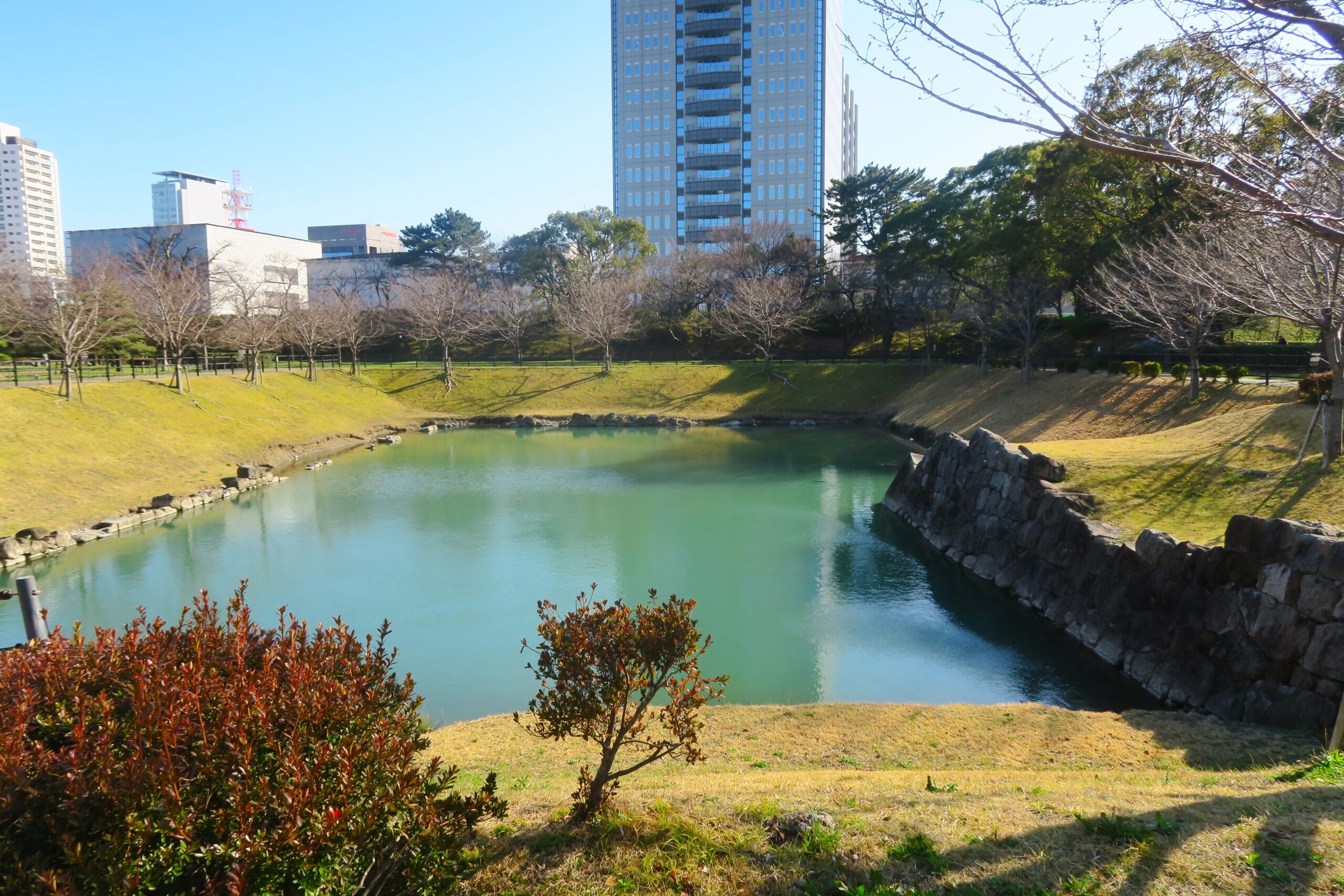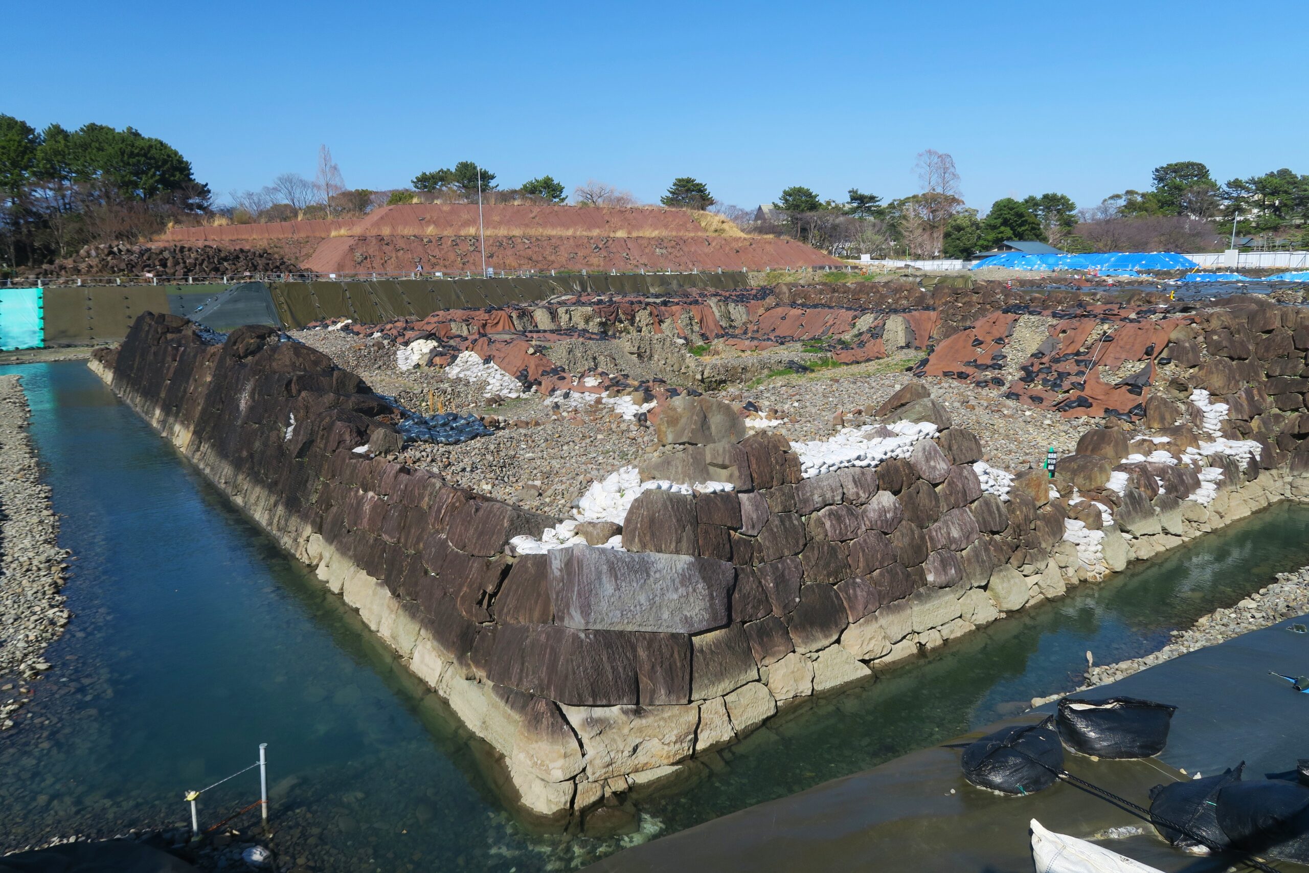 駿府城の曲輪は同心円状に配置された「輪郭式」です。本丸を本丸堀(内堀)が囲み、その外側に二ノ丸、二ノ丸堀(中堀)、三ノ丸、三ノ丸堀(外堀)が順番にめぐります。巽櫓の前に公開されている本丸堀も南東隅の一部だけ公開されているので、ぱっと見はただの池のようにしか見えませんが、駿府城の三重堀の一番内側の堀で本丸を取り囲んでいました。幅約23m~30mで深さは江戸時代には約5mありました。石垣は荒割した石を積み上げ、隙間に小さな石を詰めていく「打ち込みはぎ」と呼ばれる積み方です。角の部分は「算木積み」という積み方で横長の石を互い違いに積んで崩れにくくしています。この内側が本丸の範囲と思えばかなり広いことも察しがつきます。