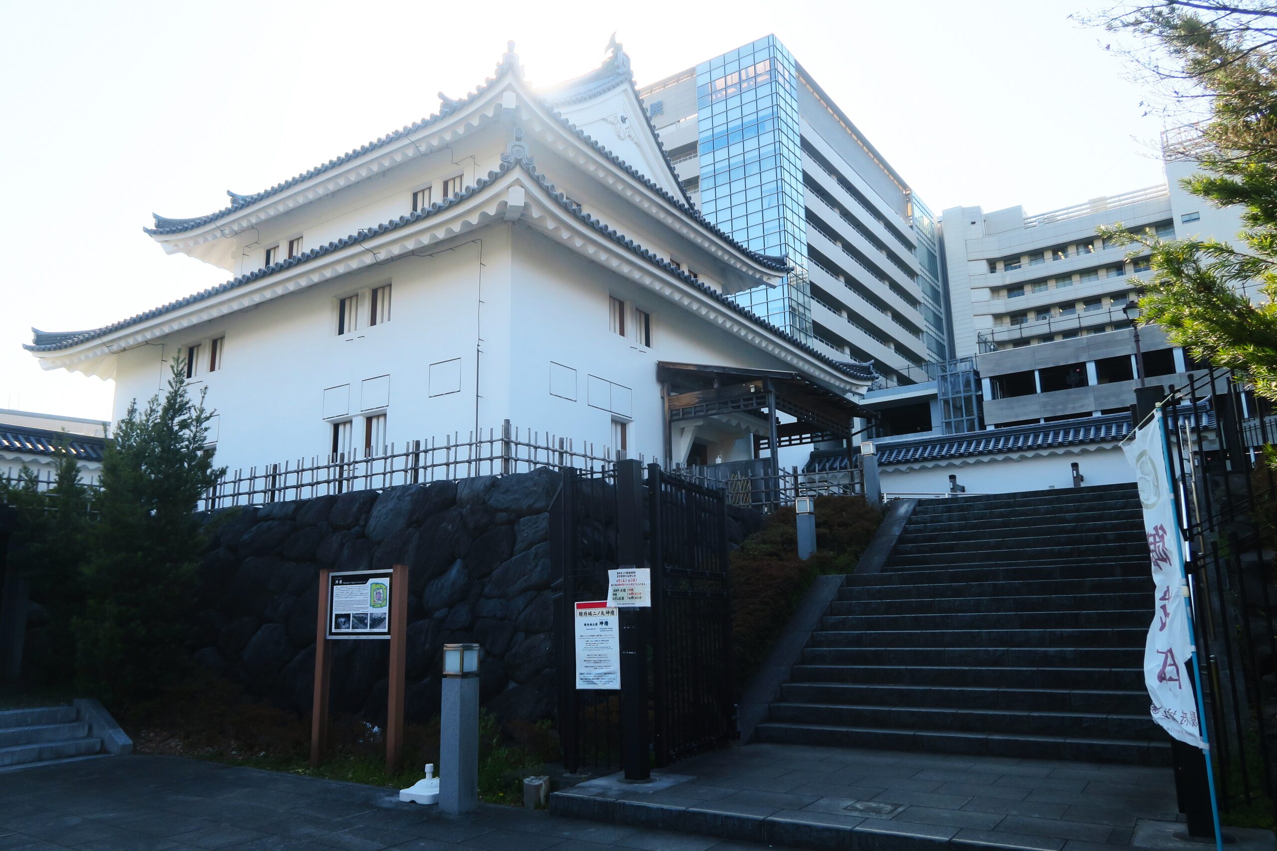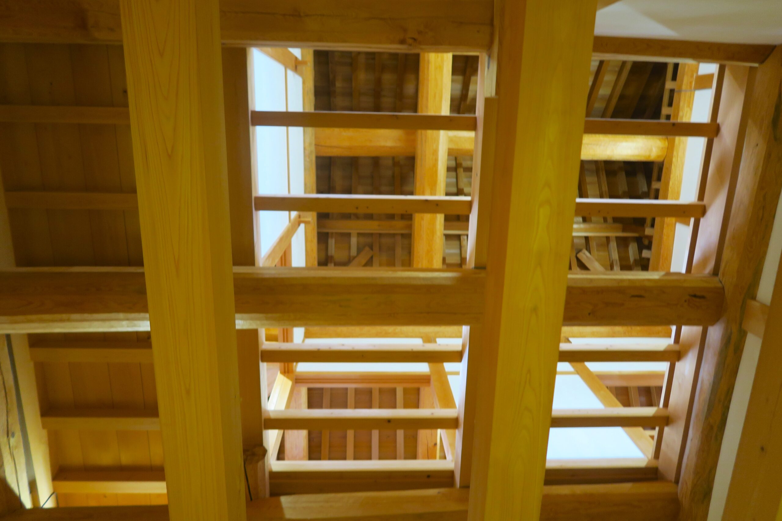 復元は宝暦年間(1751~1763)の修復記録が記された「駿府御城内外覚書」を基に行い、不足している情報は、同じ徳川家の城んである名古屋城の西南隅櫓など現存する建築物を参考にしています。内部は各階の床板と天井板を取り外していて、櫓の構造を見通すことができます。