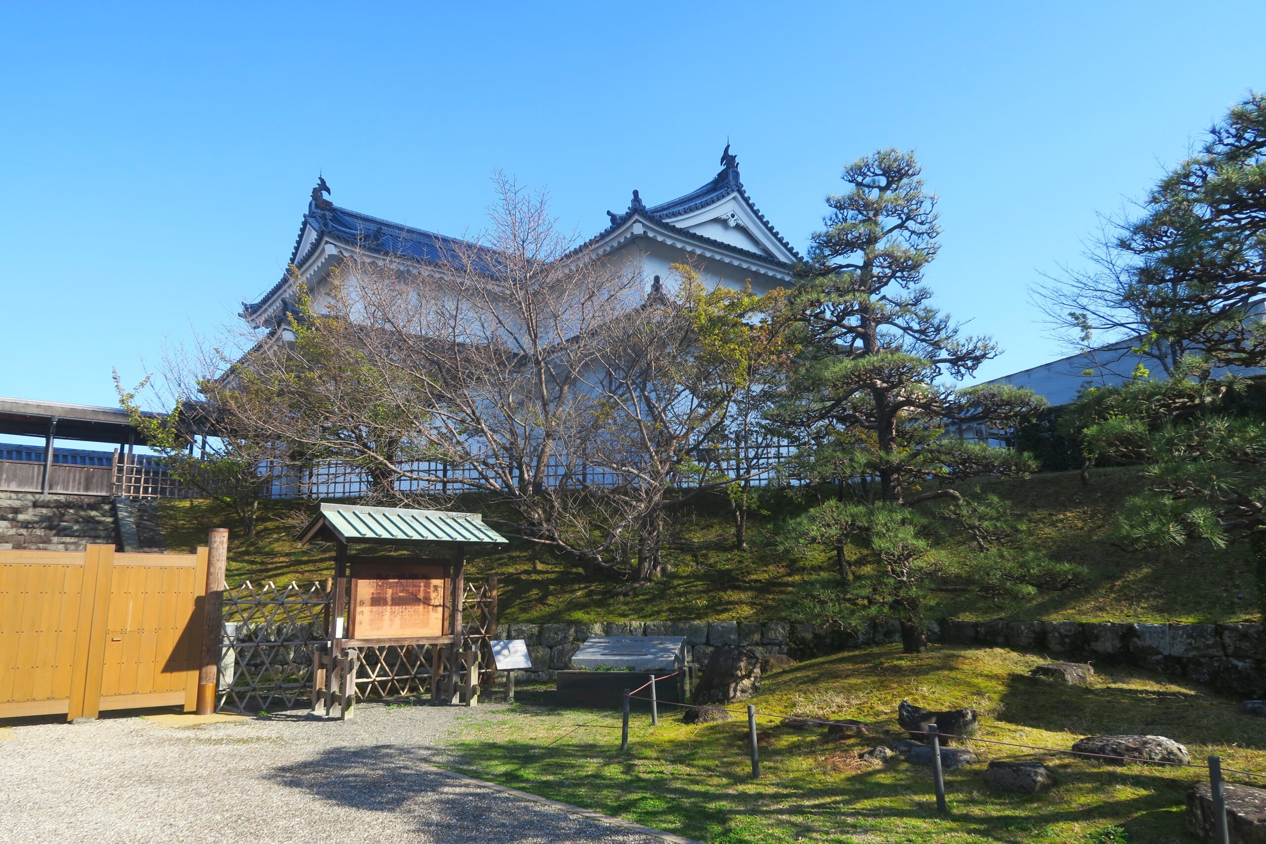 江戸時代には、方位に十二支を用いて北を「子」として時計周りに割り当てていました。二ノ丸坤櫓は城の中心から見て南西の方角にあるためそのように呼ばれていました。富士山が美しく見通せる角度にあり、家康のお気に入りの場所だったようです。櫓は矢倉とも書かれ、武器庫や戦の際の物見の役割を持つ重要な建物でした。そのため、城の四隅や御門周辺に設けられています。坤櫓も安政地震(1854年)後も再建されず平成26年(2014)に日本の伝統的な木造工法によって復元されました。
