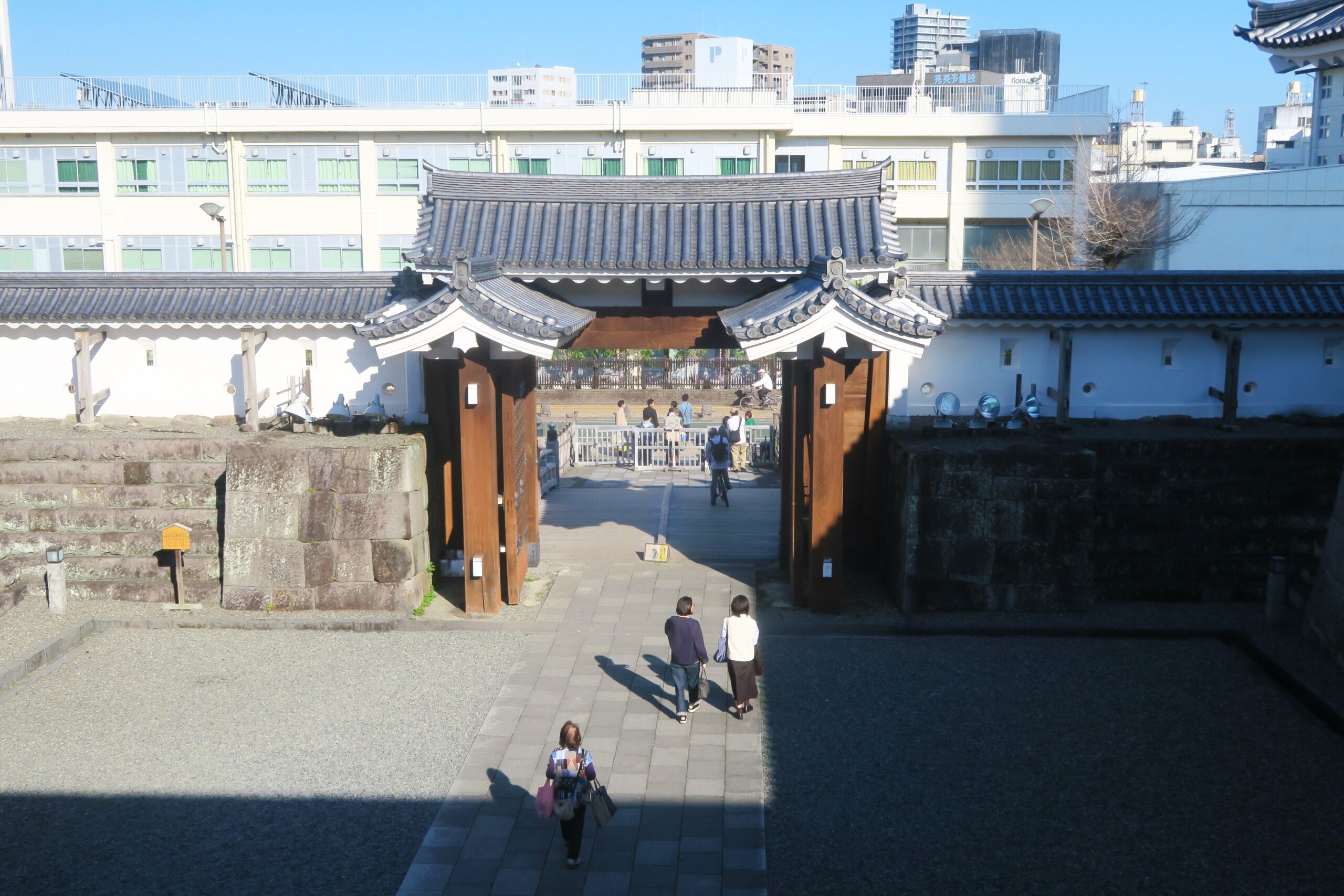本丸には政庁と居館を兼ねた本丸御殿があり、紅葉山庭園のある場所には二ノ丸御殿と台所がありました。二ノ丸から三ノ丸へは東御門を含めて五つの門(北御門、御水門、清水御門、二ノ丸御門)が設けられていました。写真は北御門