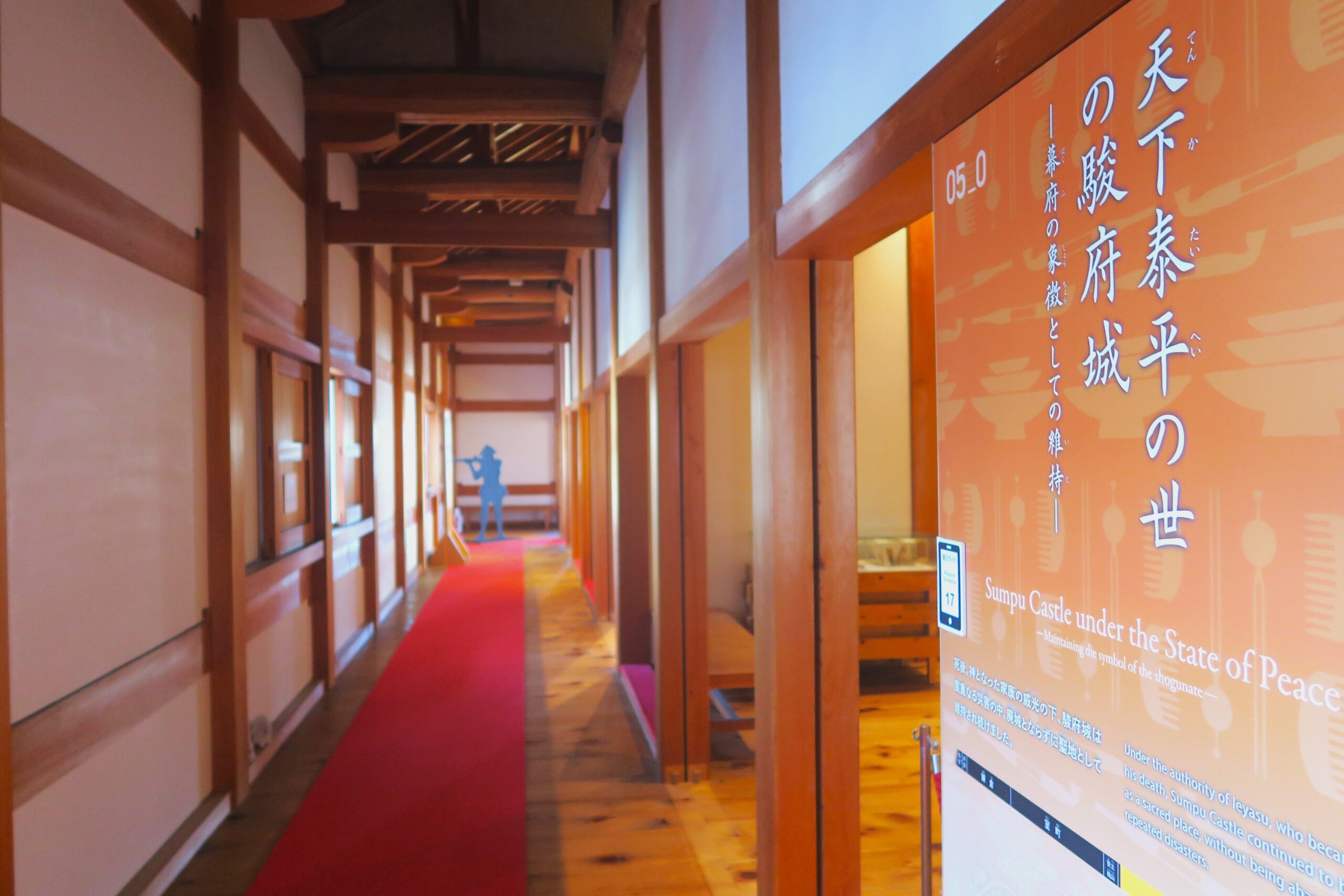内部は資料館となっていてゾーン1~7まであり、駿府城の歴史や構造を時代別に学ぶことができます。特に駿府城復元模型は、断片的残る遺構から全容を想像することができます。また所々に人型のパネルが置かれ、戦闘時の様子もうかがえます。