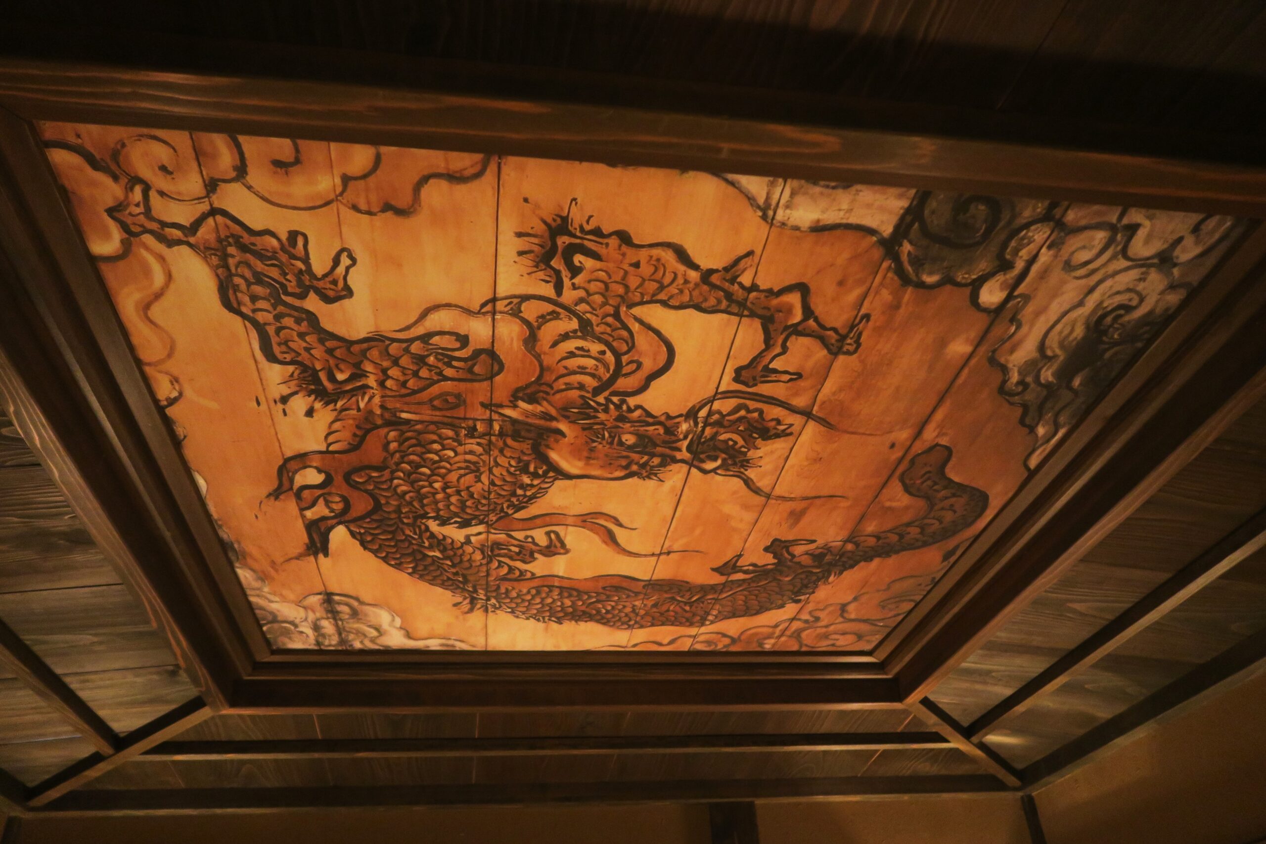 雪斎は駿河の豪族・庵原氏の一族に生まれ、14歳のときに出家して富士の善得寺に入寺。その後京都五山第三位の名刹建仁寺で修行を積みました。当時から雪斎の秀才ぶりは広く知られ、今川氏親が芳菊丸(義元の幼名)の教育係として駿府に招いたと言われます。写真の天井の龍の絵は狩野派絵師の作と伝わります。