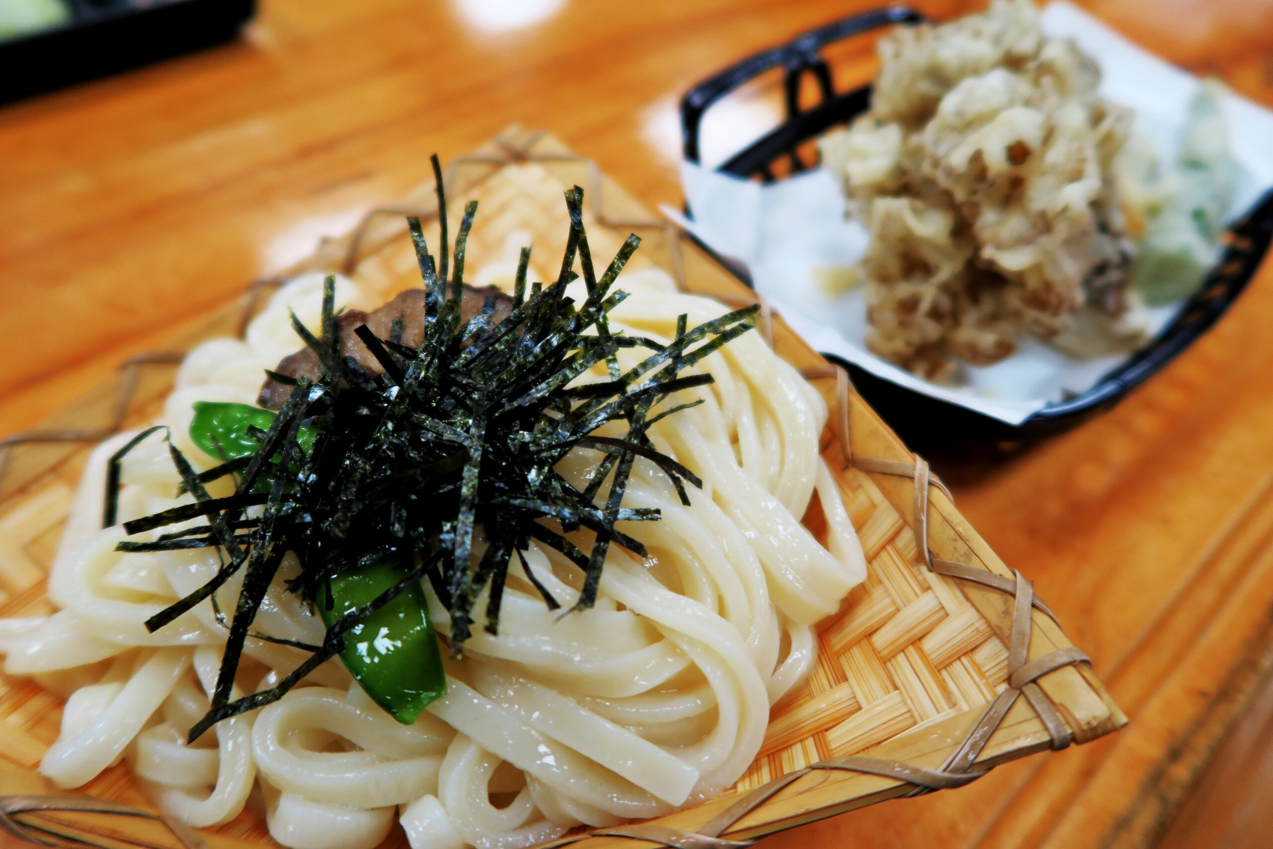 水沢うどんは竹ざるに盛った冷たいうどんを、つけ汁につけて食べる「ざるうどん」がおいしい食べ方らしいので、ざるうどんと舞茸天ぷら2ヶがついた「楓」1375円を注文しました。やや太めで弾力が強くコシがあるツルツル麺が特徴です。地元の契約農家さんが栽培した「天ぷら専用舞茸」の大きいことにびっくりしたのですが、噛めばじゅわっとひろがる舞茸の風味がうれしいです。