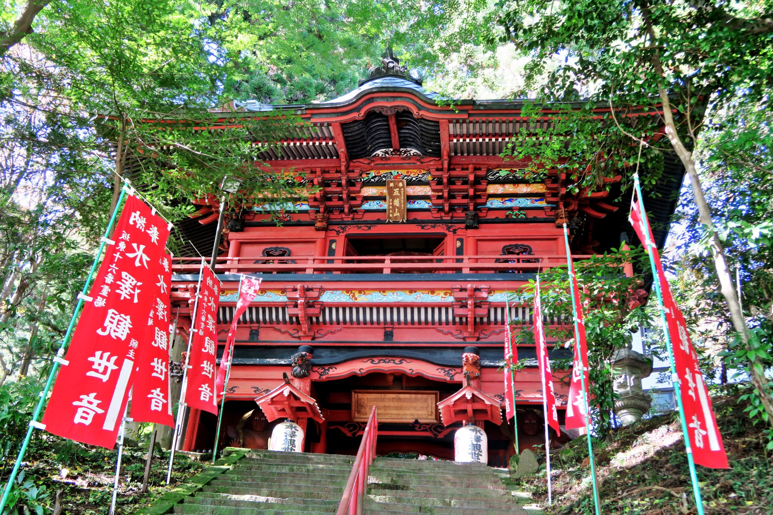 駐車場を抜けて参道の「苦を無くす」という97段の石段を登り幽玄な仁王門をくぐって本堂に向かいます。仁王門は元禄年間に建立されたもので、間口三間・奥行き二間の「平板銅板葺き重層入り母屋造り」で、仁王尊と風神・雷神が祀られ、極彩色の楼門の上には、釈迦三尊(釈迦如来・文殊菩薩・普賢菩薩)が安置されています。