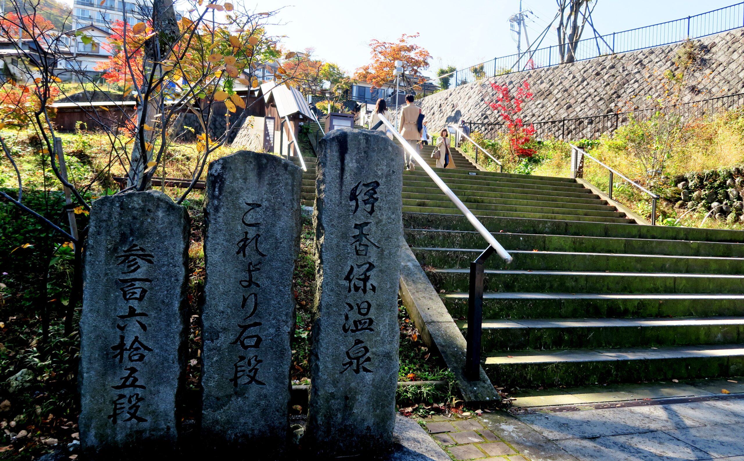 前橋出身の詩人・萩原朔太郎のエッセイに『伊香保の町は、全部石垣で出来ていると言っても好い。その石段の両側には、土産物の寄木細工を売る店や・・・(中略)中庭に廻廊のある二層三層の温泉旅館が、軒と軒とを重ね合わせて・・・』(石段上りの街)とあるように両側に旅館やお土産店、温泉旅行の気分を盛り上げる遊技場などが並んでいます。365段の石段は散策するのにちょうど良い長さで、いろんな店が軒を連ね、温泉まんじゅうの幟が風に揺れる脇を観光客が通りすぎていきます。この石段を上ったり下りたりしながら、湯めぐりしたり、玉こんにゃくをつまみ歩いたりが伊香保の王道の楽しみ方でまったく飽きさせません。