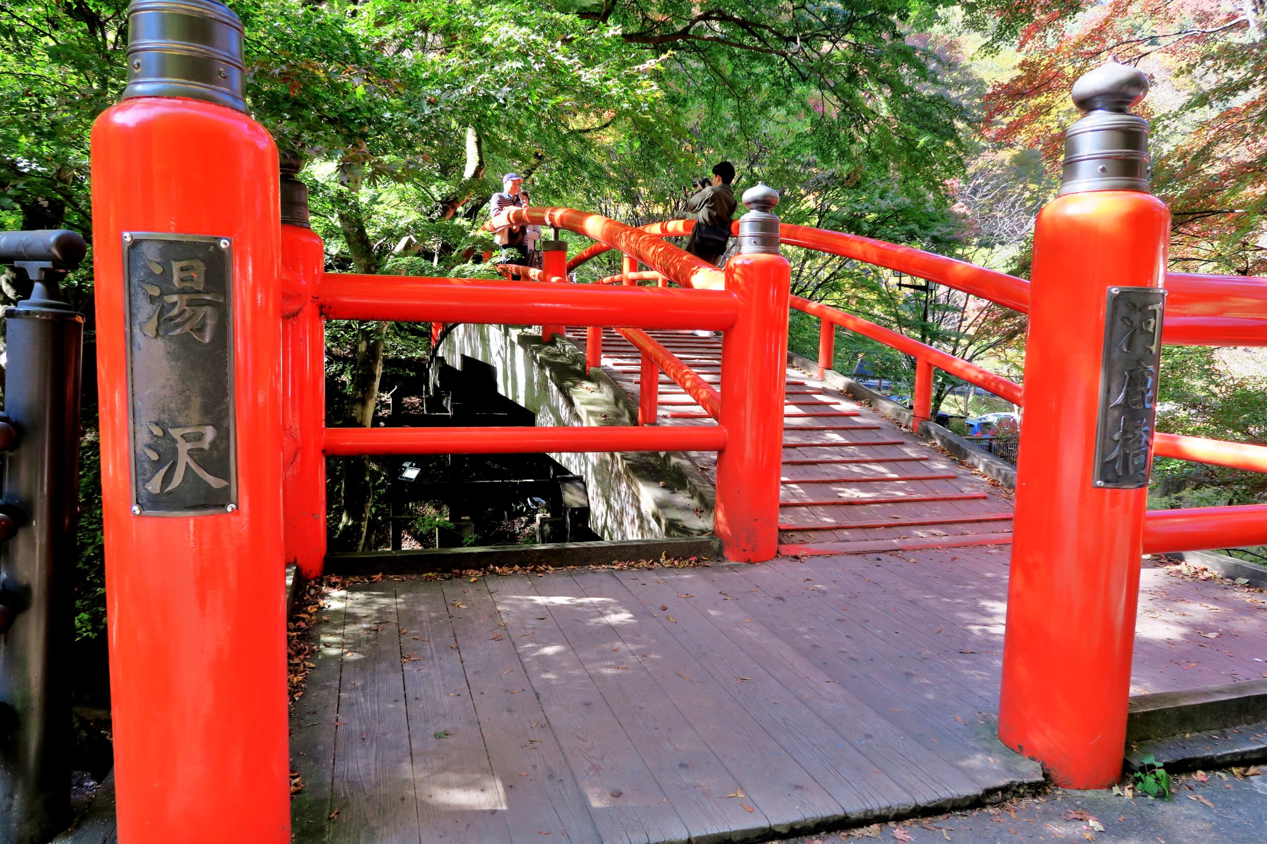 伊香保神社に手を合わせ、湯元通りを共同湯「伊香保露天風呂」に向かいます。途中、湯沢の上流に架かる擬宝珠をのせた朱塗りの「河鹿橋」付近は、群馬県内でも名だたる紅葉の名所で、榛名山系の豊かな自然に恵まれ、もみじ、かえで、くぬぎ、うるしなどが自生してこれらの樹々の紅葉が11月上旬ピークを迎えます。※今年は少し遅いようです。かつてはカジカガエルの鳴き声がよく聞こえたことから命名され、下を流れる湯沢川は鉄分が多く、川床は茶褐色に変色しています。