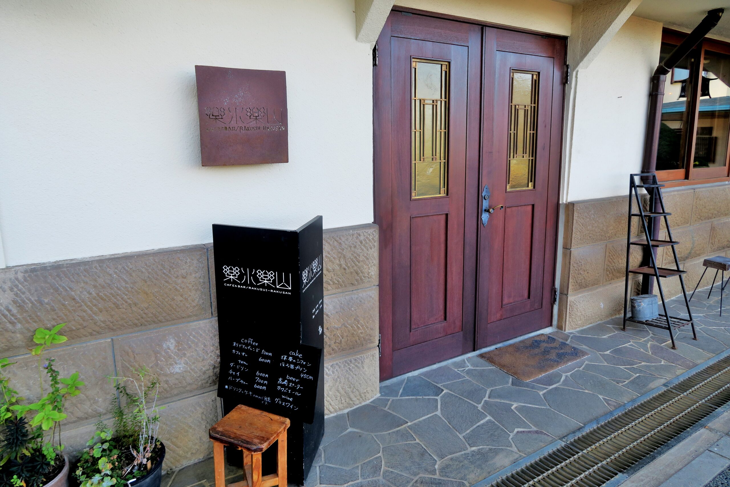 戻る途中少しカフェで寛ごうと、石段166段目、酉年の千明(ちぎら)仁泉亭の敷地内にあるCAFE AND BAR「楽水楽山」を訪れます。千明仁泉亭は、伊香保を愛した明治の文豪徳富蘆花が常宿とし、最後をここの離れで迎えた老舗旅館です。室町時代を代表する連歌師宗祇が文亀2年(1502)に訪れた際、温泉の効能の素晴らしさを「めぐみの湯(仁乃湯)」と称したことが名称の由来です。明治31年(1898)5月、蘆花は新婚5年を記念して愛子夫人と伊香保を訪れ3週間滞在します。同年11月から兄の徳富蘇峰が主宰する「国民新聞」紙上で伊香保を舞台に悲劇の名作『不如帰』の連載を開始し、世に出ました。『上州伊香保千明の三階の障子開きて、夕景色をながむる婦人。年は十八九。品よき丸髷に結いて、草色の紐つけし小紋縮緬の被布を着たり・・・』と冒頭を飾るのが千明仁泉亭です。