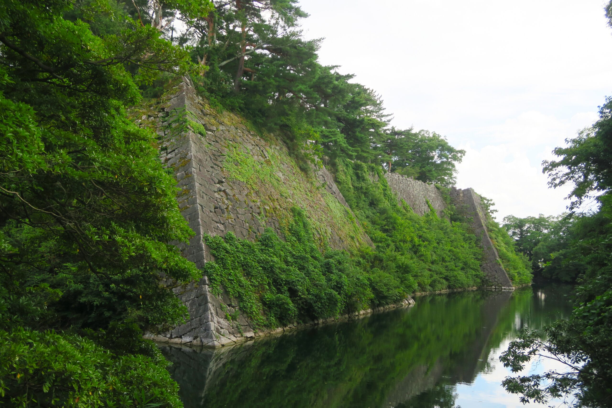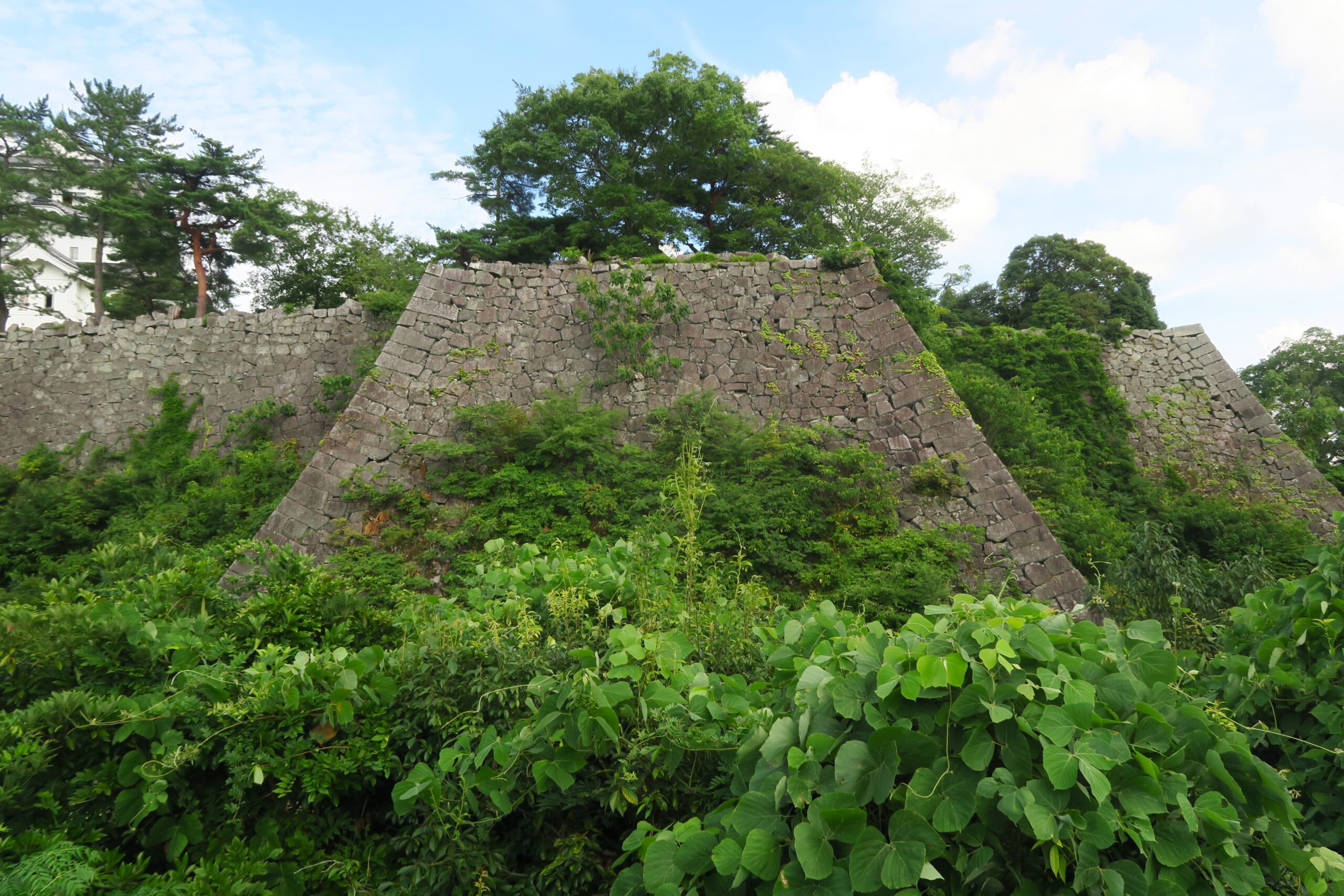 大阪方に対抗するために特に西方面の防御に注ぐため、本丸を西に拡張し、高さ30mの高石垣で囲み、南を大手とし筒井古城を大改修しました。現在も残る高石垣は、高虎が縄張りした大阪城が1位(約32m)、伊賀上野城が2位(約30m)となっていて、この二つの石垣は互いに向き合っています。写真は城の西側の道からで、内堀越しにその姿がよく見えます。