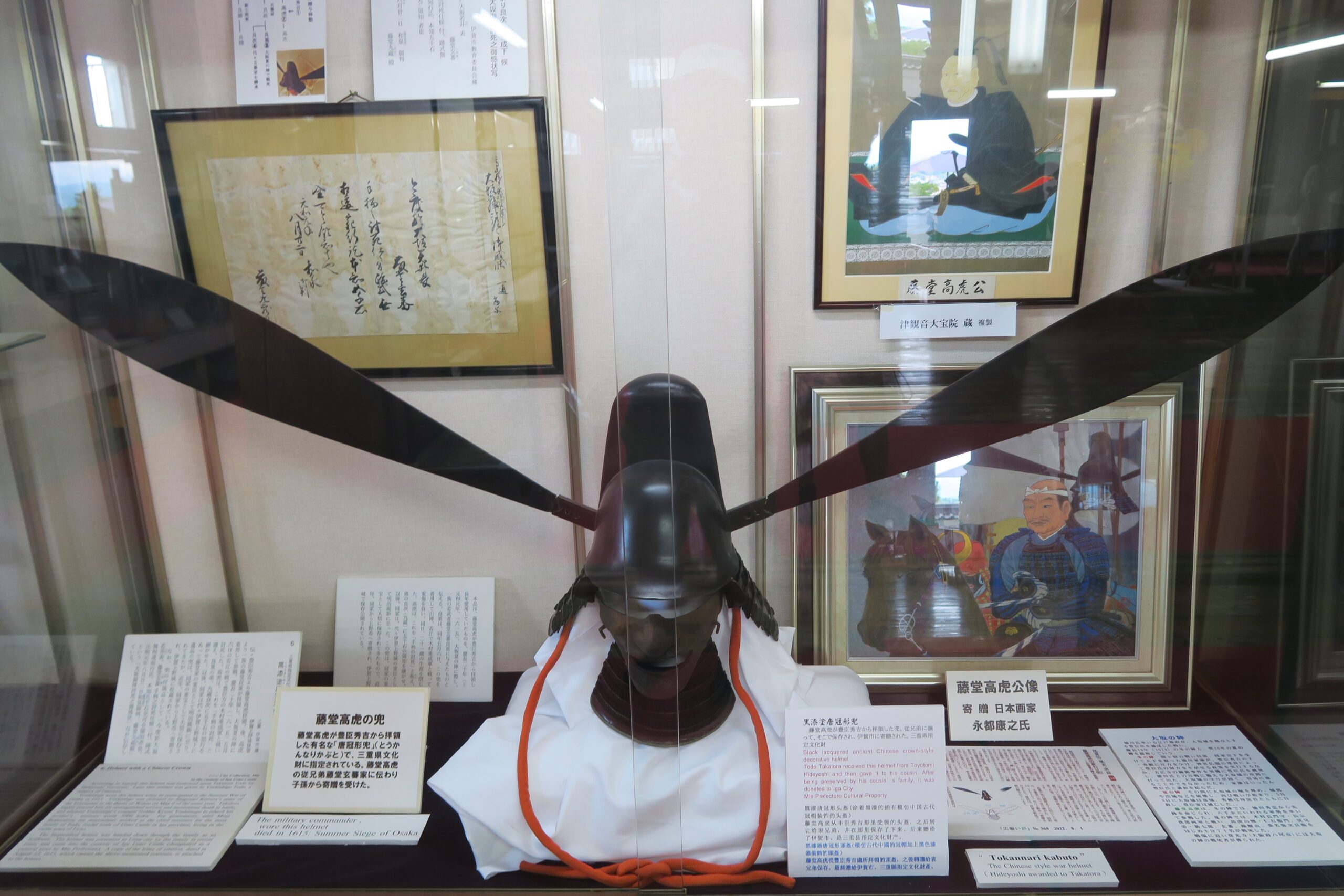 3層からなる天守の内部には、武具や甲冑など藤堂家ゆかりの作品が数多く展示されています。なかでもひときわ目を引く逸品が藤堂高虎が豊臣秀吉から拝領した「黒漆塗唐冠形兜」です。高虎から分家の「藤堂玄蕃良重」に引き継がれ、大阪夏の陣で良重が着用したと伝わります。兜鉢と平ら小札を紐でおどした兜はいずれも錆下地黒漆塗りで、兜鉢の頂上部に木製錆下地黒漆塗りの巾子を装着しています。左右に飛び出した「纓」と呼ばれる付属具は83cmもあり威圧感を与えます。