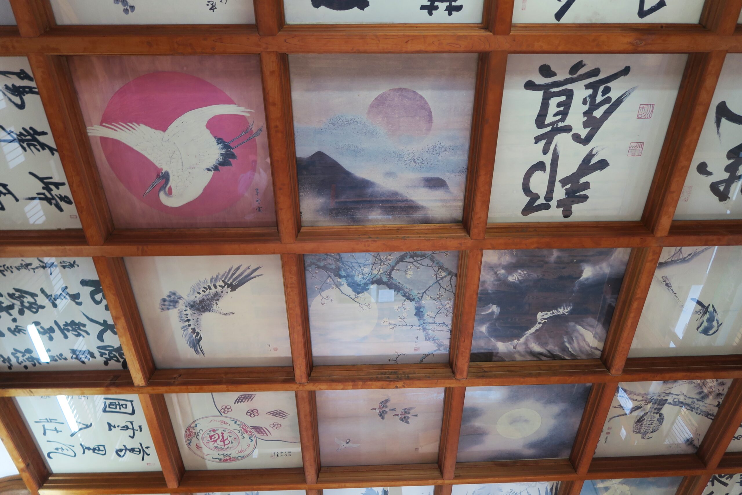 また天守最上階の格子天井には、天守の完成を祝って著名な画家や書家などより送られた色紙絵が46枚はめ込まれています。川崎克が描いた「鷹」の絵をはじめ、横山大観が」描いた「満月」の絵などがあります。