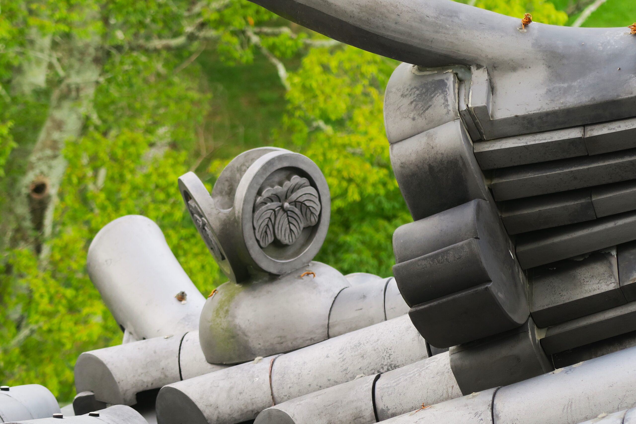 天守閣の三階からは伊賀市街を一望でき、城が山に囲まれた小さな伊賀盆地の真ん中にあることを実感します。屋根の所々に藤堂家の家紋「蔦紋」を入れた瓦を発見します。