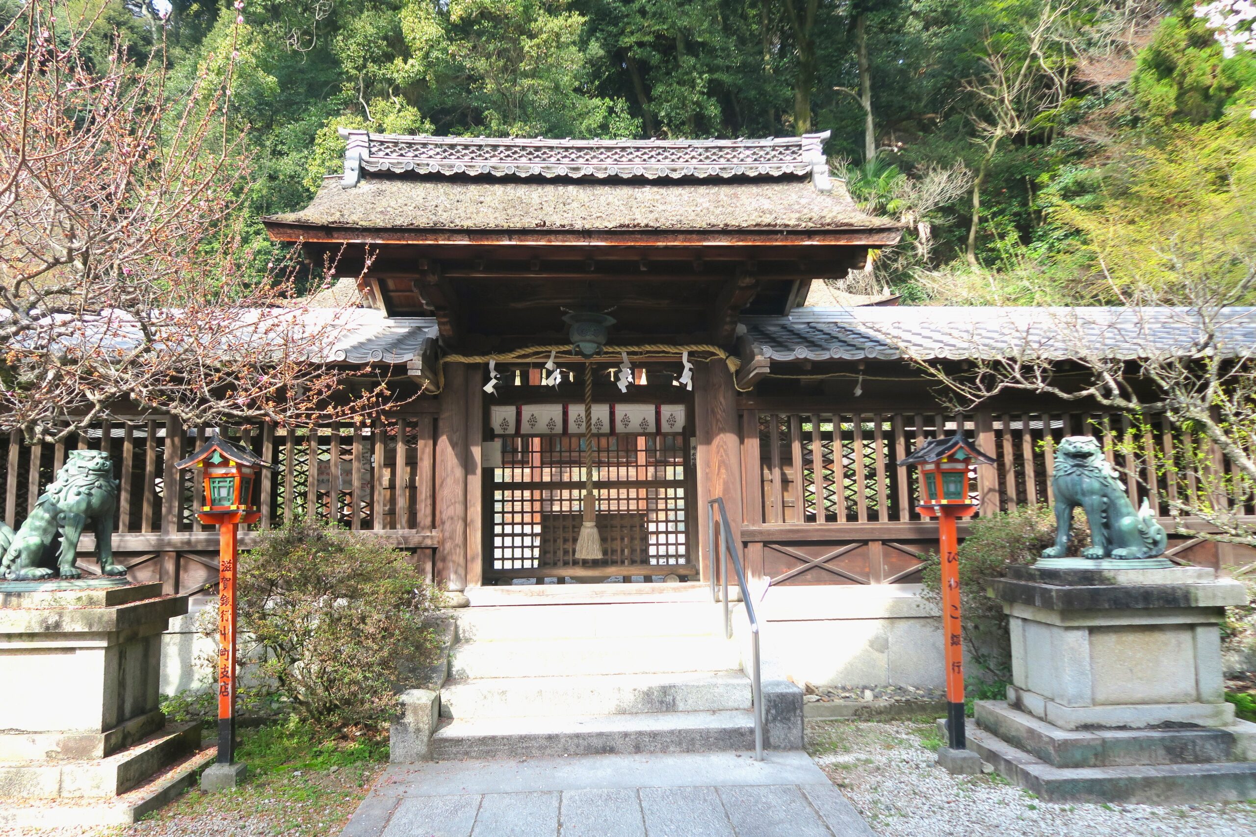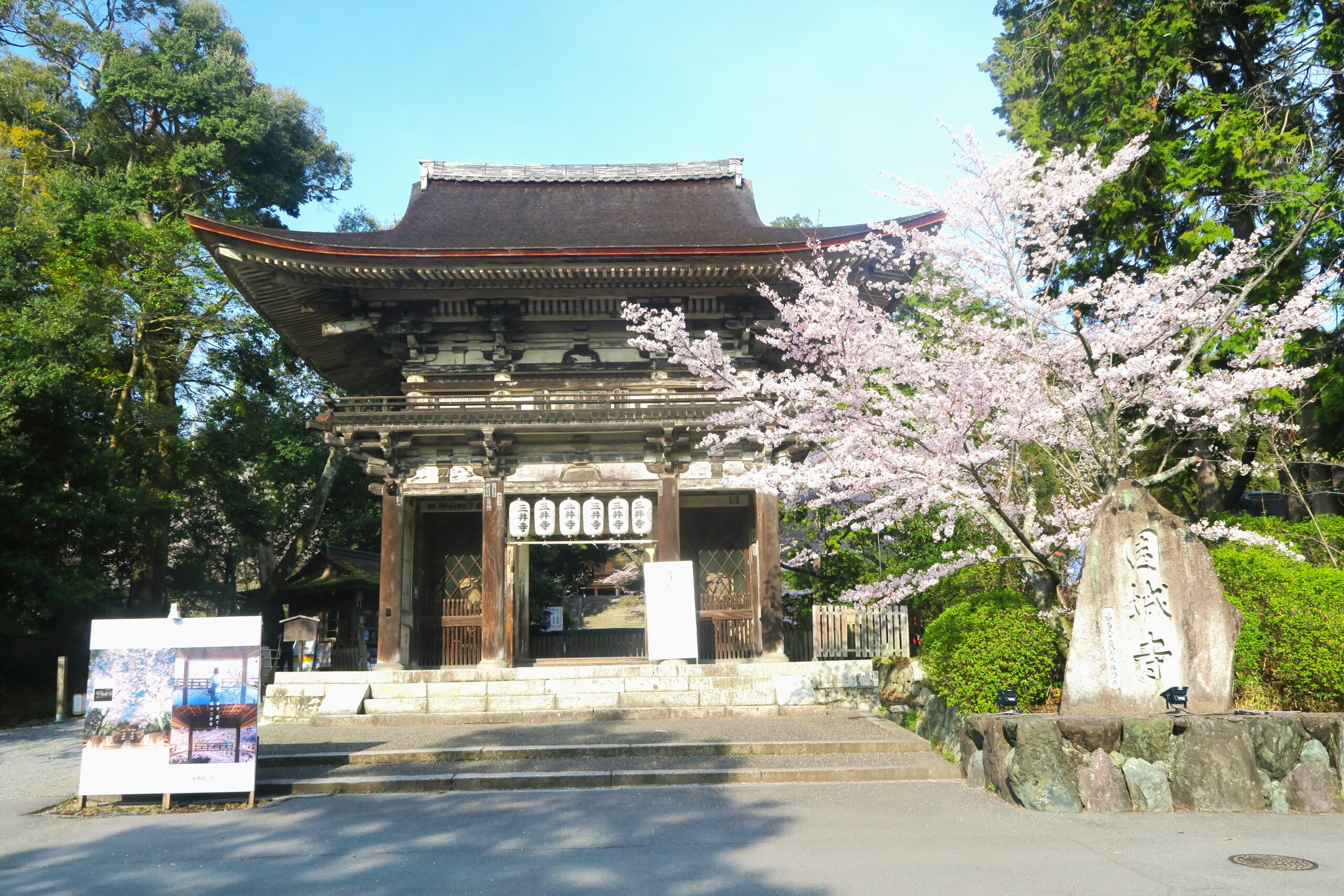 春爛漫の三井寺大門(重文)。三井寺の表門で、三間一戸、檜皮葺の楼門です。もとは甲賀(現湖南市)の常楽寺の門で、豊臣秀吉によって伏見城に移築されていましたが、徳川家康によって慶長6年(1601)浄域への表門として寄進されました。宝徳4年(1452)の建築になり、蟇股の彫刻や組物に室町時代の特色を示しています。門の両脇には康正3年(1457)に制作された金剛力士像が安置され、1300年余の歴史をもつ浄刹の表門としてふさわしい風格を備えています。