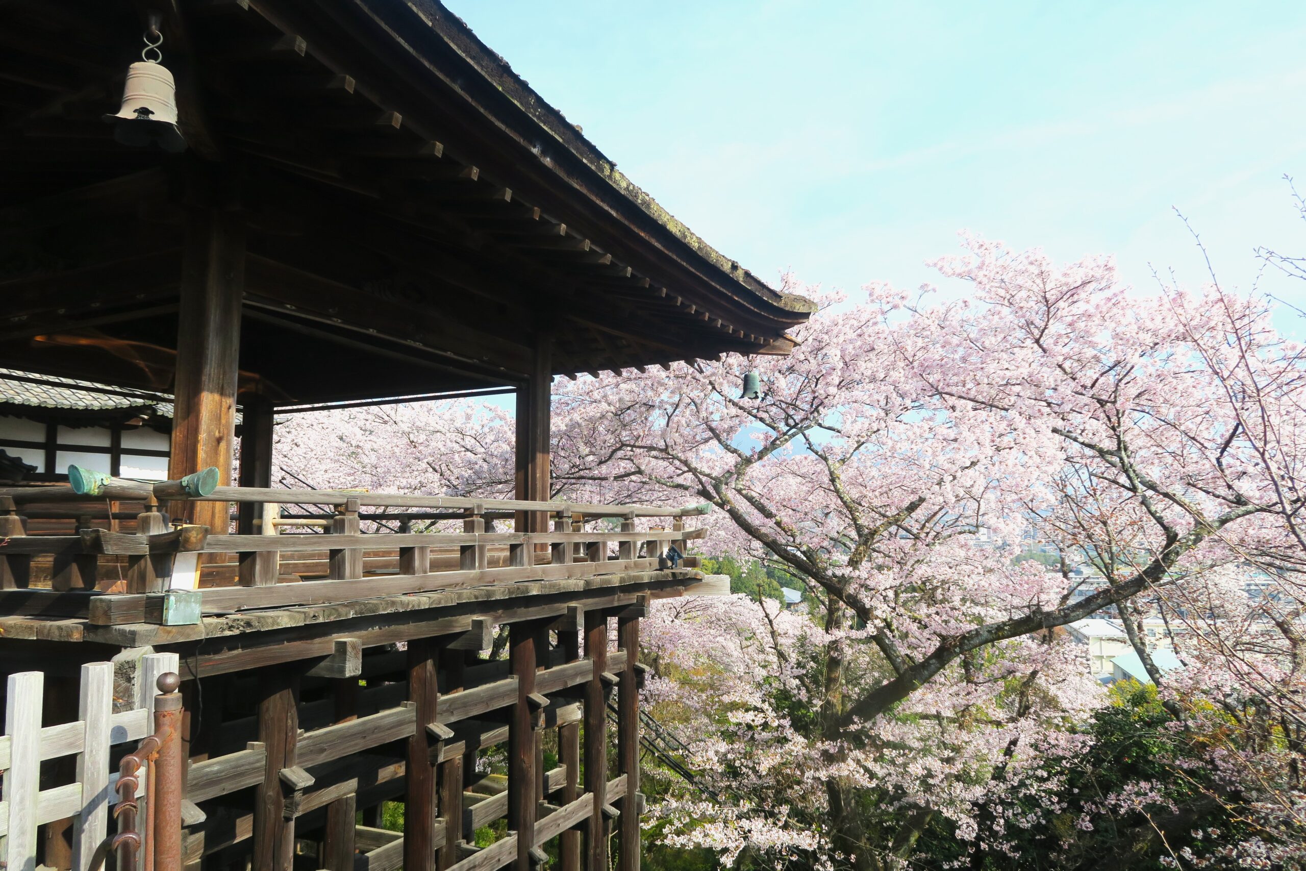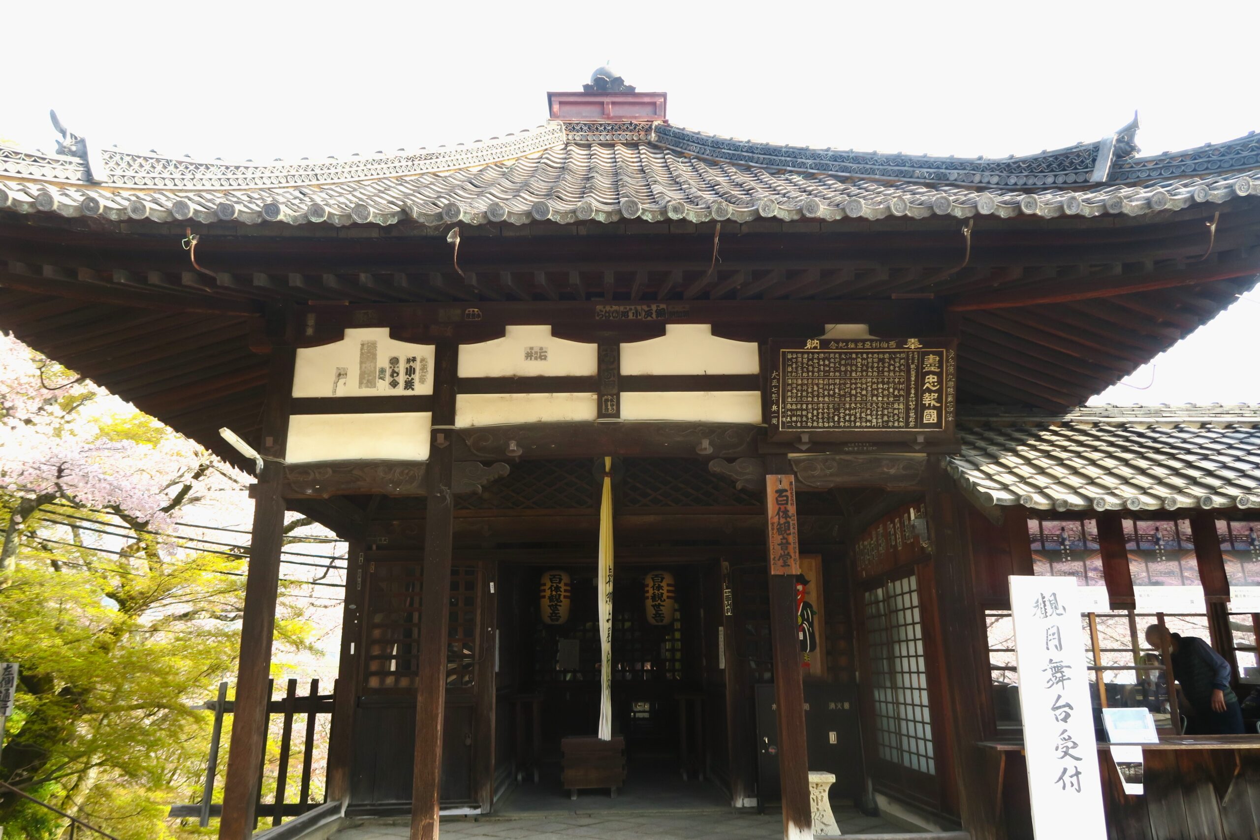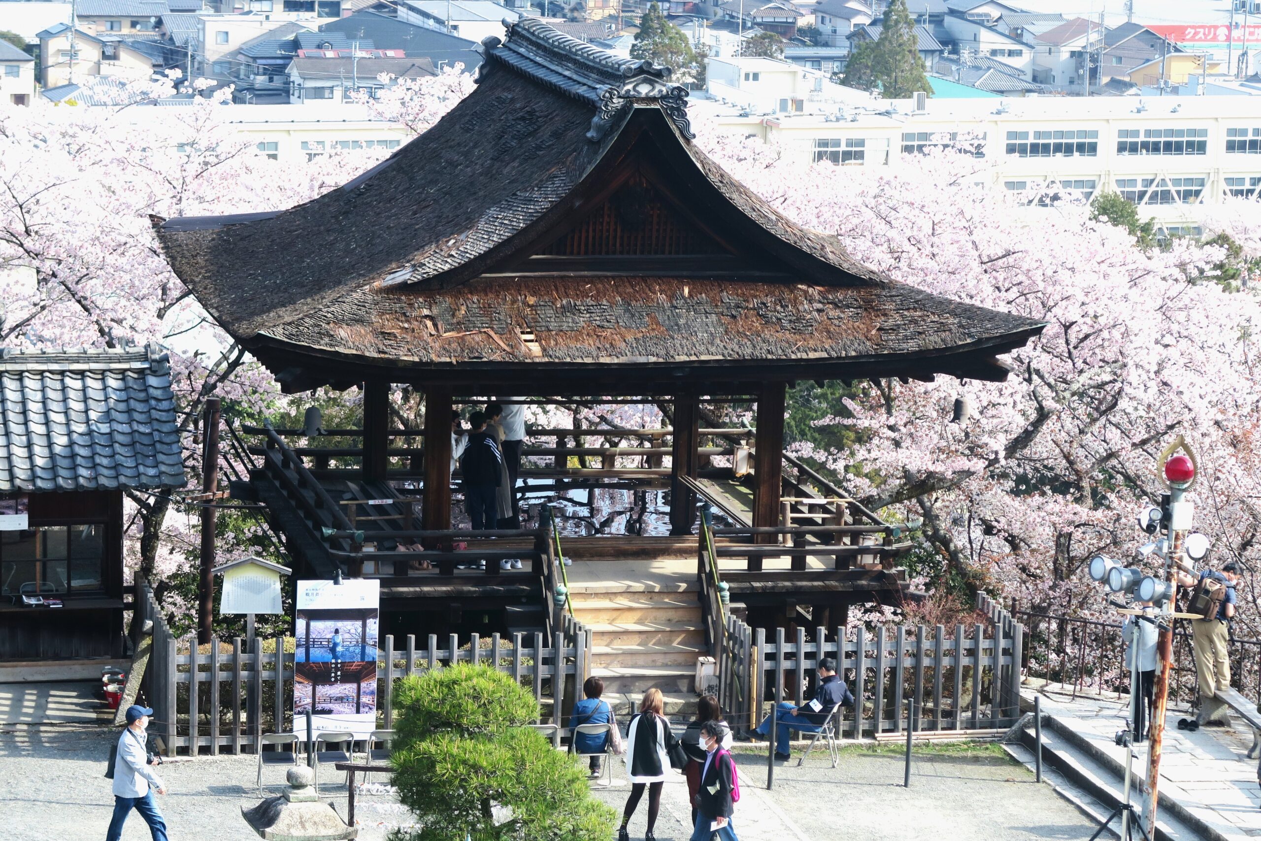 札所伽藍の一つ観月舞台は嘉永3年(1849)の建立。有名な能『三井寺』は中秋の名月の三井寺を舞台に親子の再会を描いた名曲です。舞台造の観月舞台には立ち入ることはでませんが、観音堂の前に広場があり、舞台の奥に広がる桜景色を眼下に鑑賞することができました。