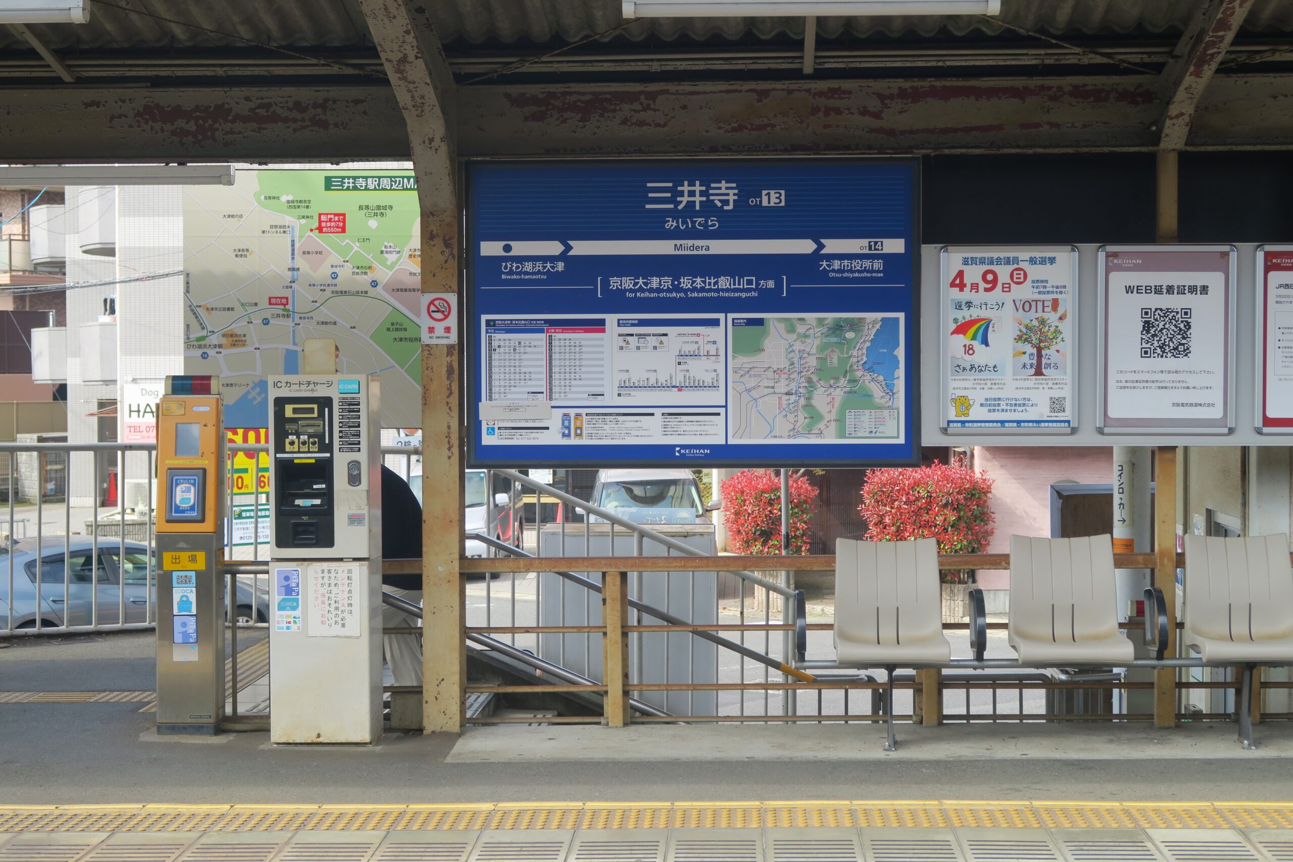 三井寺駅から路面電車に乗って終点・石山寺駅に向かいます。大津の歴史探訪には、京阪電車の乗り降り自由の一日乗車券「古都湖都・おおつ1dayきっぷ」(500円)を使うと便利です。