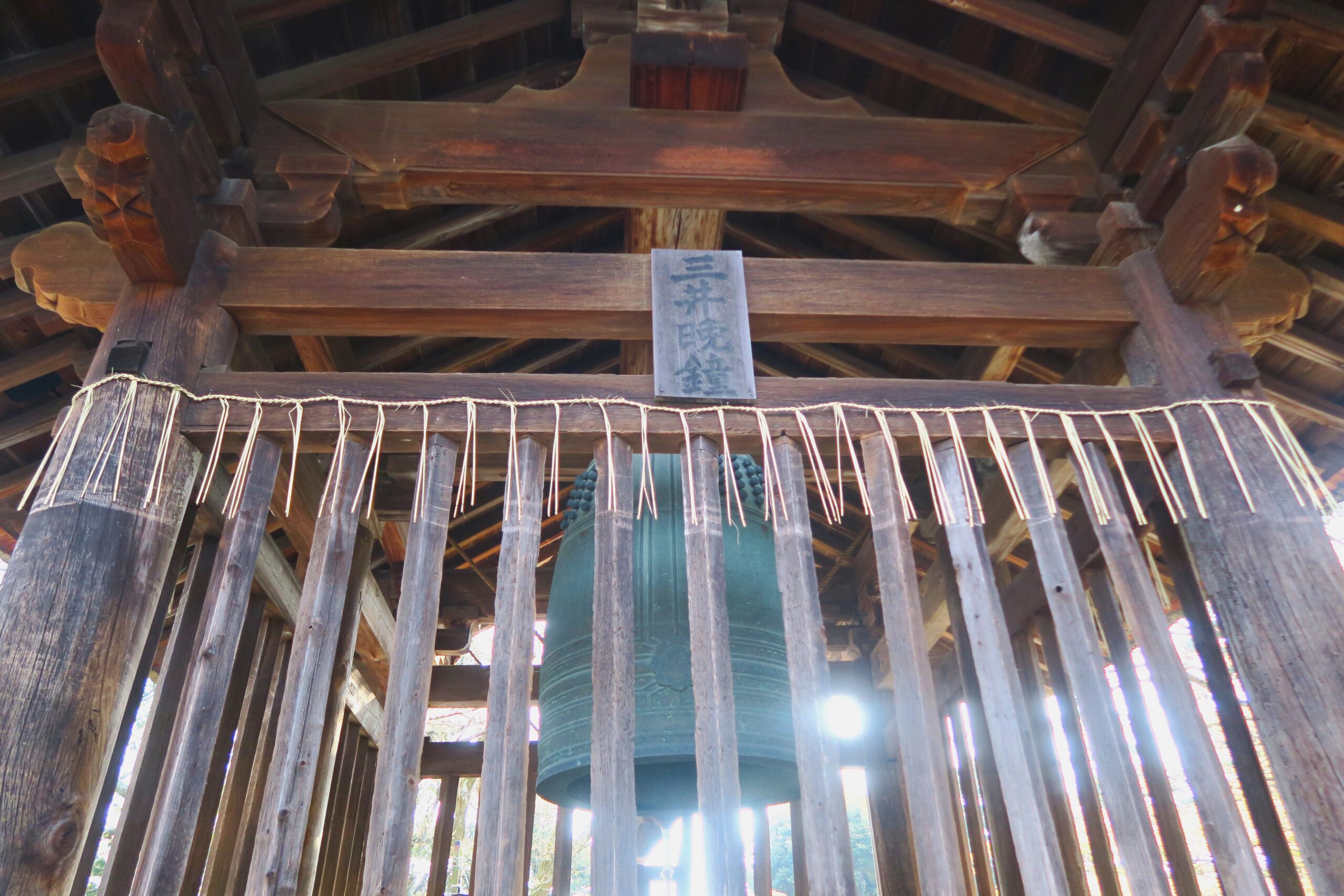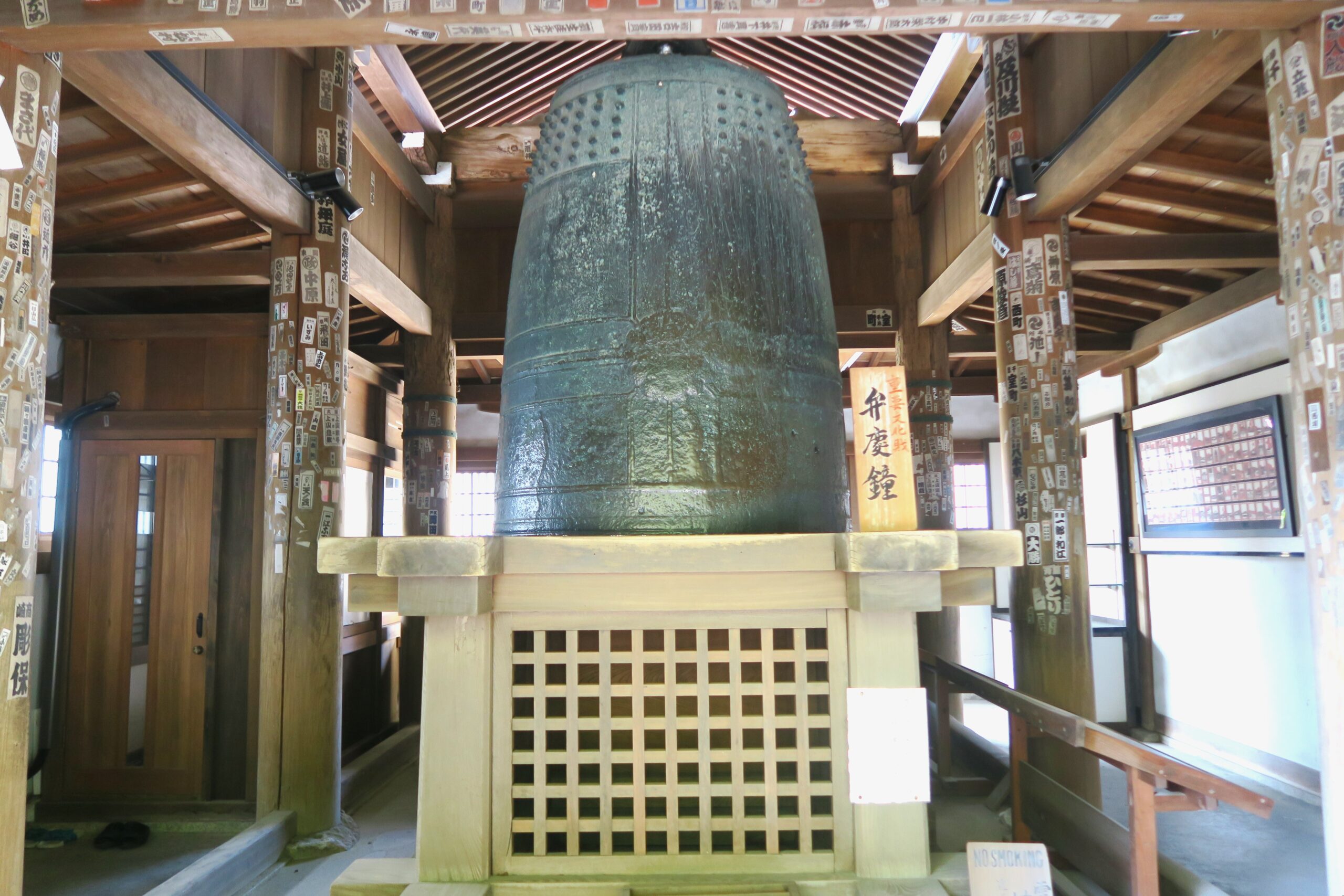 目当ての梵鐘は金堂の南東に建つ桃山様式で切妻造り、檜皮葺の鐘楼(重文)に吊るされています。高さ208cm、口径124cm、重さ2.25トン。撞木が当たる撞座の意匠は蓮華文で鋳造は慶長7年(1602)とあり、広重が描いた「三井晩鐘」と変わらぬ鐘です。今も大津市街にその音を響かせています。冥加良800円で鐘を一回撞くことができます。