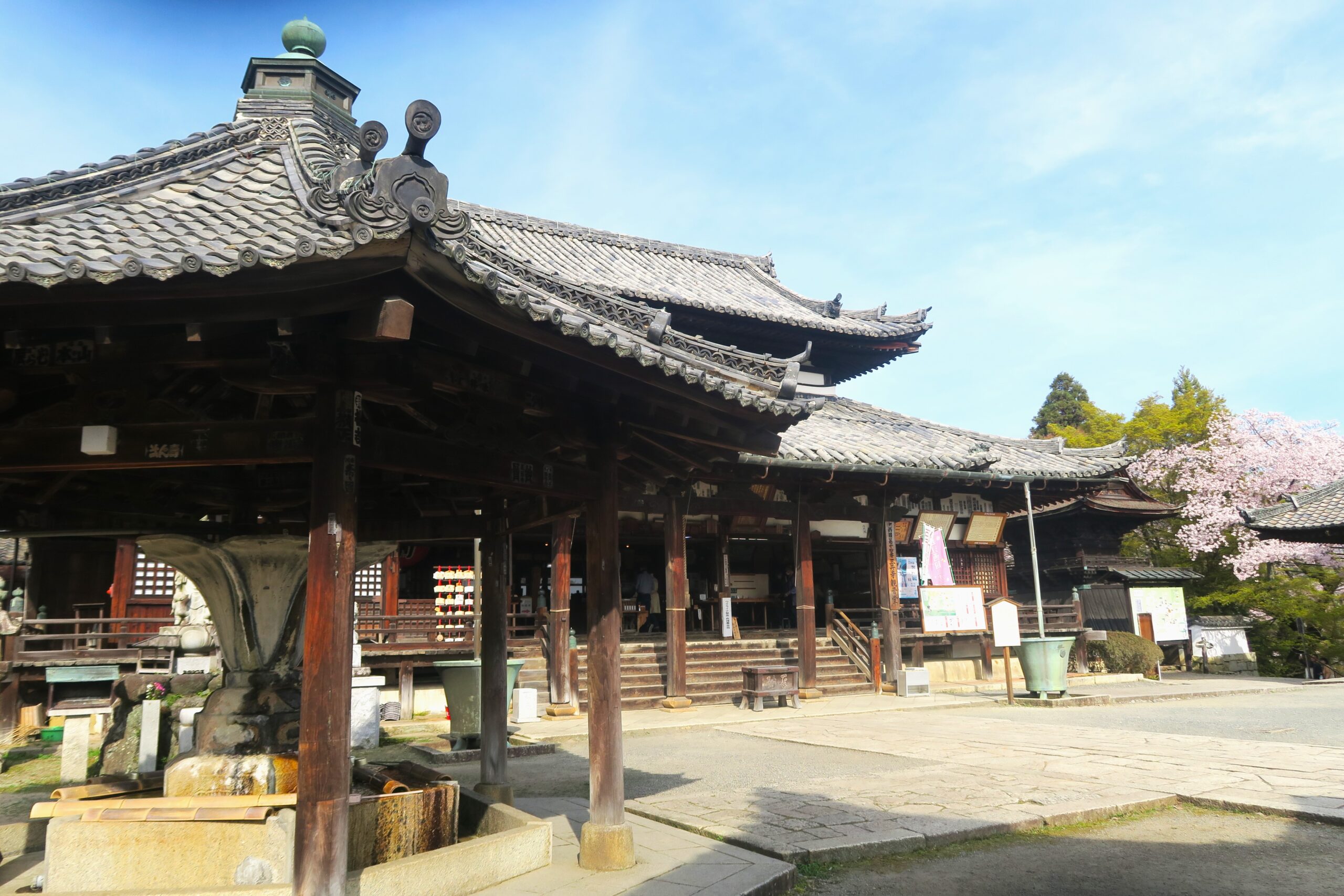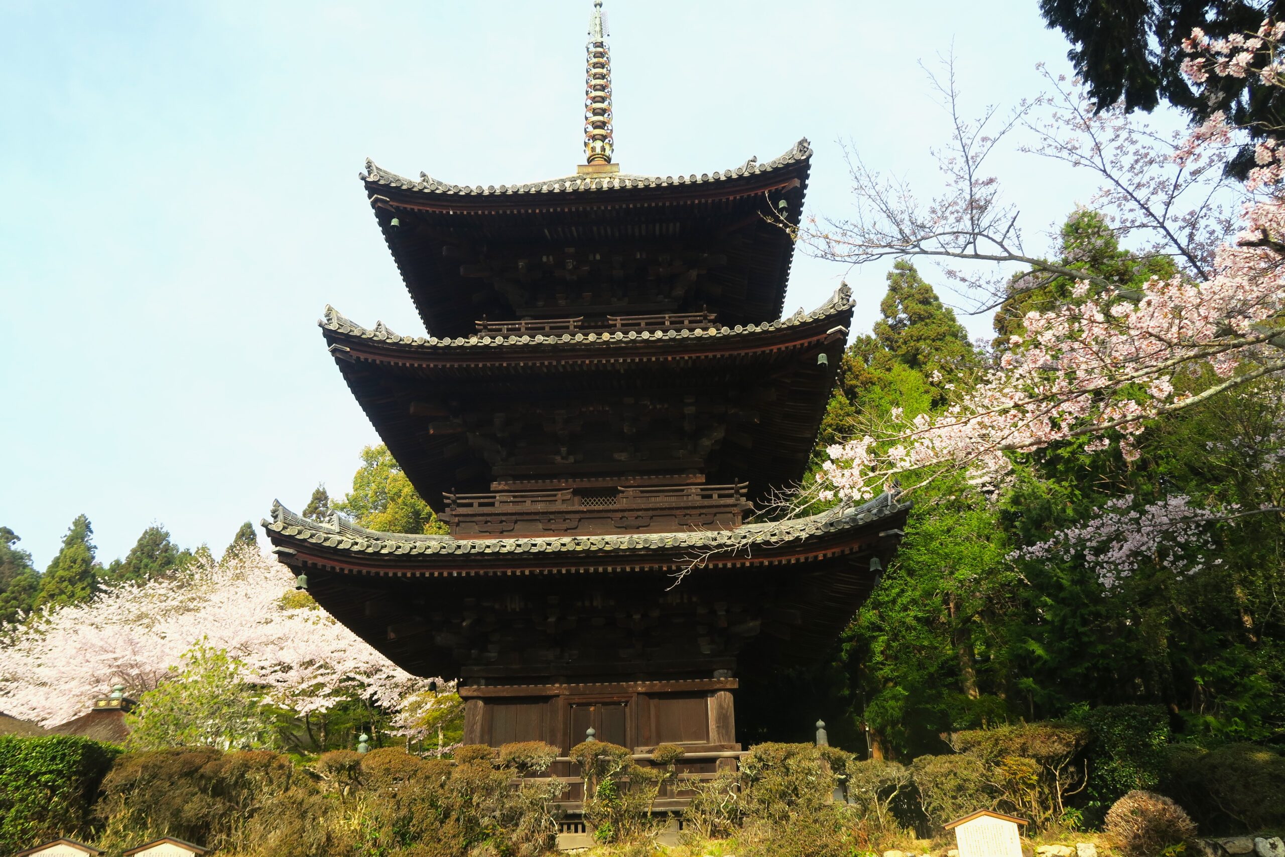 仁王門をくぐると境内は広く、ソメイヨシノや山桜、枝垂れ桜など約2000本の桜が迎えてくれます。桃山時代の名建築・金堂や三重塔など数ある重要文化財や国宝の建造物が、桜景色と重なり合うようにして美観を描き出し、実に見ごたえがあります。順路に従って拝観していくのですが桜のビュースポットが随所に現れ、目を楽しませてくれます。