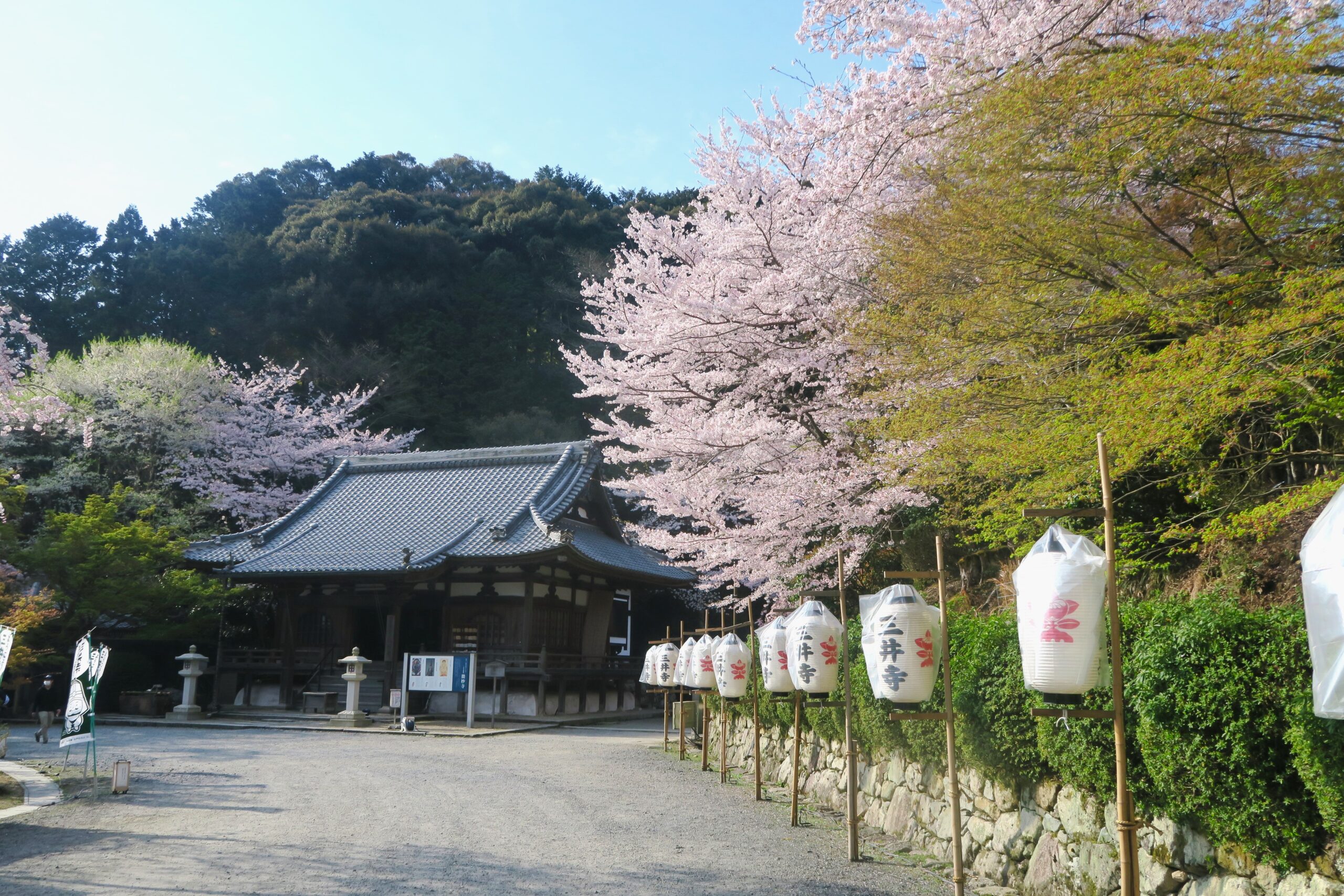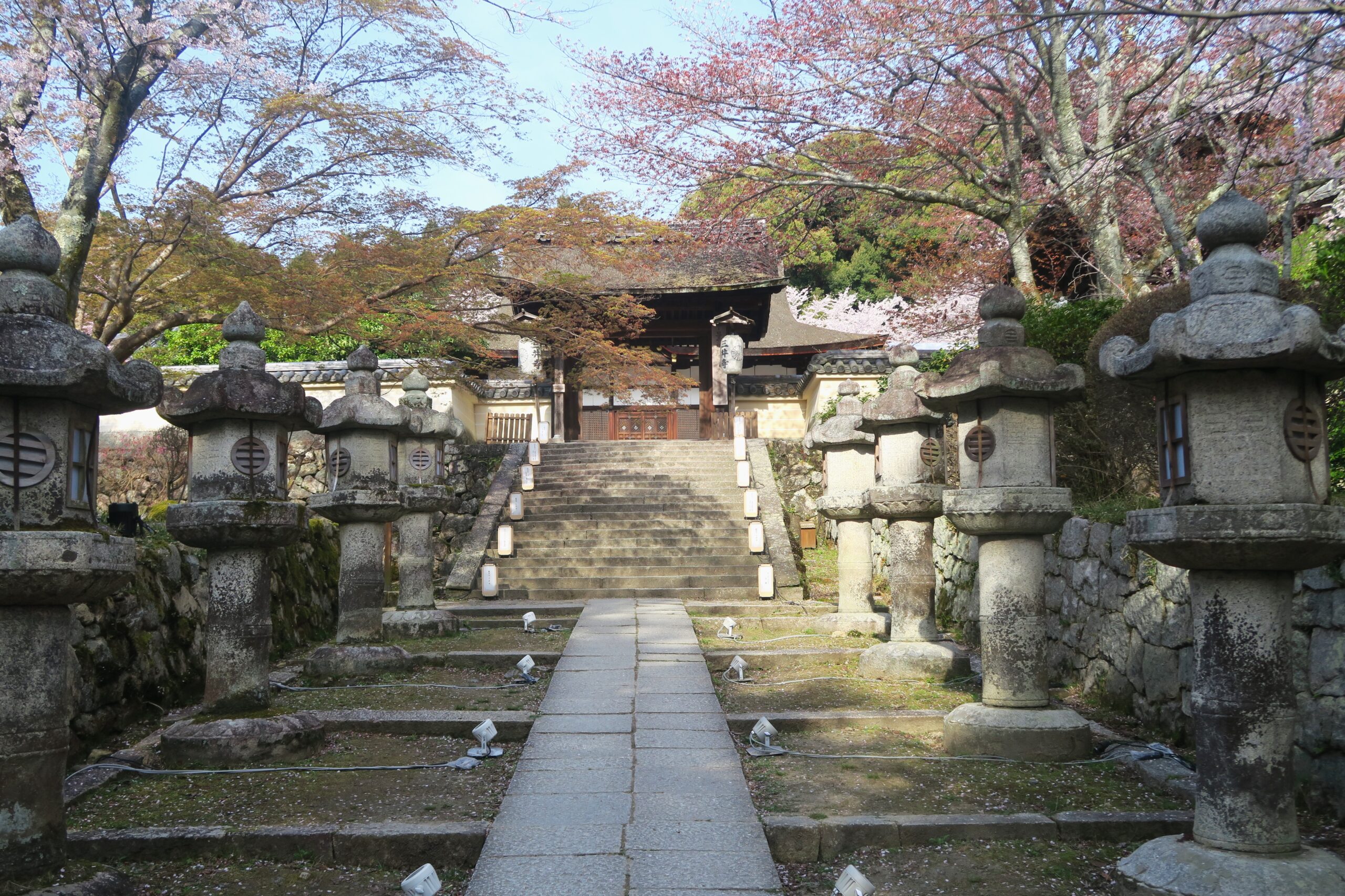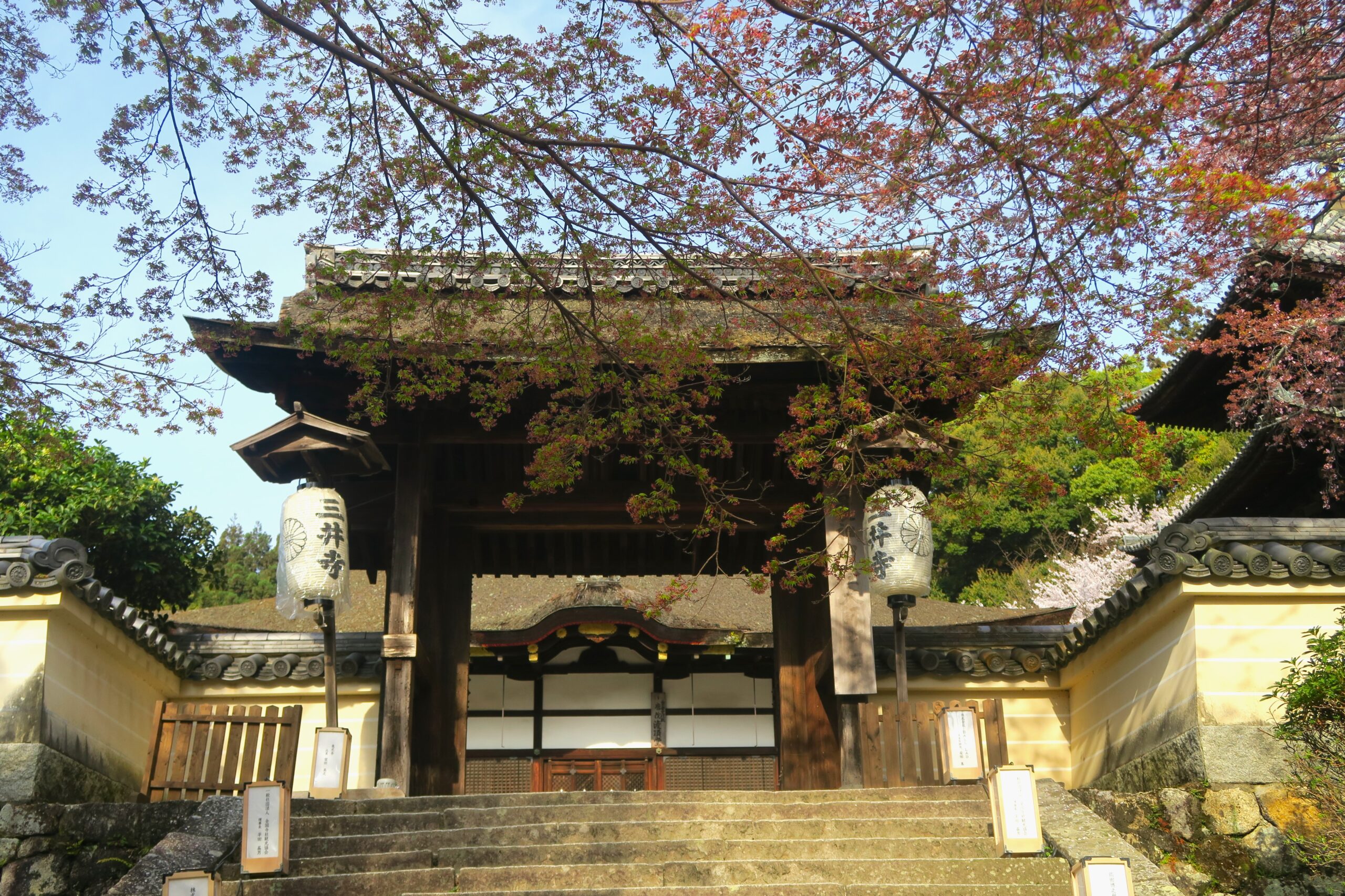 勧学院の美しい石垣の築地塀に三井寺の提灯がずらりと並び、その提灯を覆うように桜が枝を伸ばして咲いている参道をすすむと「微妙寺」突き当ります。三井寺の五別所のひとつとして994に創建。本尊は十一面観音。現在は湖国十一面観音霊場の第一番札所となっています。