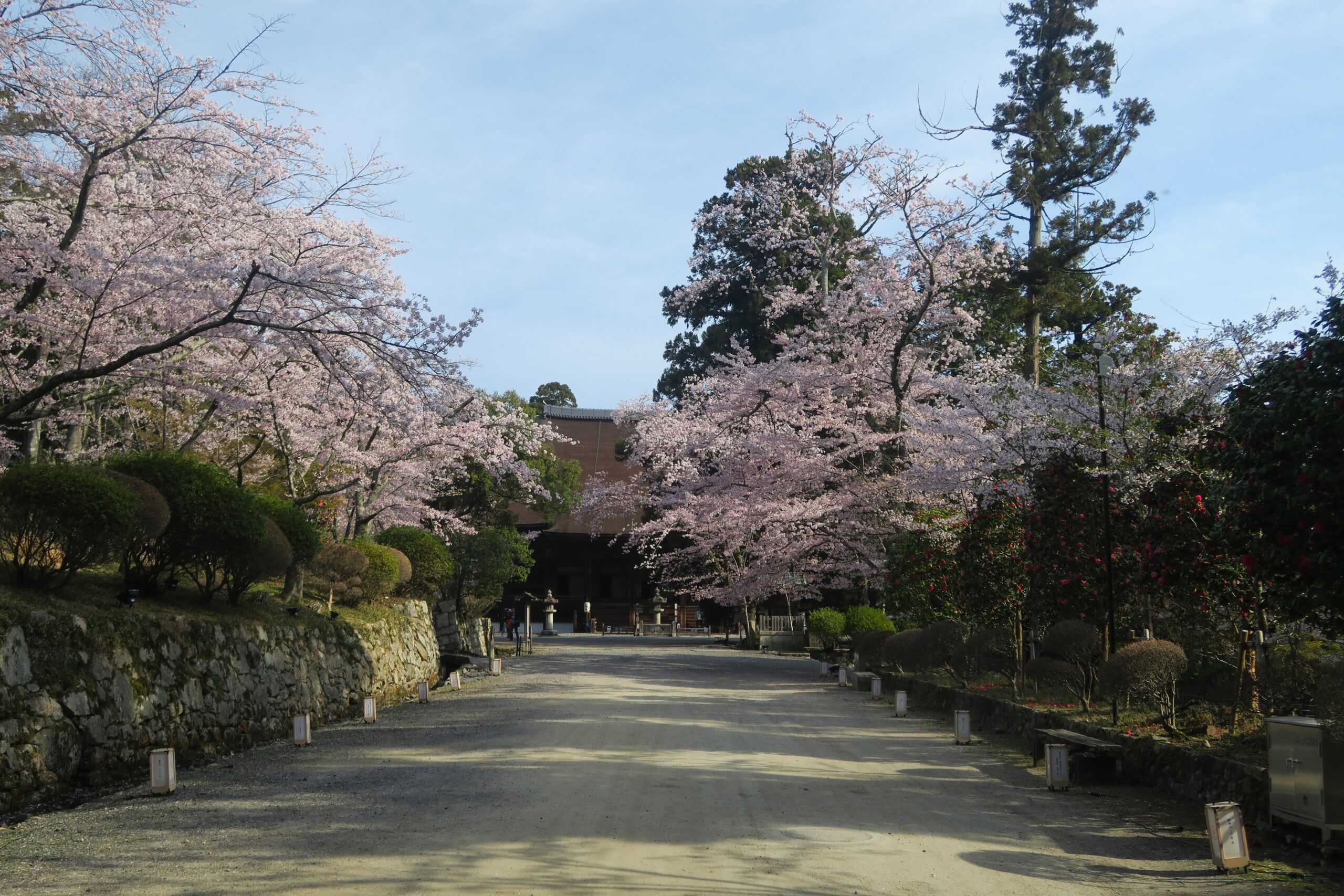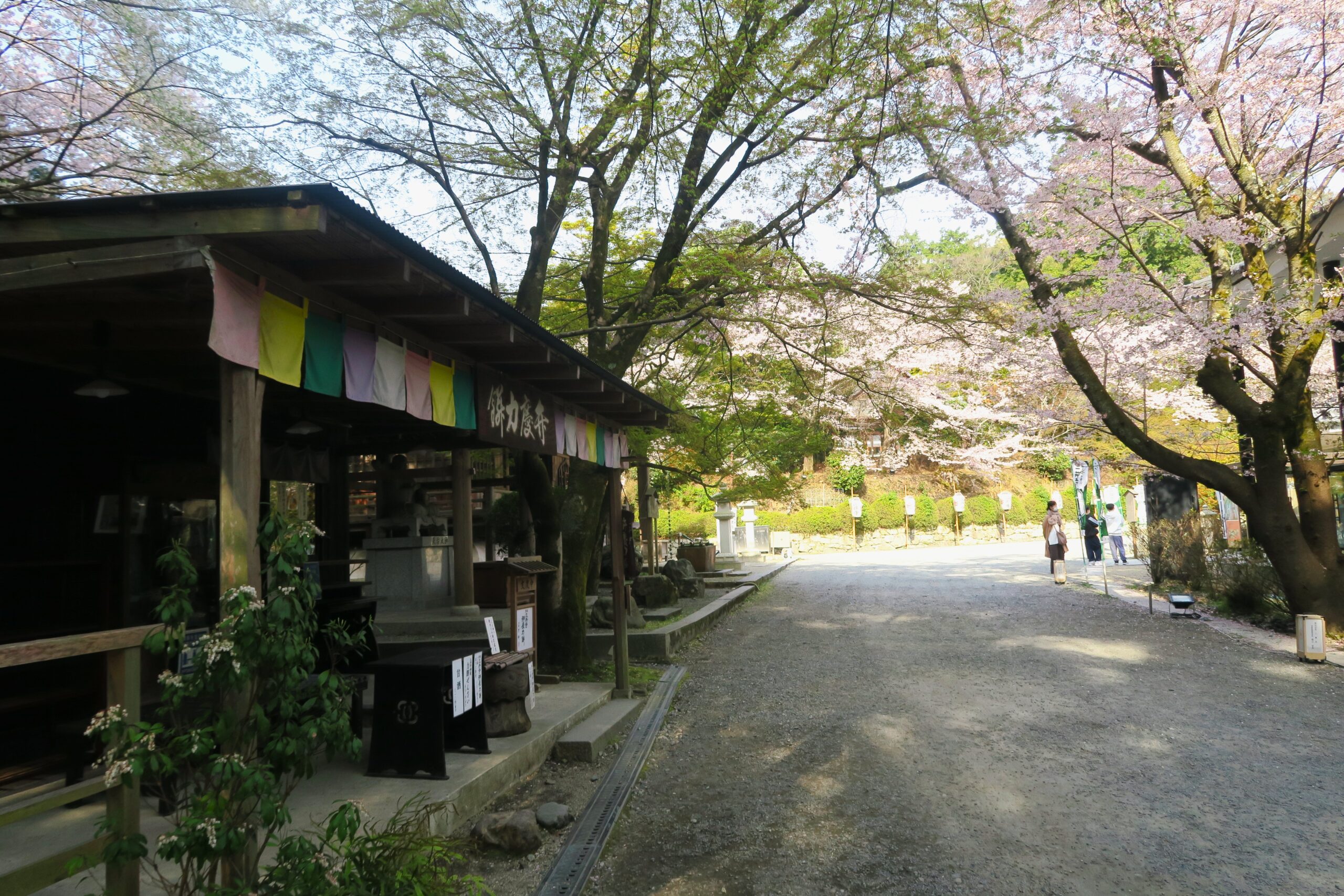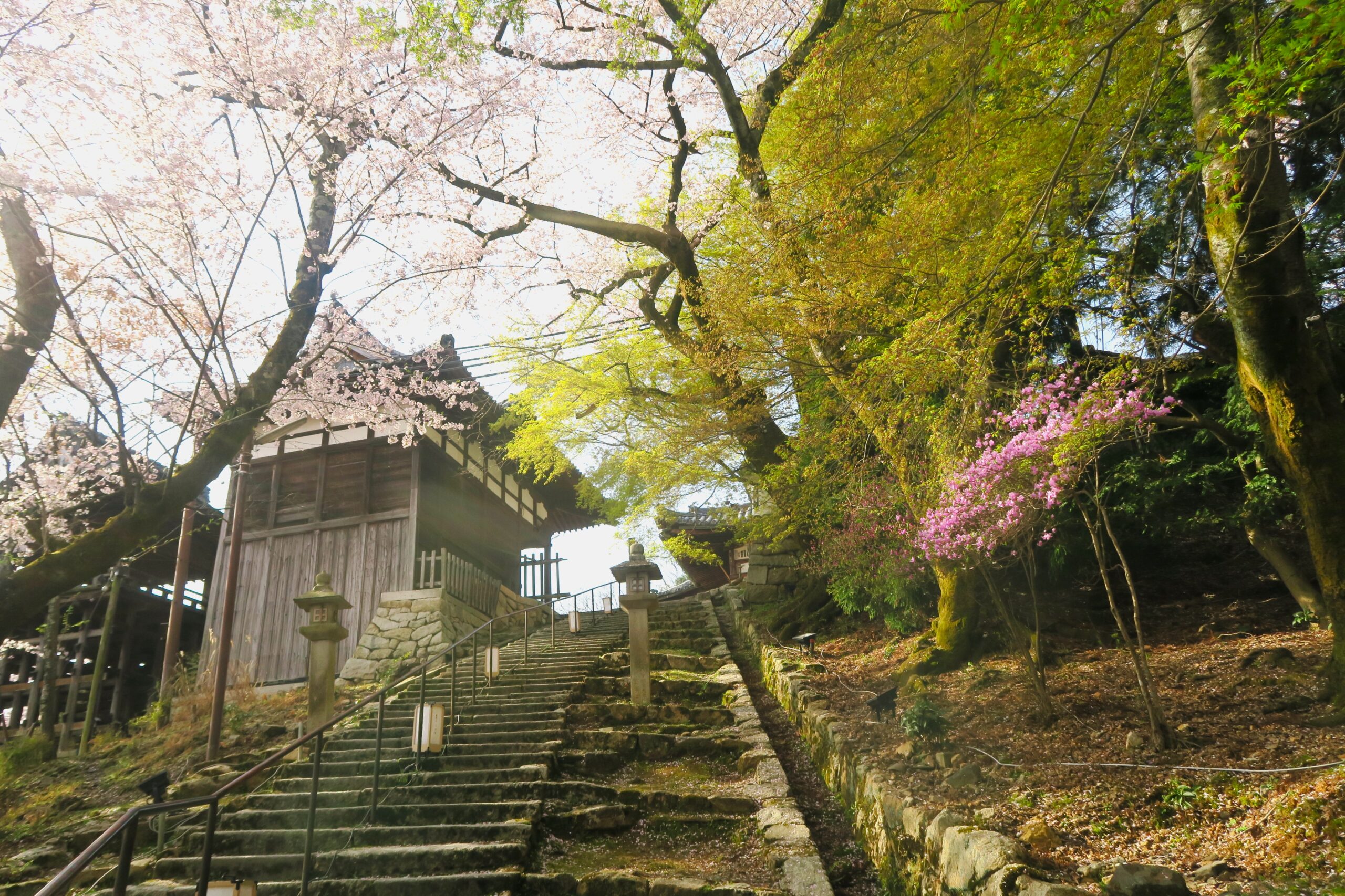 参道の途中にも見上げれば桜のトンネルが続きます。山の中腹に観音堂があるため、かなりの石段の数を上っていきます。