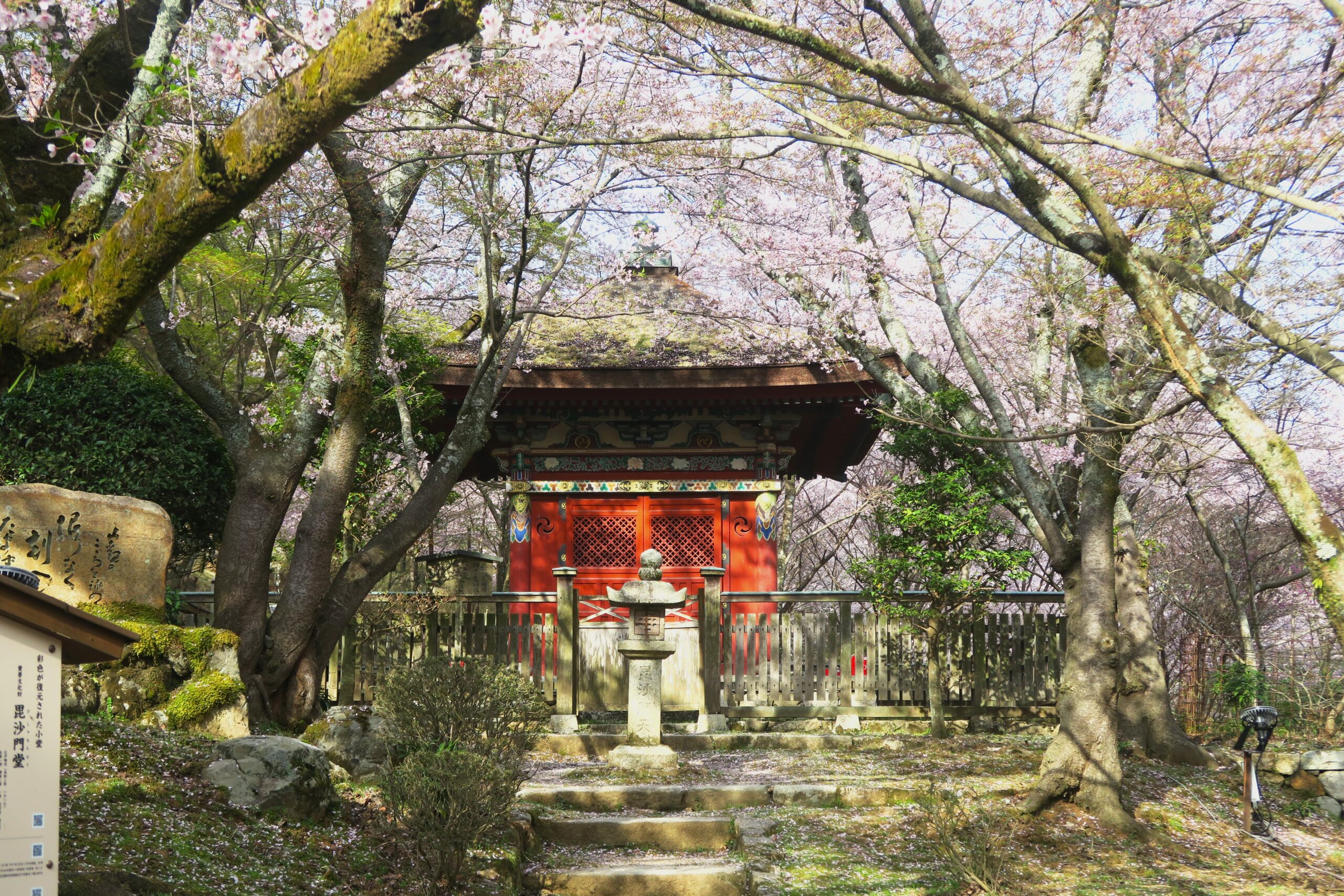 桜の名所でもある敷地内の西国三十三観音霊場の十四番札所観音堂は、境内の南の端にあり、山内でも一番眺望のよいところ。元和2年(1689)に三井寺五別所のひとつ尾蔵寺の南勝坊境内に建立され、昭和31年(1956)に解体修理にともない現在地に移築された極採色の小堂、毘沙門堂から上っていきます。