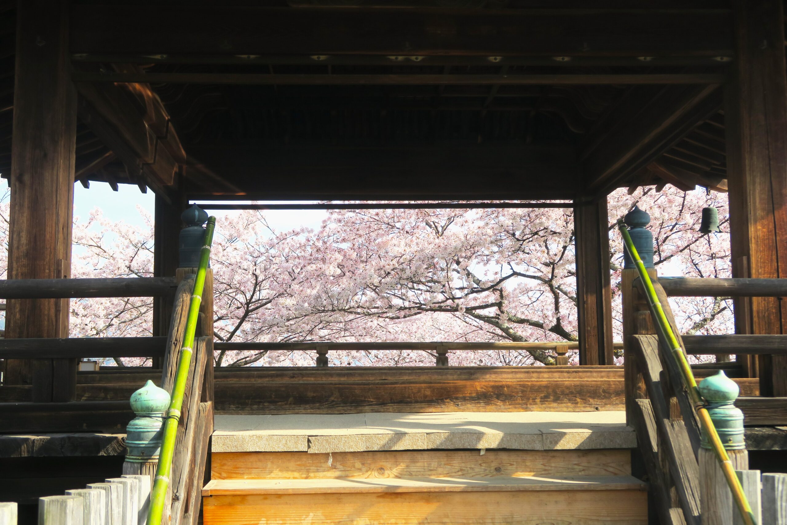 観月舞台では春の勅別公開“5分間の貸切拝観”と銘打ち、この桜の景色が舞台の床に映り込むリフレクションが楽しめます。※予約制