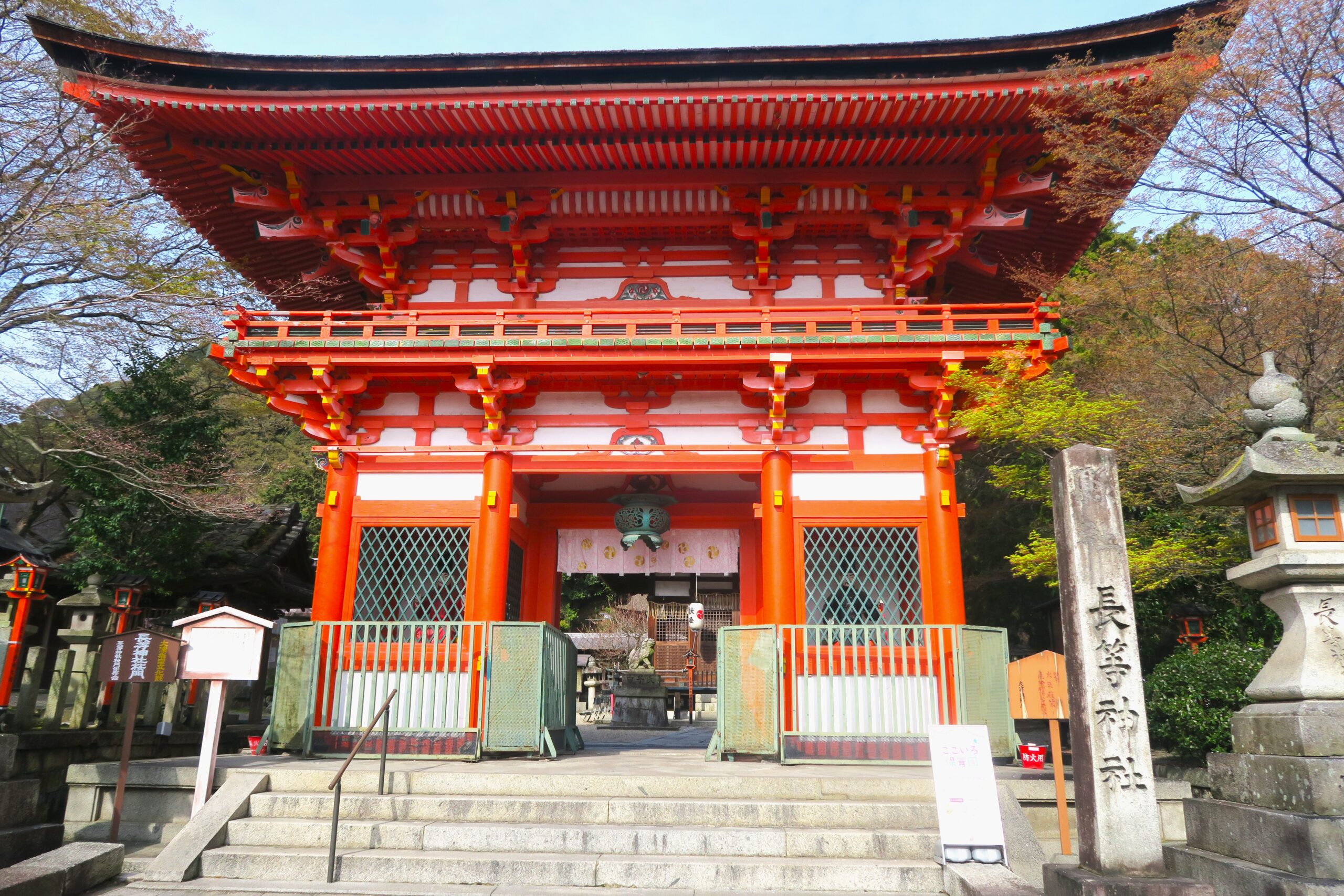 豪華な朱塗りの楼門、全国的のも珍しい五間社流造の本殿、それを取囲む回廊など見所の多い神社です。社殿は南北朝時代の建武3年(1336)に戦乱に巻き込まれて焼失するも暦応3年(1340)に足利尊氏によって再建されます。