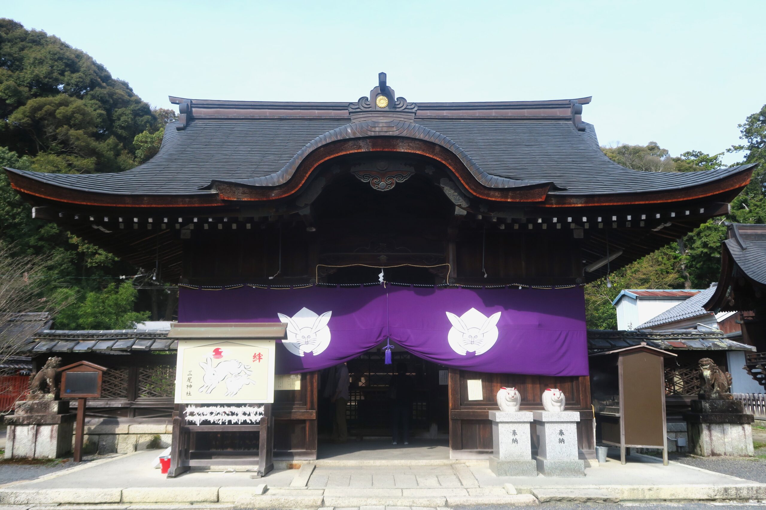 創建は貞観元年(859)。三尾明神を園城寺の円珍によって赤尾神が現れた園城寺の境内の西方、琴尾谷に園城寺の鎮守として祀ることとし社殿が建立されました。その後北院の鎮守は新羅社(現・新羅善神堂)、南院の鎮守は三尾社となりました。明治時代の神仏分離から三尾社は明治9年(1876)に社地を園城寺境内から白尾神ゆかりの現在地に移し本殿なども移築し、三尾神社として独立しました。室町時代、応永33年(1426)に足利義時が現在の本殿を再建し、慶長年間に豊臣秀吉が社殿の修理を加えさせたと伝わります。拝殿の右側には「めおと卯」と名付けられたなんとも可愛らしい二羽のうさぎが奉納されています。