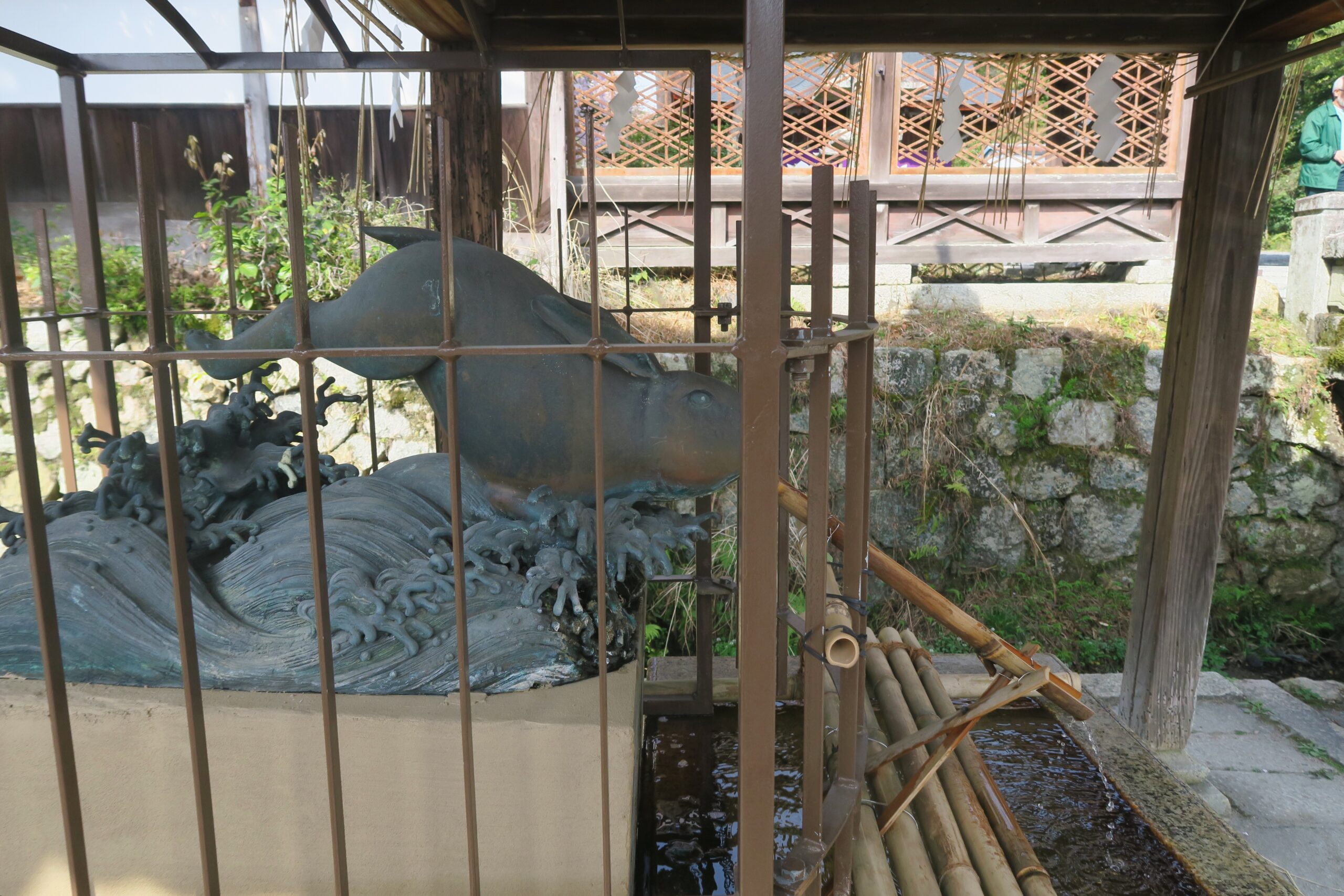 創建時の物語から境内のあちらこちらに石造や彫刻が存在します。門をくぐる手前には波の上に乗って元気に跳ねる手水のウサギ。