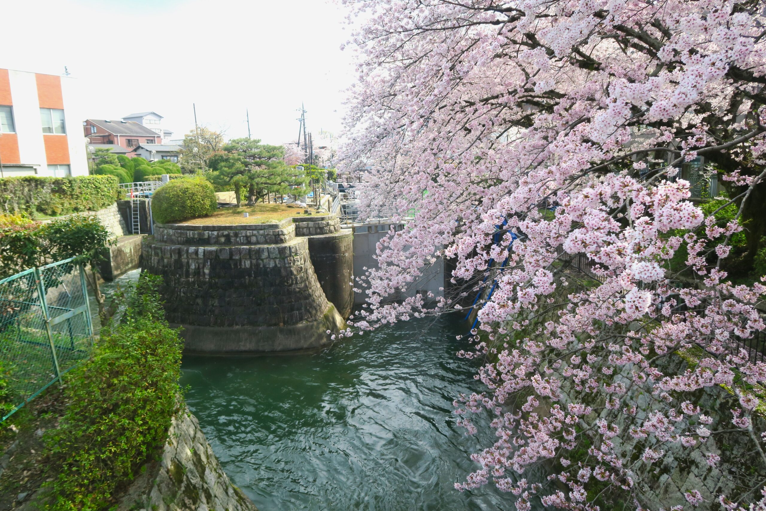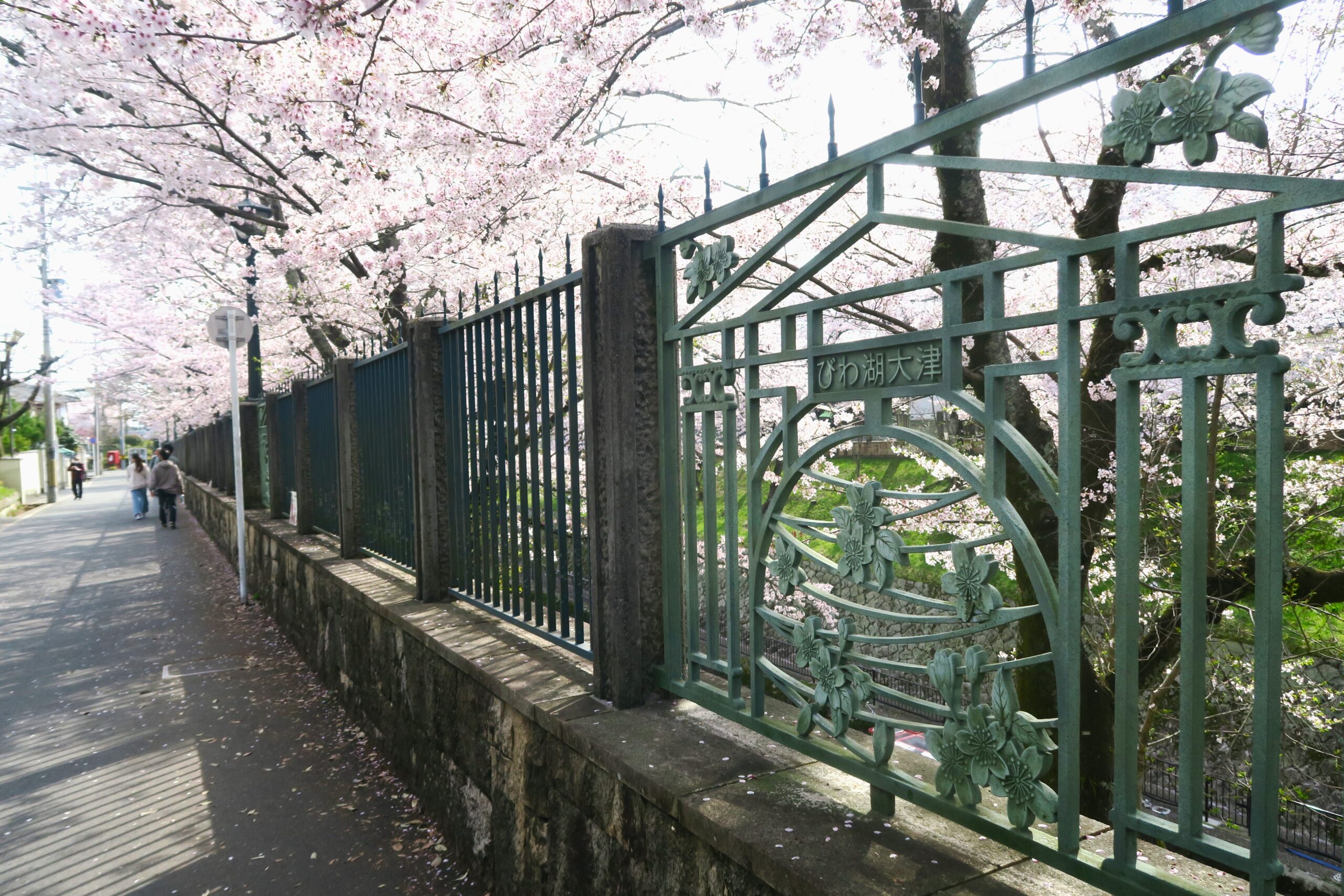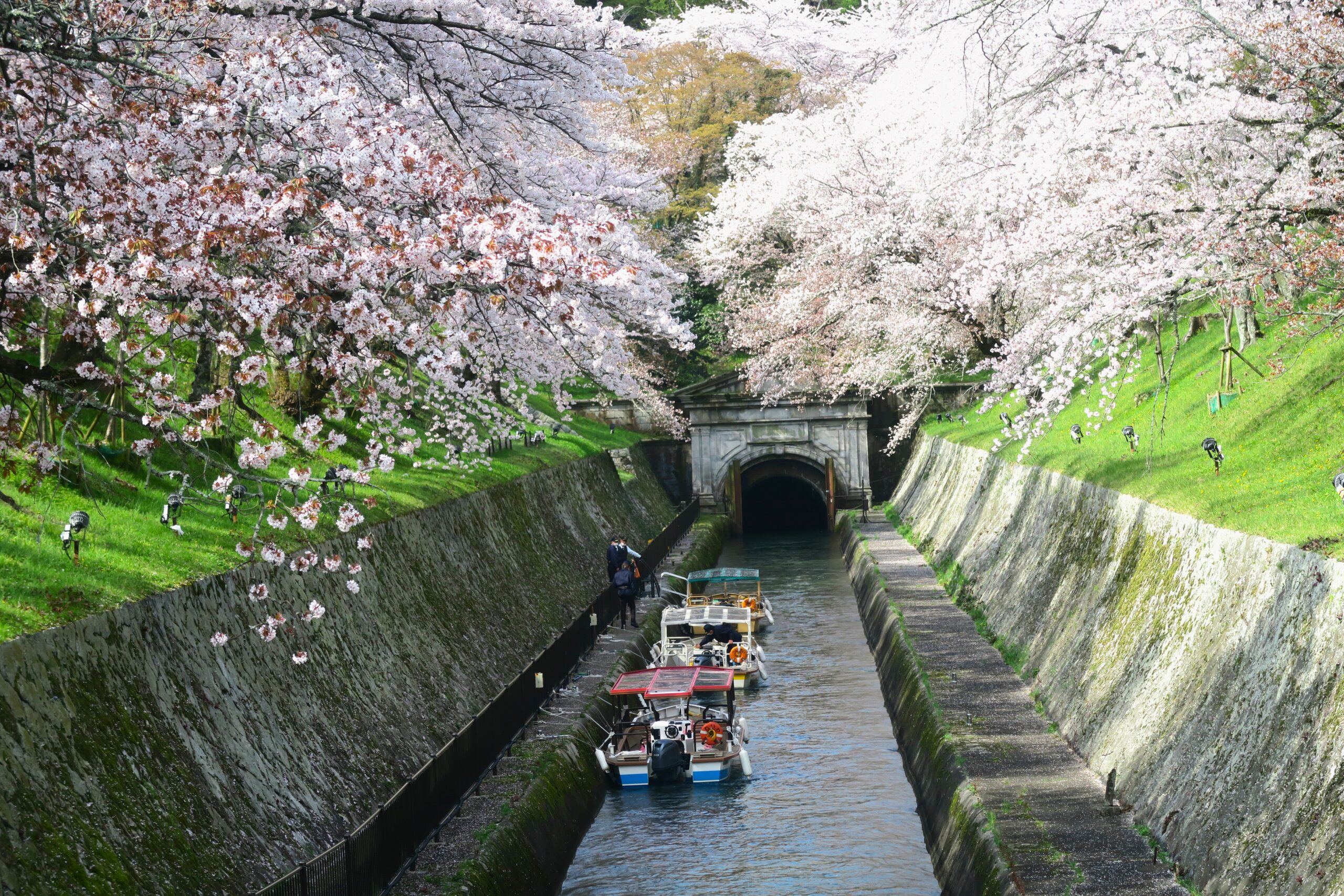 約200本ものソメイヨシノと山桜が両岸を覆う桜並木の美しさ。三井寺へと続く疎水にかかる石橋「鹿関橋」からの眺めは、ひときわあでやかです。奥に第一トンネル水門が見えます。長さが2436mもあり、反対側の出口を抜けると、桜と菜の花の競演が美しい「山科疎水」に続いています。