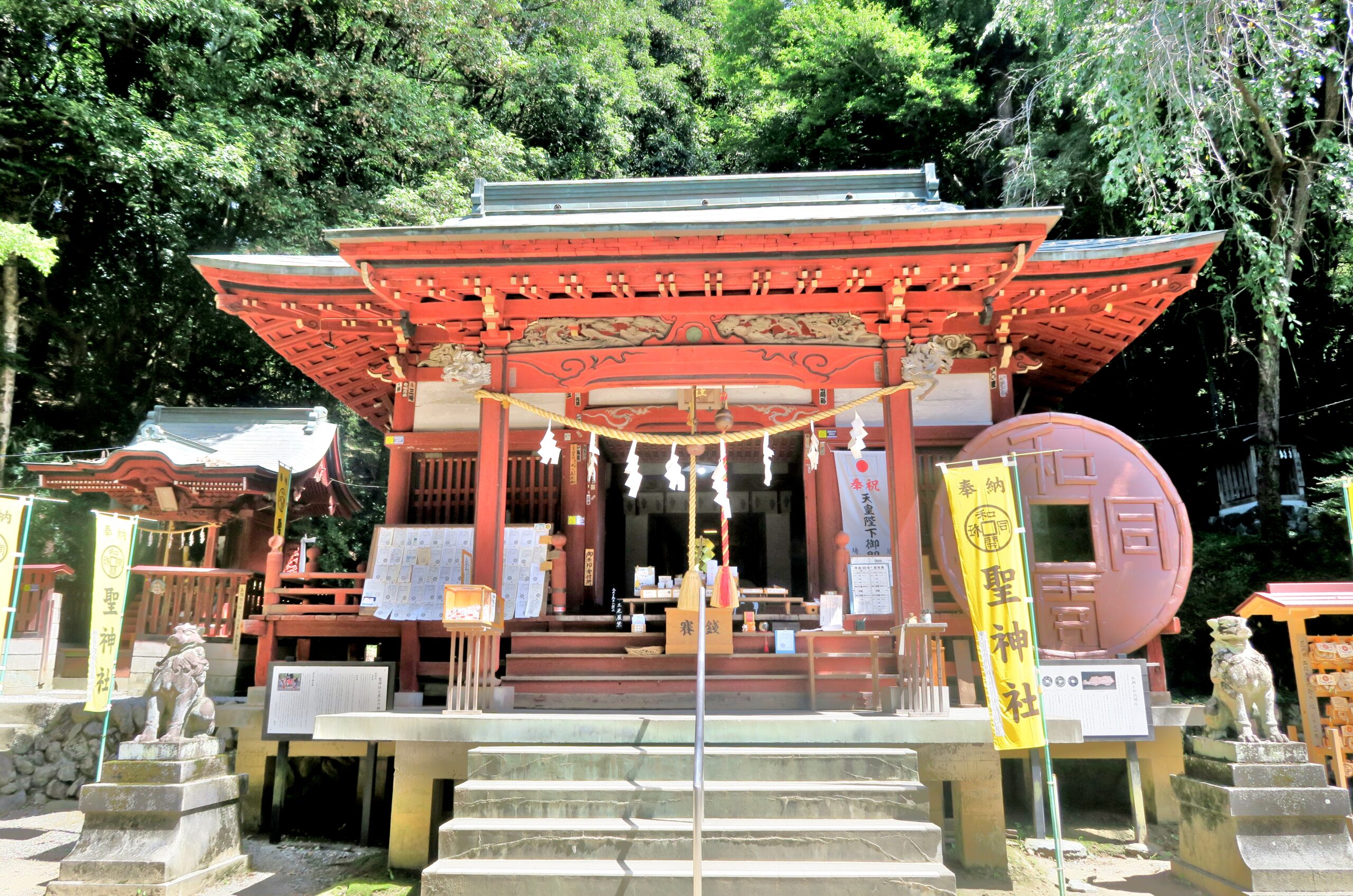この和銅遺跡の近くに和銅開珎のゆかりの神社である銭神様としても有名な「聖神社」があります。朝廷は和銅元年(708)祝典のために勅使を派遣し、和銅沢上流の「祝山」に自然銅をご神体として金山彦命を祀っていたお宮を、祝山から銅洗堀を隔てて、蓑山を背にした清浄の地である今の地に移し「聖神社」と称して創建されたのが同年の2月13日でしたのでゆうに1300年以上の歴史があります。和銅石13個をご神宝として祀り、また和銅開珎ゆかりの神社ということもあり金運アップのご利益があるとされています。