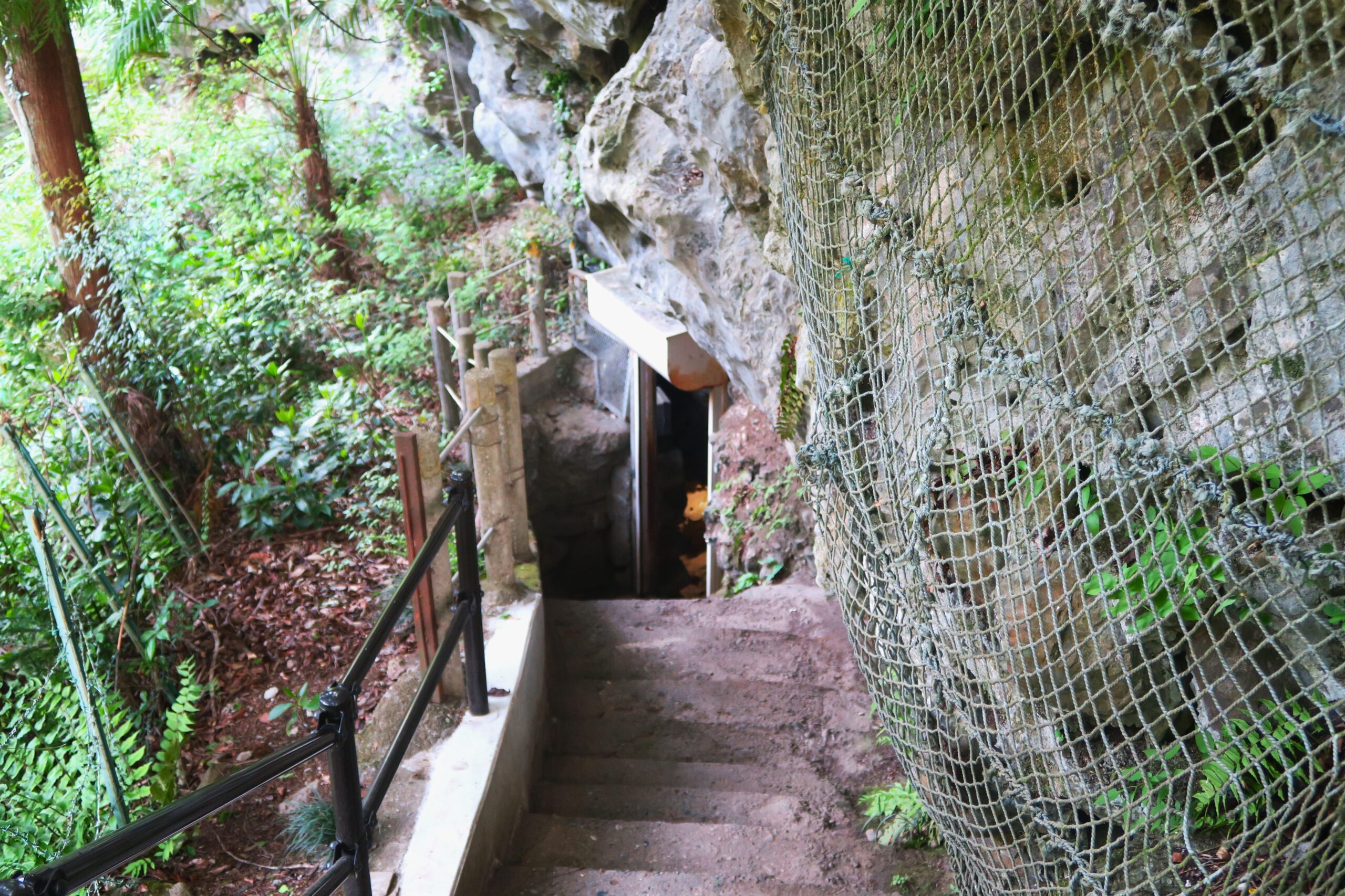 洞内に入るとひんやりとした空気が身体を包みます。全長140m、3分の2が竪穴型で高低差約33m、坑道は迷路のように曲がりくねっています。天井が低いところもあれば、はしごを上る所もあり、通路は狭くなかなかハードな探索になります。鍾乳石、石柱、石筍などが見られる洞内は広くはないが、その分、この自然の造形が昔から「胎内くぐり」の霊場として信仰されてきたことを実感できます。「弘法大師の後姿」「上り龍の背」「下り龍の頭」などと名付けられた鍾乳石が見ものですが、洞内は撮影禁止とのことで残念です。