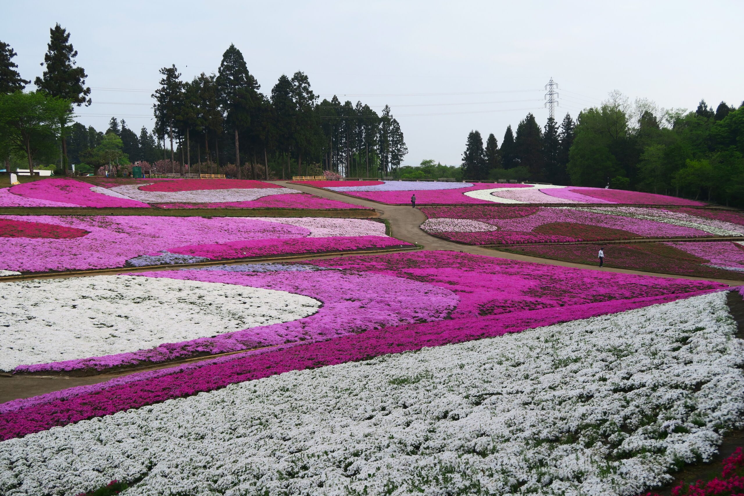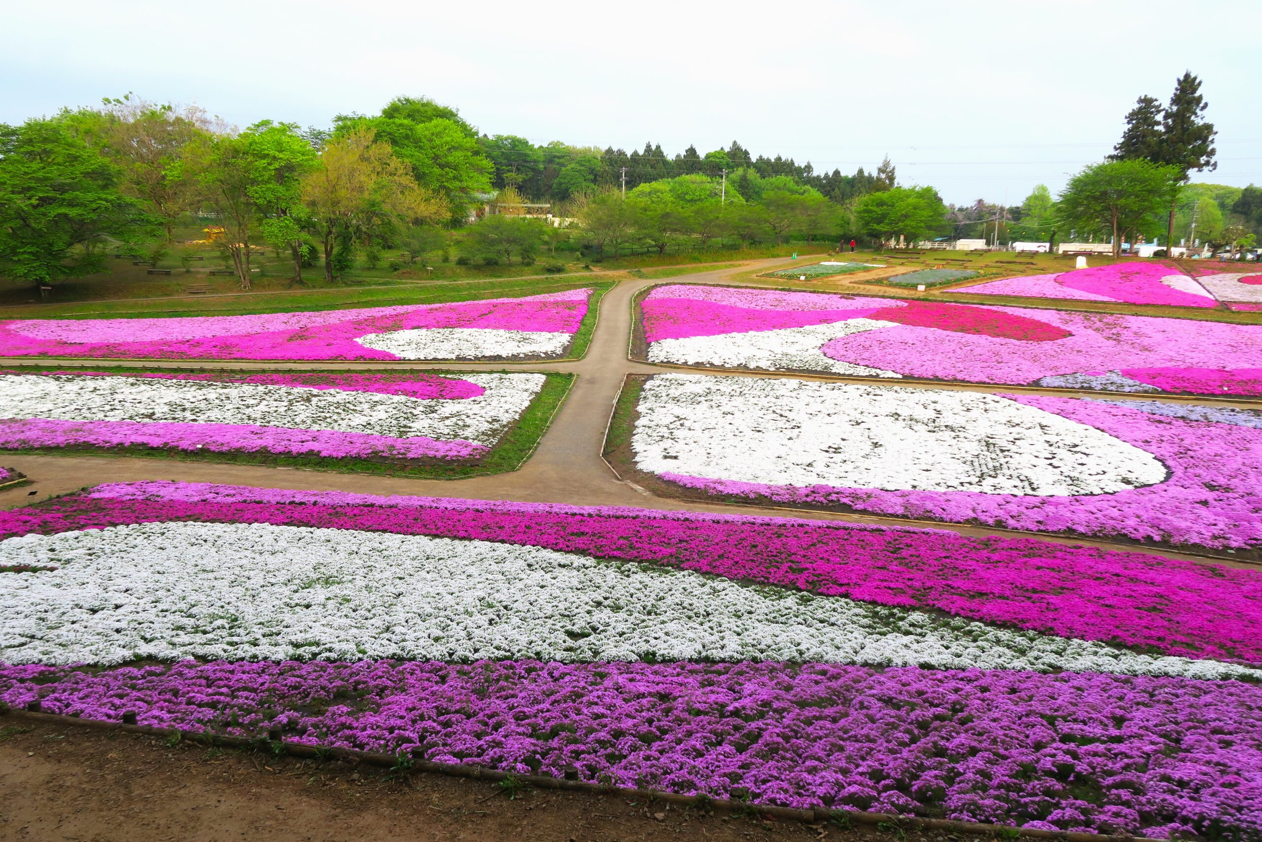 様々な色の芝桜を組み合わせて植栽されていて、文字通りの「花のパッチワーク」です。その圧巻のグラディ―ションは、東側から眺めた斜面に、ユネスコ世界文化遺産に登録された秩父夜祭のクライマックス、屋台が団子坂を曳き上がり秩父神社の女神様が武甲山の男神に会いに行く・・・芝桜の流れるようなデザインは、屋台や、笠鉾に乗る囃子手の襦袢模様と躍動感を表現しています。冬の始まりを告げる夜祭の熱気と、長い冬を乗り越えたふわりとした春の心の高揚が、武甲山が見守る丘の上で響き合うようです。アニメ『あの日見た花の名前を僕達はまだ知らない』や『心が叫びたがってるんだ。』の聖地でもあります。見ごろは例年4月中旬~5月上旬です。