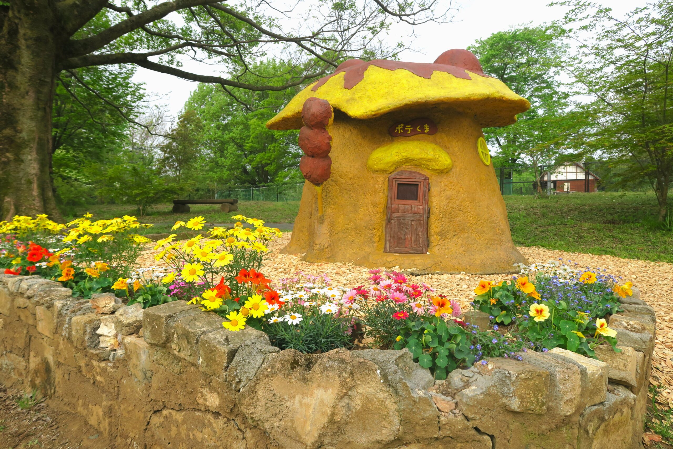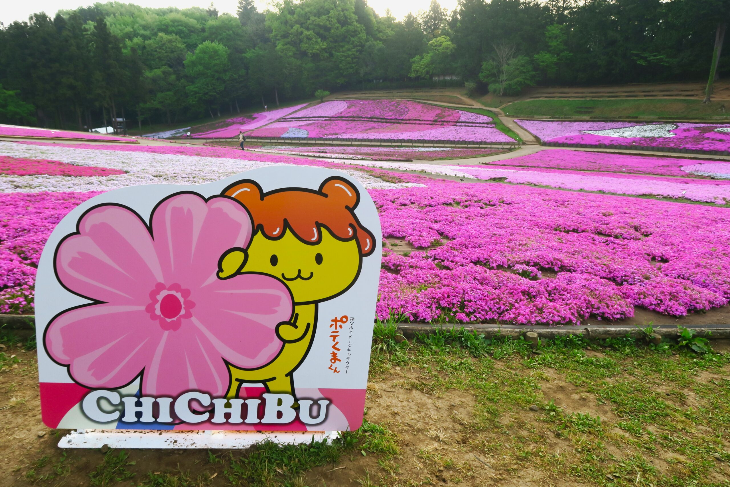 中央部分が谷になり手前と奥方面がなだらかな斜面になっているので立体的に花の風景を見ることができます。両斜面には、観賞用のベンチや芝生の広場があり、のんびりと芝桜を楽しむことができます。一角には「ポテくまくん」の家があります。「ポテきまくん」は秩父市のイメージキャラクターであり、秩父市宣伝部長という肩書を持つくまの妖精です。秩父のソウルフード「みそポテト」が大好きで味噌ポテトを食べ過ぎて、頭から味噌がにじみ出てしまっています。