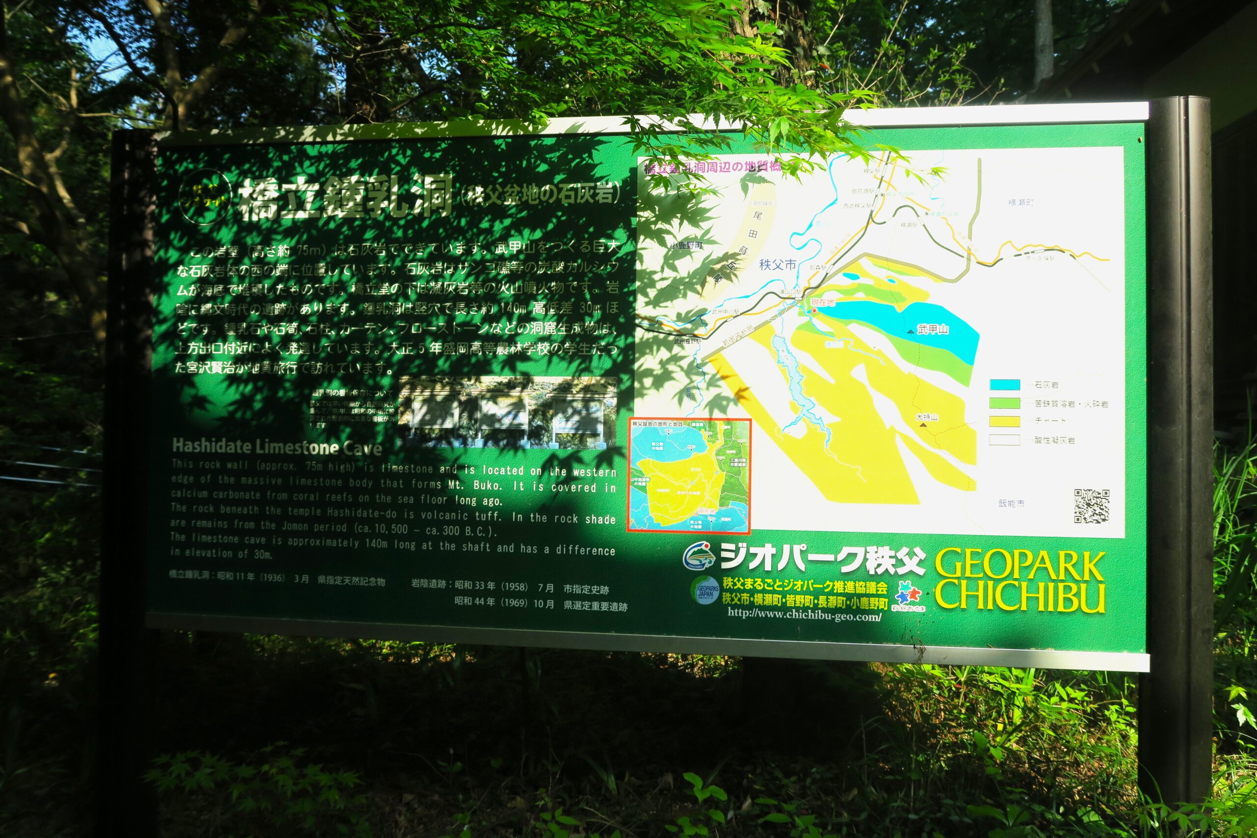 高台にある公園をあとにして彩甲斐街道さいかいのみち(国道140号)を南西へ進みます。森が深くなった頃、国道を離れて県道73号へ、さらにすれ違い不可能な細道を荒川の支流、橋立川に沿った道を進みます。この道は武甲山への裏参道(西参道)で、坂道と石段を上ると、武甲山の石灰岩体の西の端、高さ75mの大岩壁の下に秩父28番札所橋立堂が建ち、境内に県内で唯一の観光洞であり、国内でも珍しい竪穴型の鍾乳洞のジオサイト「橋立鍾乳洞」があります。宮沢賢治も立ち寄っています。