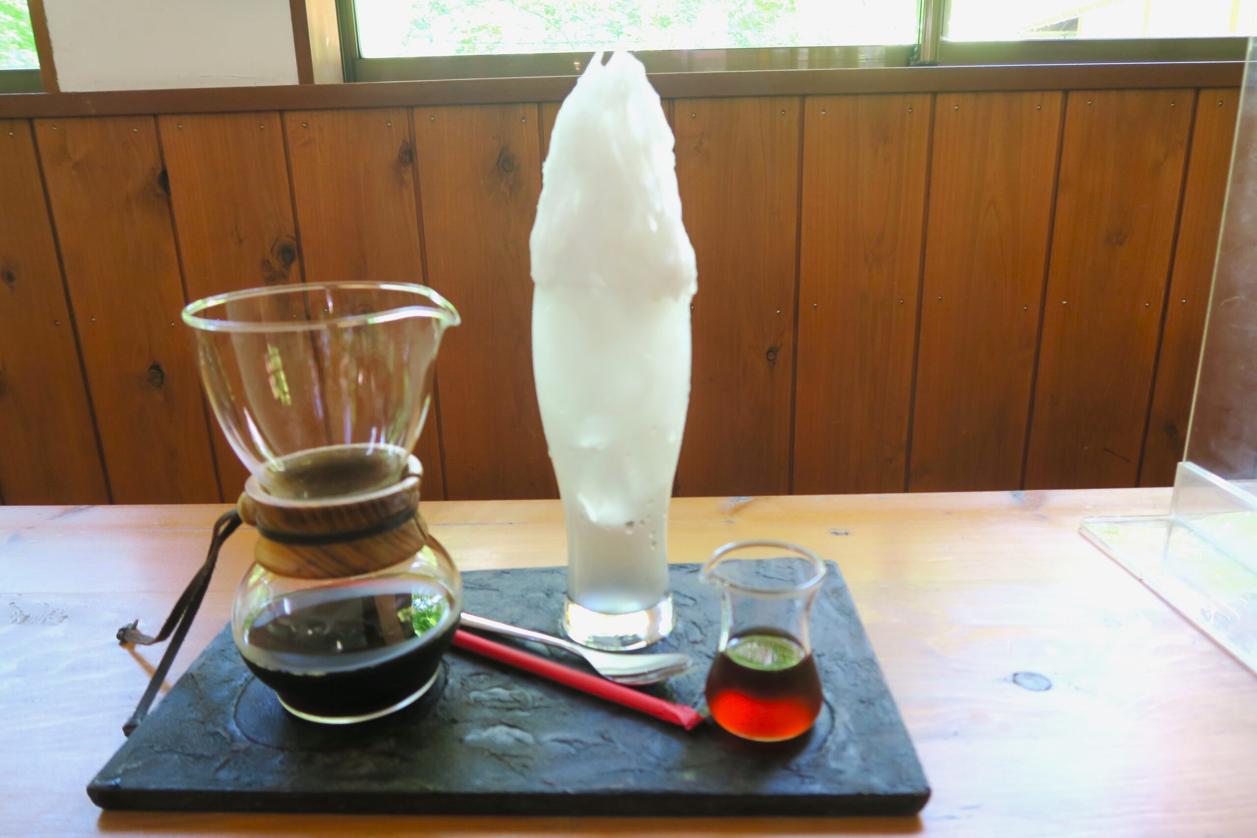 かき氷とアイスコーヒーが楽しめる「淡雪」はこだわりの一品。さとうきびシロップをかけていただくミニかき氷その後のカップに注いで飲むアイスコーヒーは格別の美味さです。