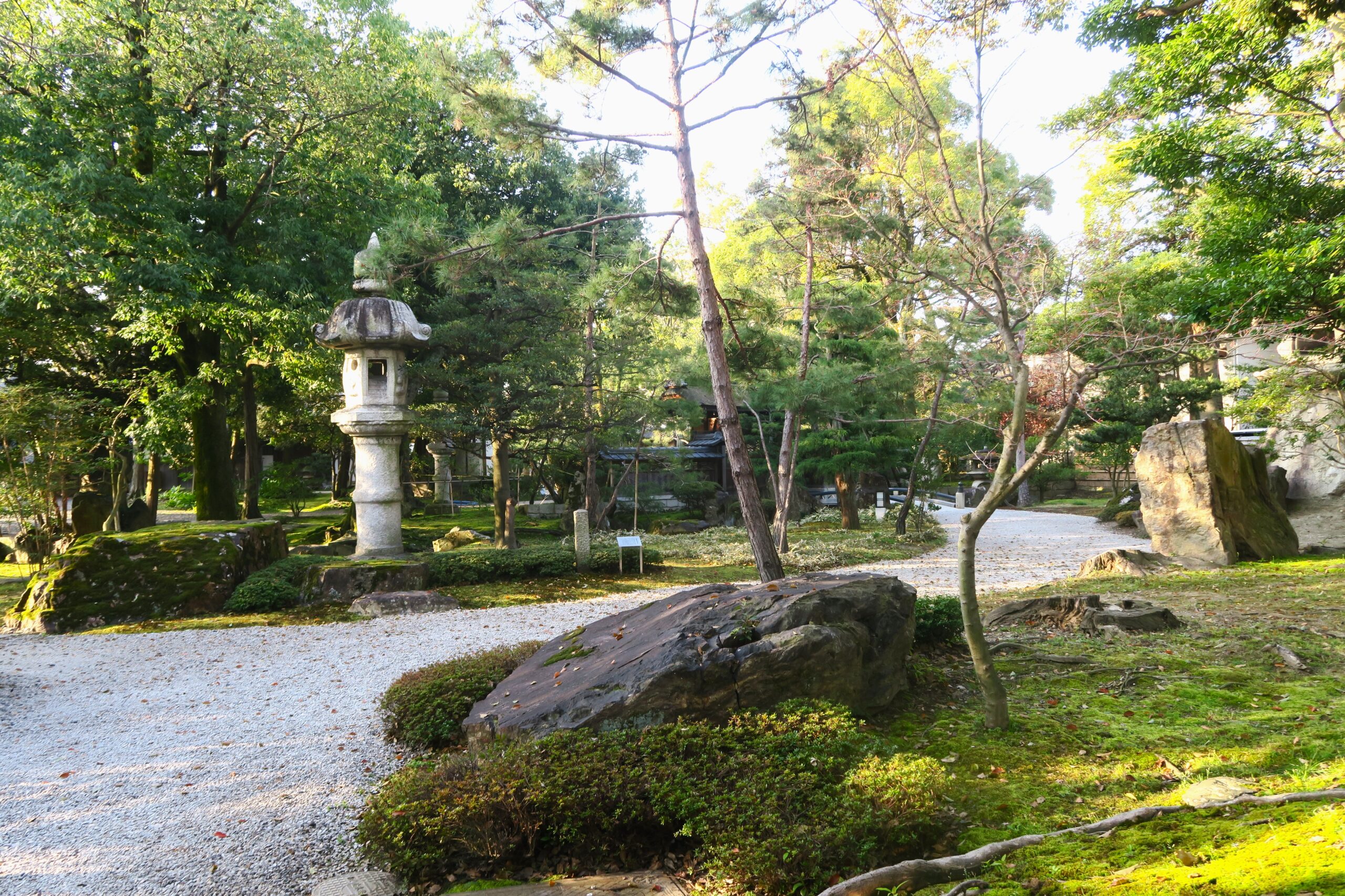 向かいには日本庭園が美しい「慶雲館」があります。明治20年(1887)、明治天皇行幸に合わせて造られた迎賓館で、当時の内閣総理大臣伊藤博文が命名したと伝わります。総檜造り寄棟造りの建物に広がる美しい庭園は、明治天皇行幸啓25周年を記念して明治45年(1912)に7代目小川治兵衛(植治)の作庭によるもので国の名勝に指定されています。写真の前庭は、表門から中門にいたるまでの平庭で、高さ5mの巨石を用いた大灯籠や横綱像などを配置しています。
