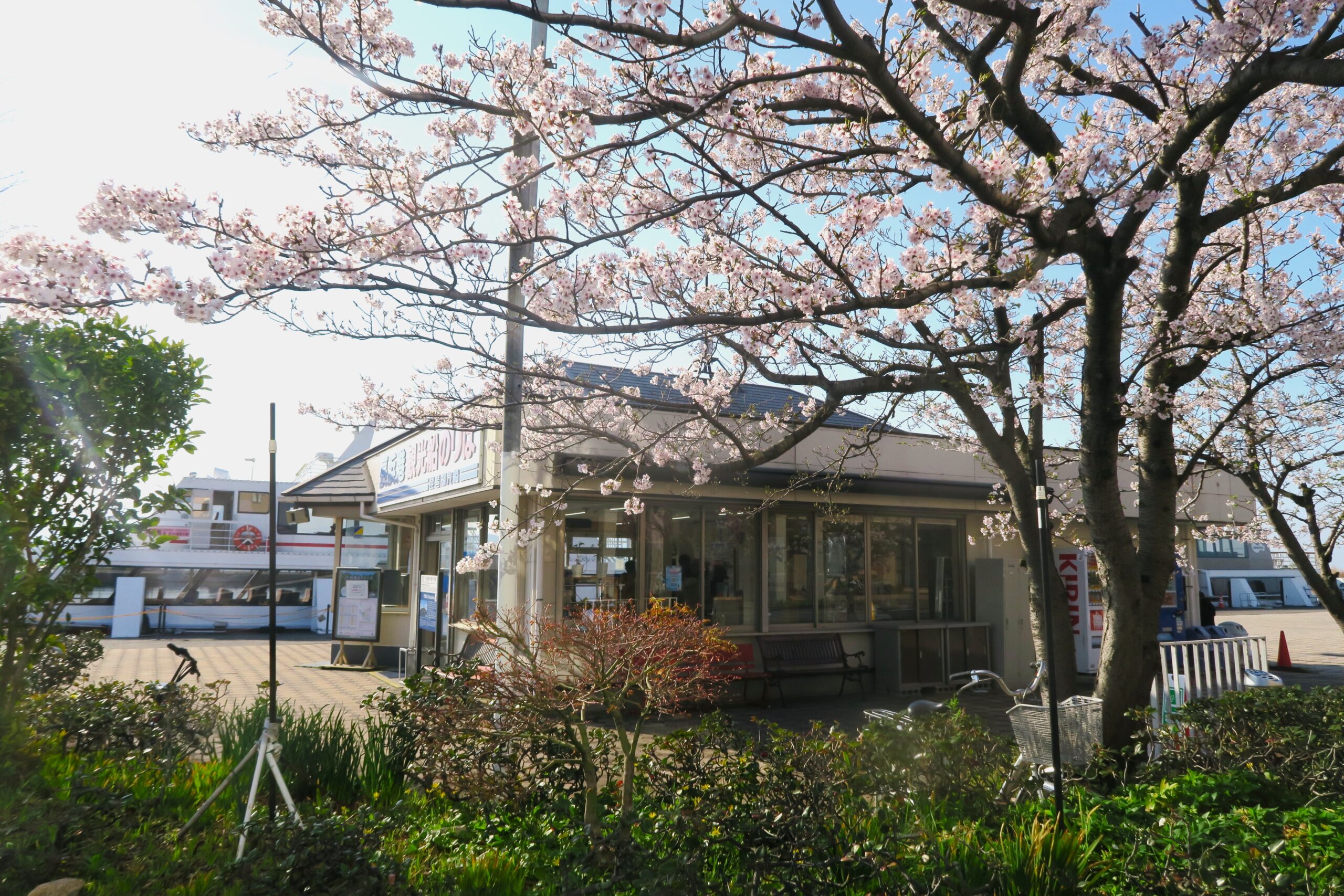この時期琵琶湖岸の約4kmの桜並木が見える海津大崎を湖上から優雅に鑑賞できる船が運航しています。今回は長浜港から9:20に出港する琵琶湖汽船「海津大崎桜クルーズ」を予約しておいたのです。乗船料大人一人3600円、片道50分の船旅です。