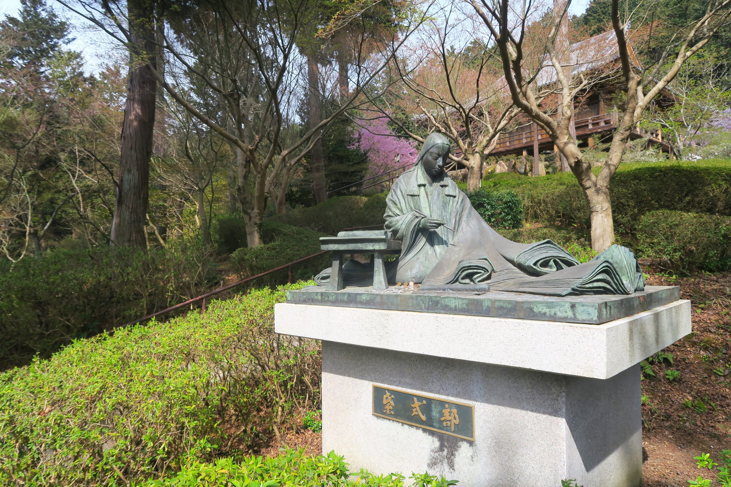 源氏苑に置かれた紫式部のブロンズ像は、土佐光起の絵をモデルに造られたものです。紫式部像に触れると願いが叶うとか。本堂の「源氏の間」も必見です。