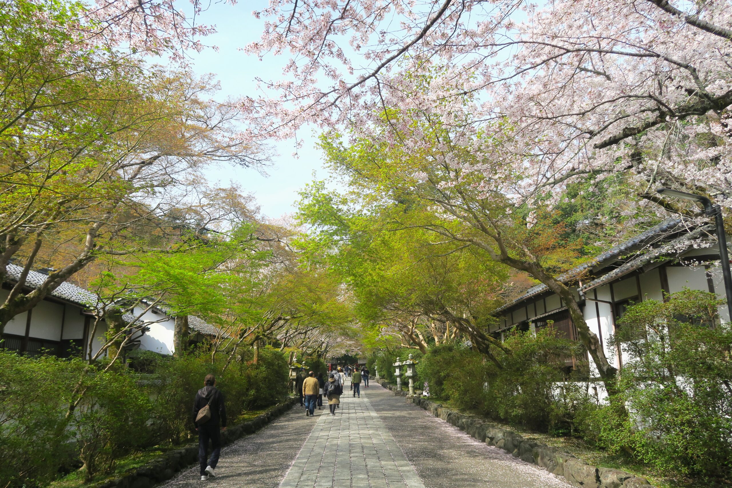 東大門をくぐると、木漏れ日が降り注ぐ参道がまっすぐ伸びています。参道を進むと寺名の由来でもある白い硅灰石があちこちに露出しています。