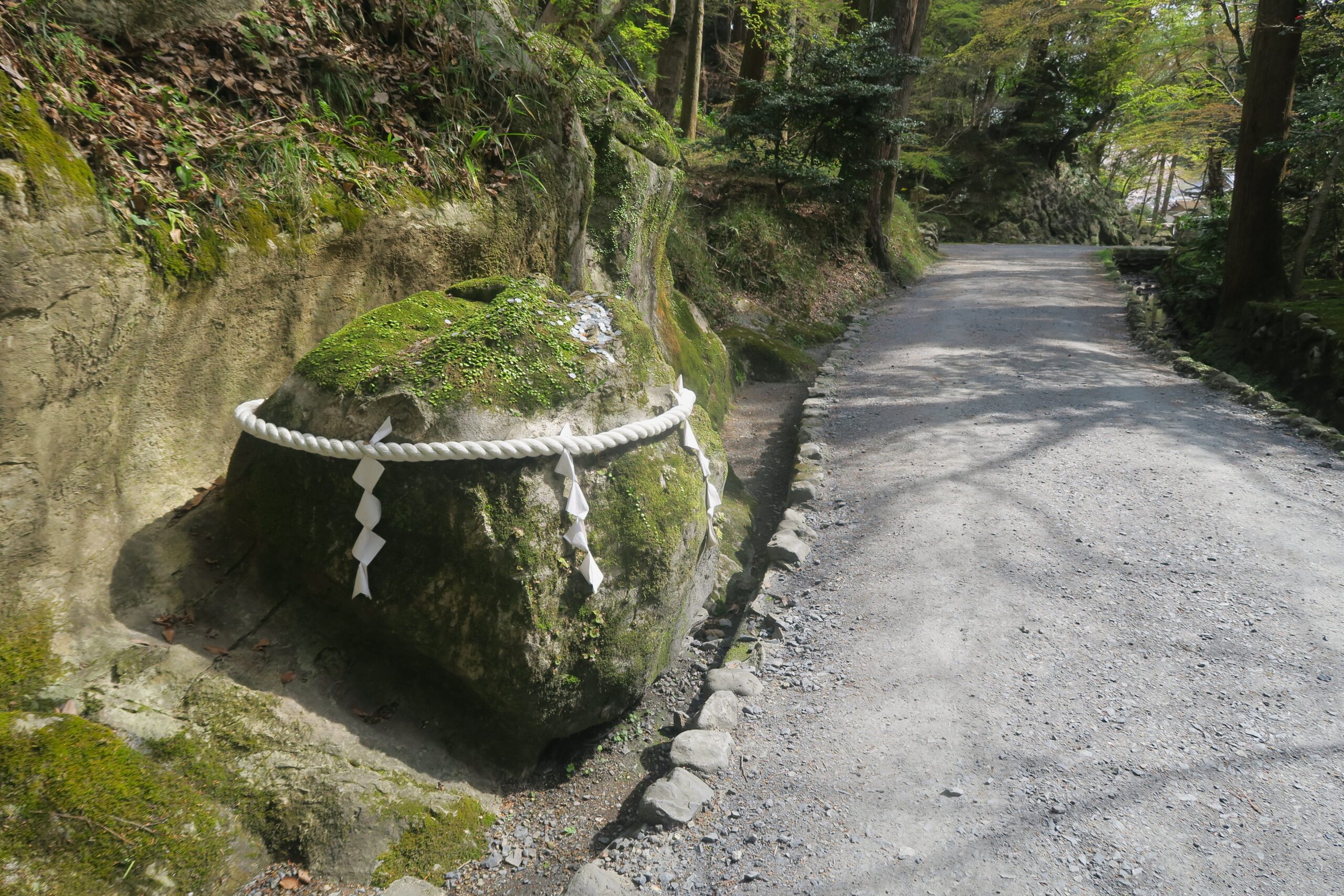 参拝受付方面に下りてくる途中には天智天皇の石切場や神木の天狗杉があります。本堂真下のこの場所は天智天皇の御代、石切り場であったといわれ、採石跡が残されています。ここから切り出された石材は660年頃、飛鳥四大寺の一つの数えられた川原寺中金堂の礎石に使用されています。石材の運搬は瀬田川から淀川へ下り、大和川をさかのぼって飛鳥の地へと水路を用いて運ばれたと考えられています。