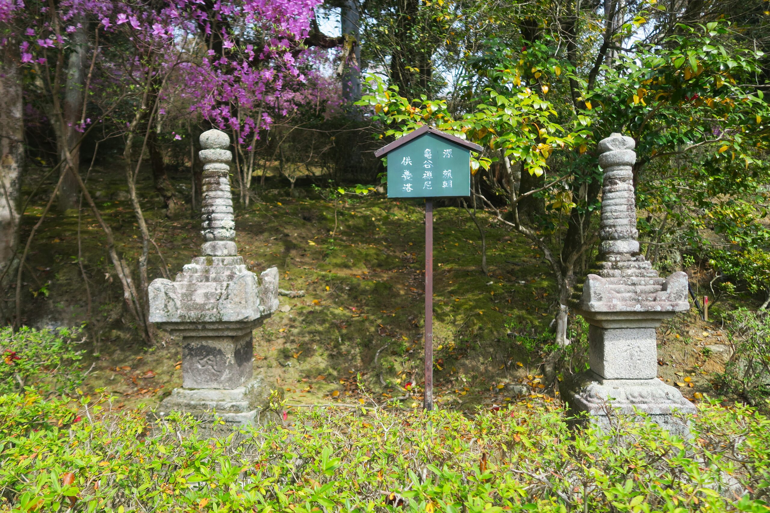 傍らに立つ二基の宝篋印塔は右が源頼朝、左が亀谷禅尼(中原親能の妻、源頼朝の第二の姫の乳母)の供養塔です。源平の乱にあたって源頼朝の命を受けて戦った中原親能は石山寺の毘沙門天に戦勝を祈願し、事の成就に感謝した源頼朝は石山寺を篤く庇護し、亀谷禅尼の請によって多宝塔・東大門・鐘楼などを寄進しました。近くにはめかくし石といい目隠しをしてこの石を抱けば所願成就といわれています。