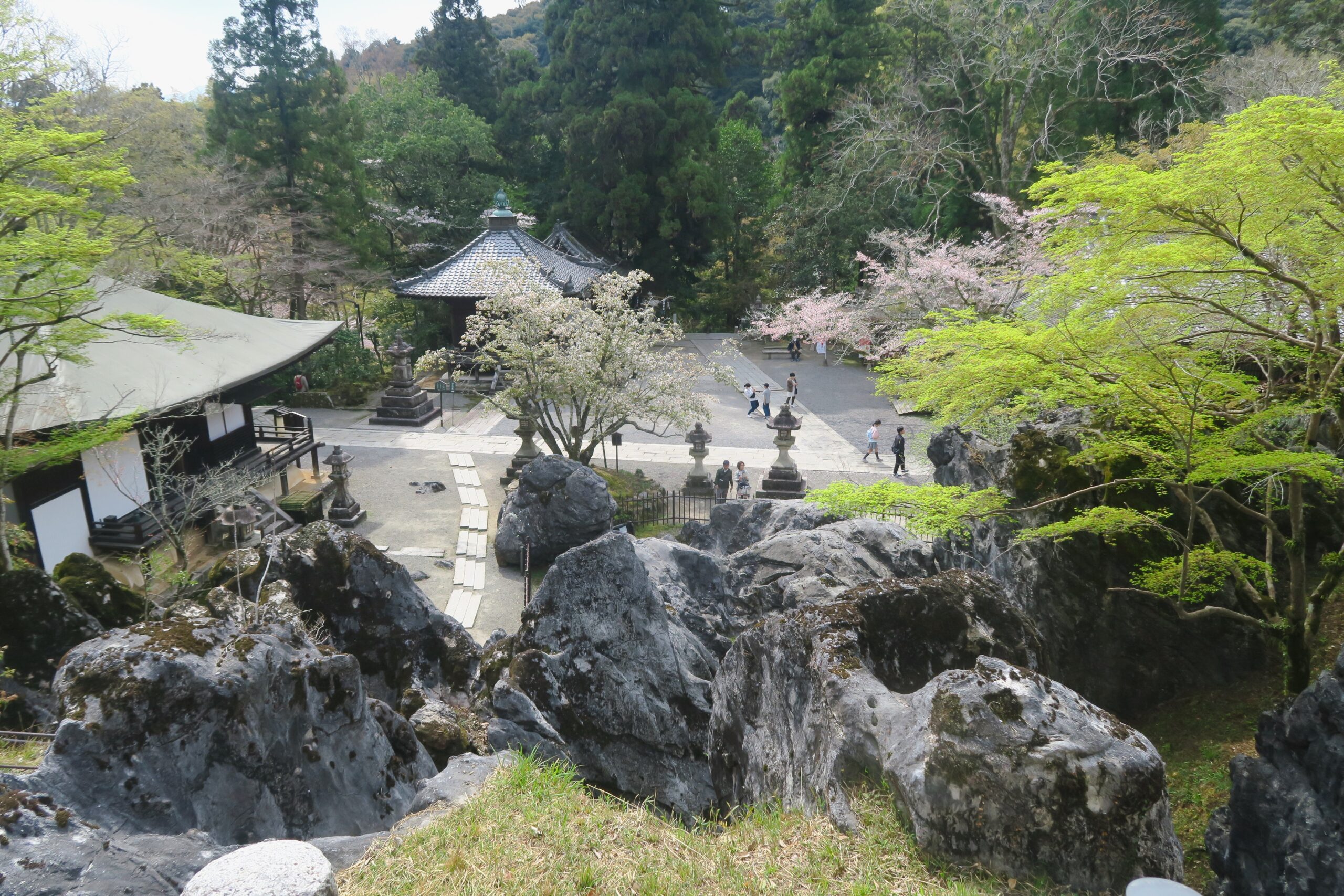 このあたりから異様な硅灰石越に見る境内は絶景です。左手に弘法大師と第三代座主・淳祐内供が祀られる御影堂、その奥の2棟は毘沙門堂と観音堂です。木々で隠れていますが左手に本堂があります。