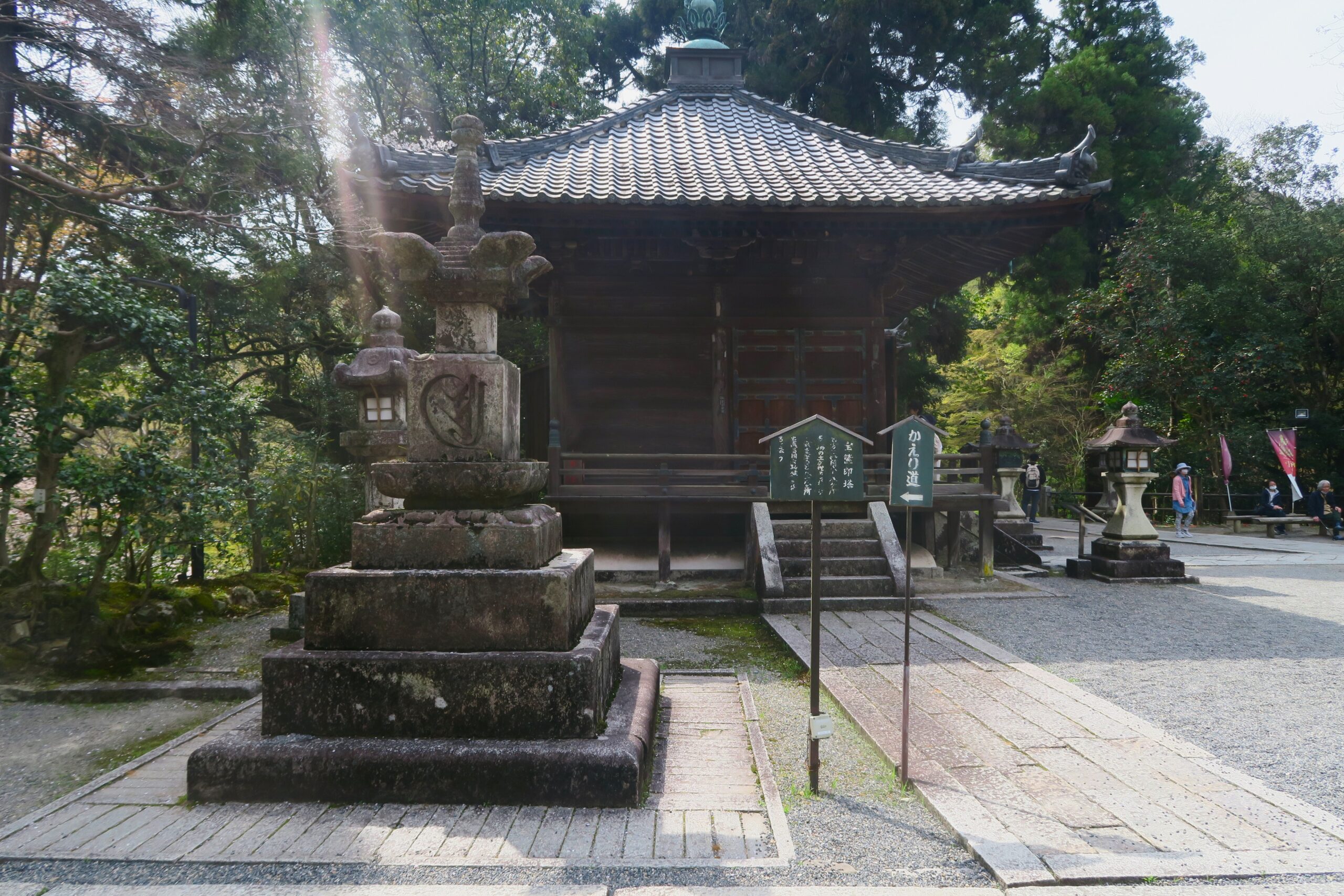 本堂から一段上ると重要な経典や聖教類が収蔵されていた県下最古の高床式校倉造り経蔵の傍ら写真右手に、宝篋印塔の笠を三つ重ねた珍しい層塔があります。鎌倉時代のもので紫式部の供養塔と伝えられてきました。またその隣には紫式部を慕って詠んだとされる芭蕉の句碑があり「あけぼのは まだ紫に ほととぎす」とあります。