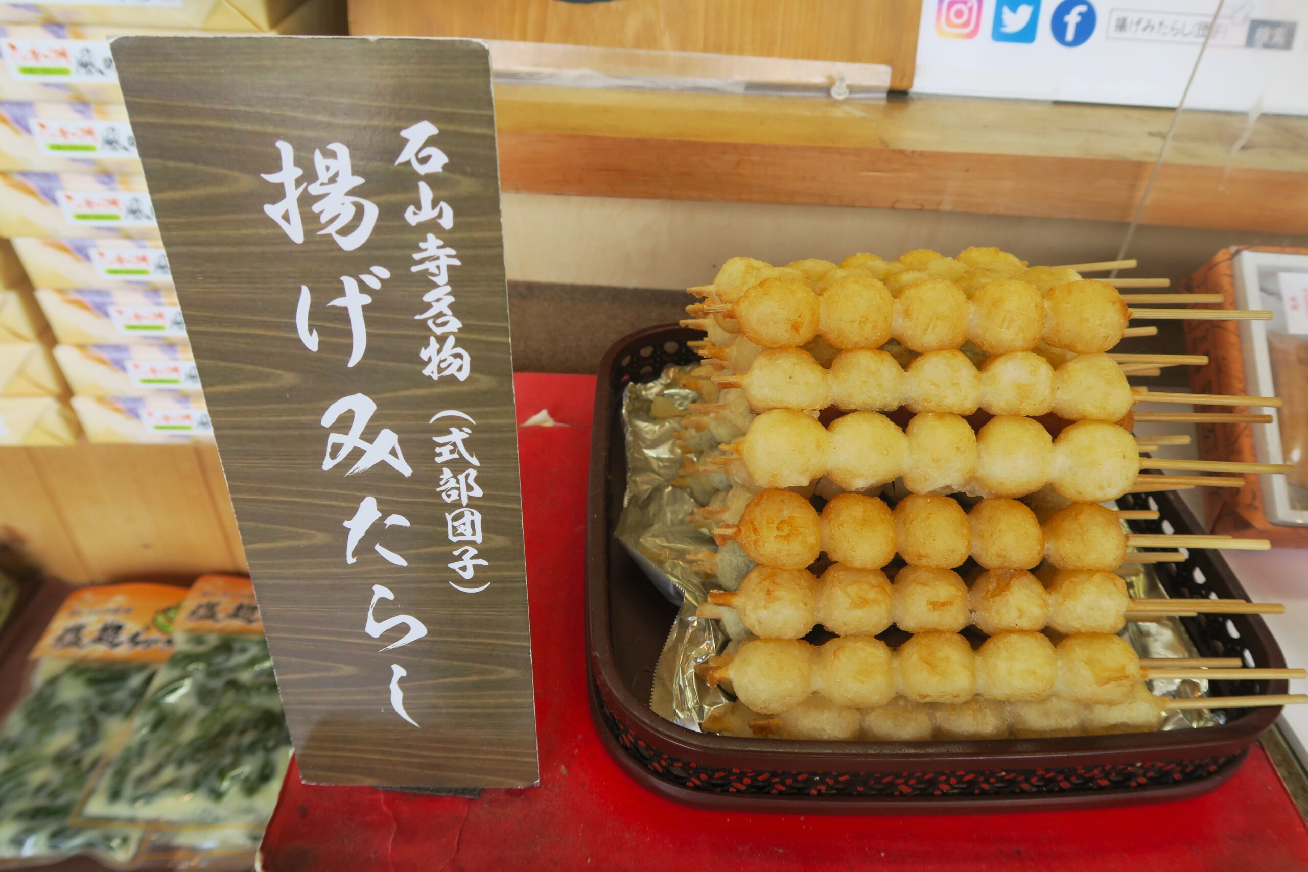 山門前にはお店が並び、石山名物「力餅」を販売する叶 匠壽庵 石山寺店も軒を連ねます。明治中期までには、岩を模した「石餅」があり、身体を清め、力が宿り、石のように固い絆が結ばれるようにと祈念し食したという故事を元に復元されたものです。今回は店先の緋毛繊が敷かれた縁台の腰掛けて、ほたるの里さんの石山寺の新しい名物、揚げみたらし(1本150円)をいただきます。外はカリカリ、中はモチモチの新食感で話題です。