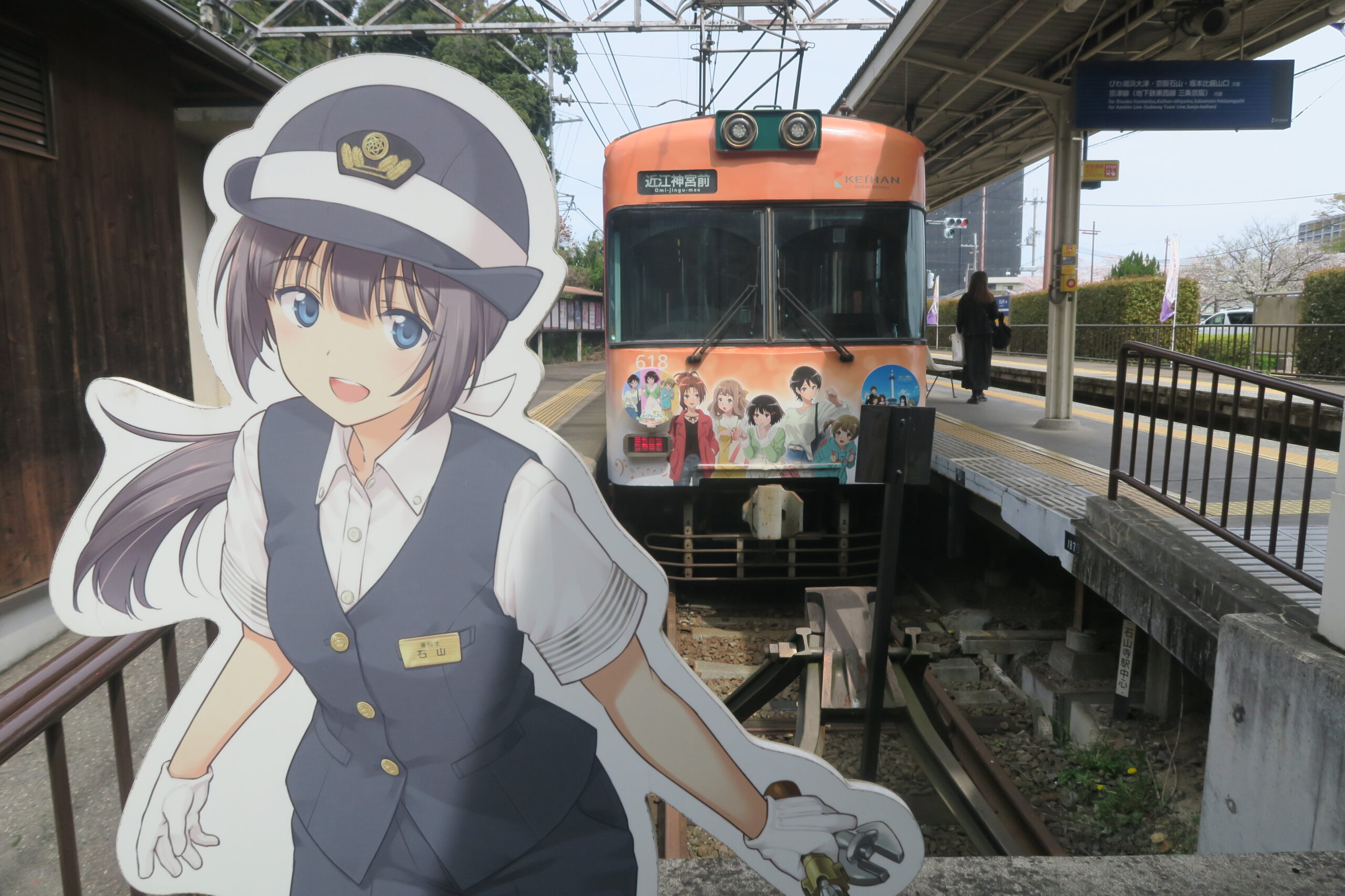 石山寺駅から再び電車に乗車しますが、停まっていた電車は「輝け!ユーフォニアム」のラッピング車両でした。