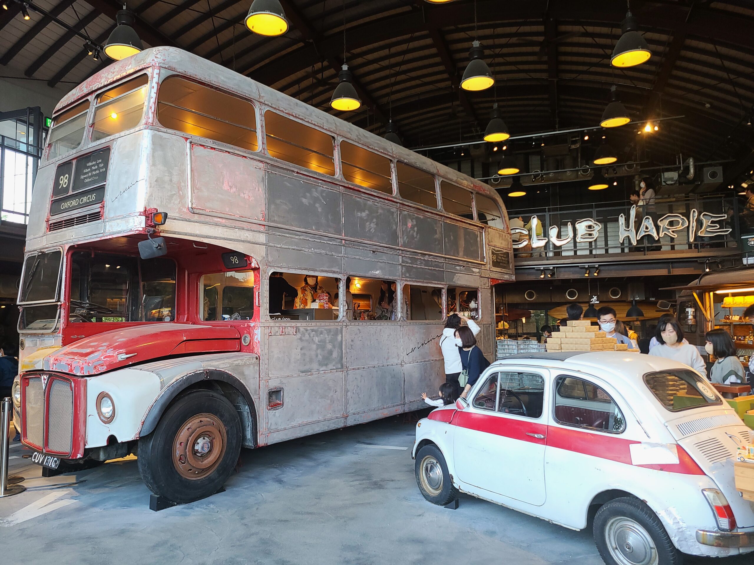 メインショップの右手、左回りで歩いた最後には、おみやげ探しに2階建てロンドンバスがシンボルの「ギフトショップ」に立ち寄ります。おもちゃ箱をイメージしたというガレージにクラブハリエやたねやのスイーツがほかのお店と違ったかわいいパッケージで売られています。バスの中ではマカロンを販売しているので入ってみましょう。