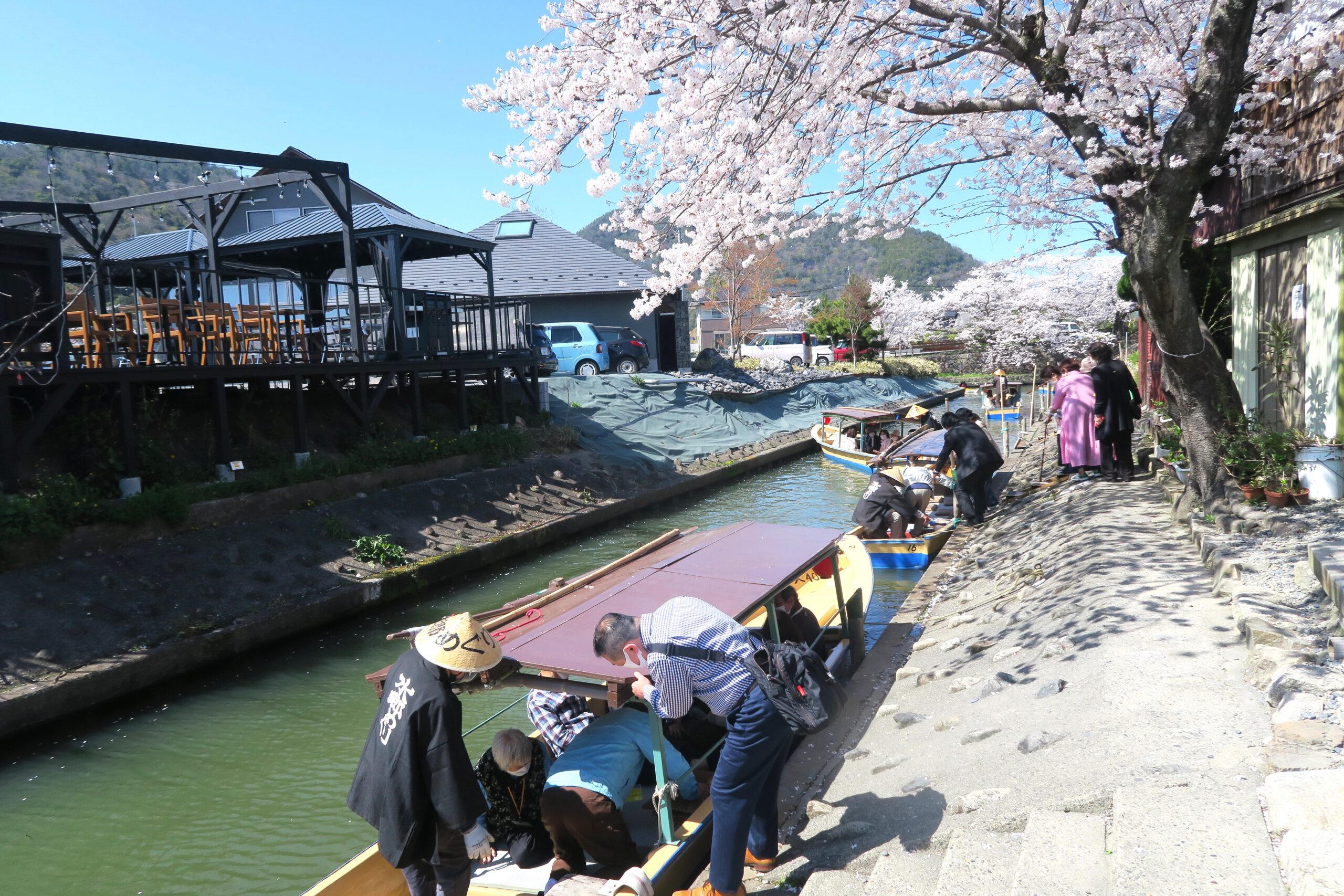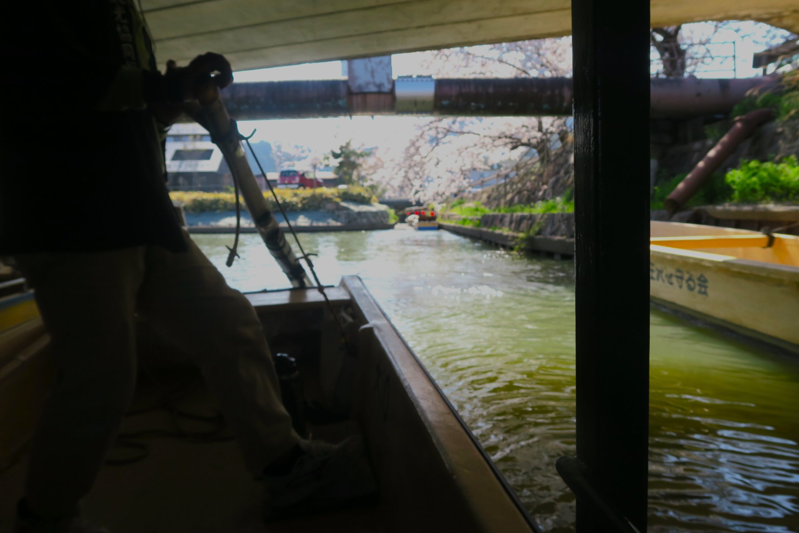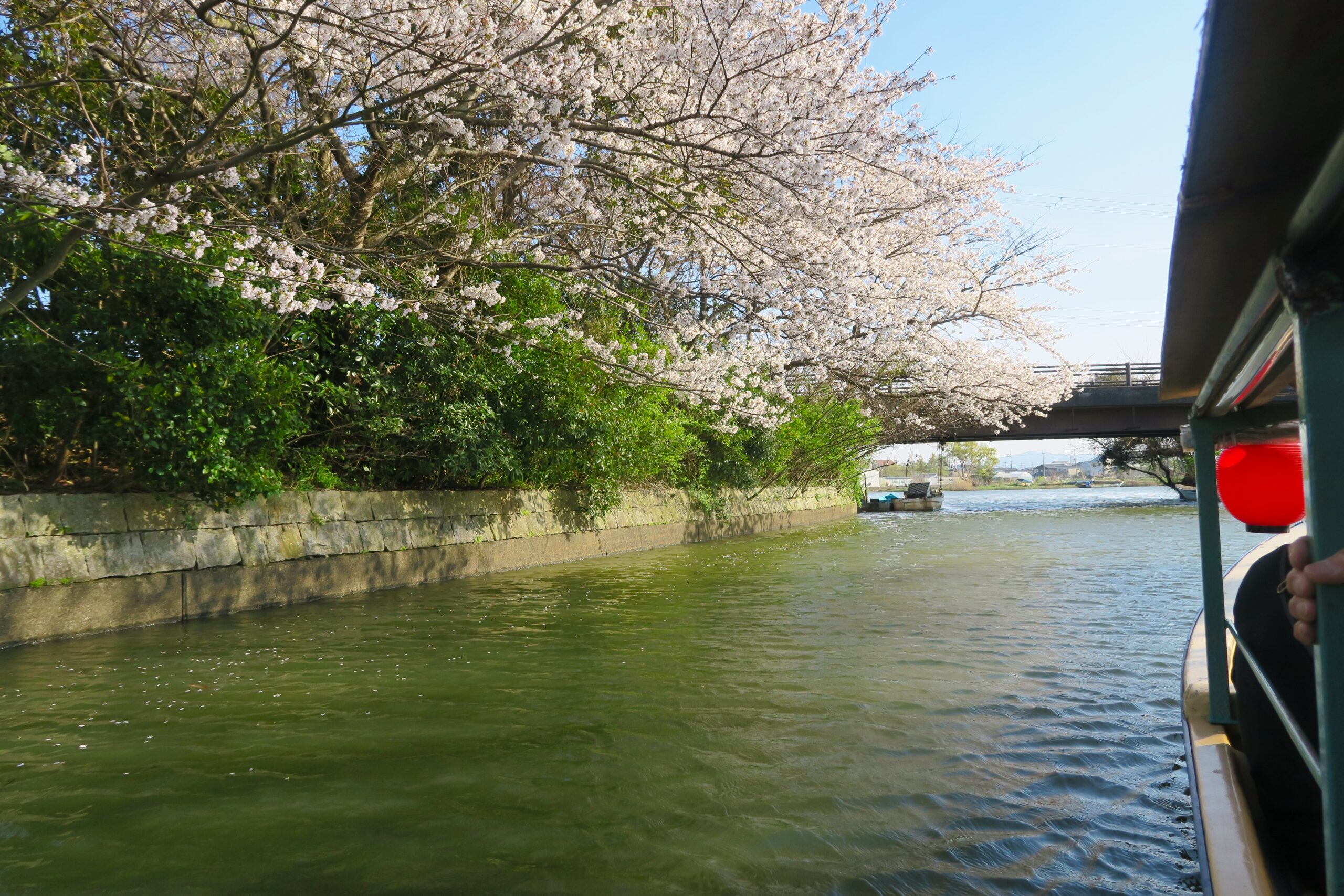 コースの途中にはいくつもの橋がかかり、その下をくぐるのも楽しい。いよいよ終盤に入り春のこの時期、満開の桜や風流な水柳が見れる水路を、櫓の音に耳を傾け、水面を滑るように進む舟に心地よく揺られていると、あっと言う間に8つ目のよし笛橋、9つ目の岩崎橋、10番目の幸田橋をくぐって終点です。