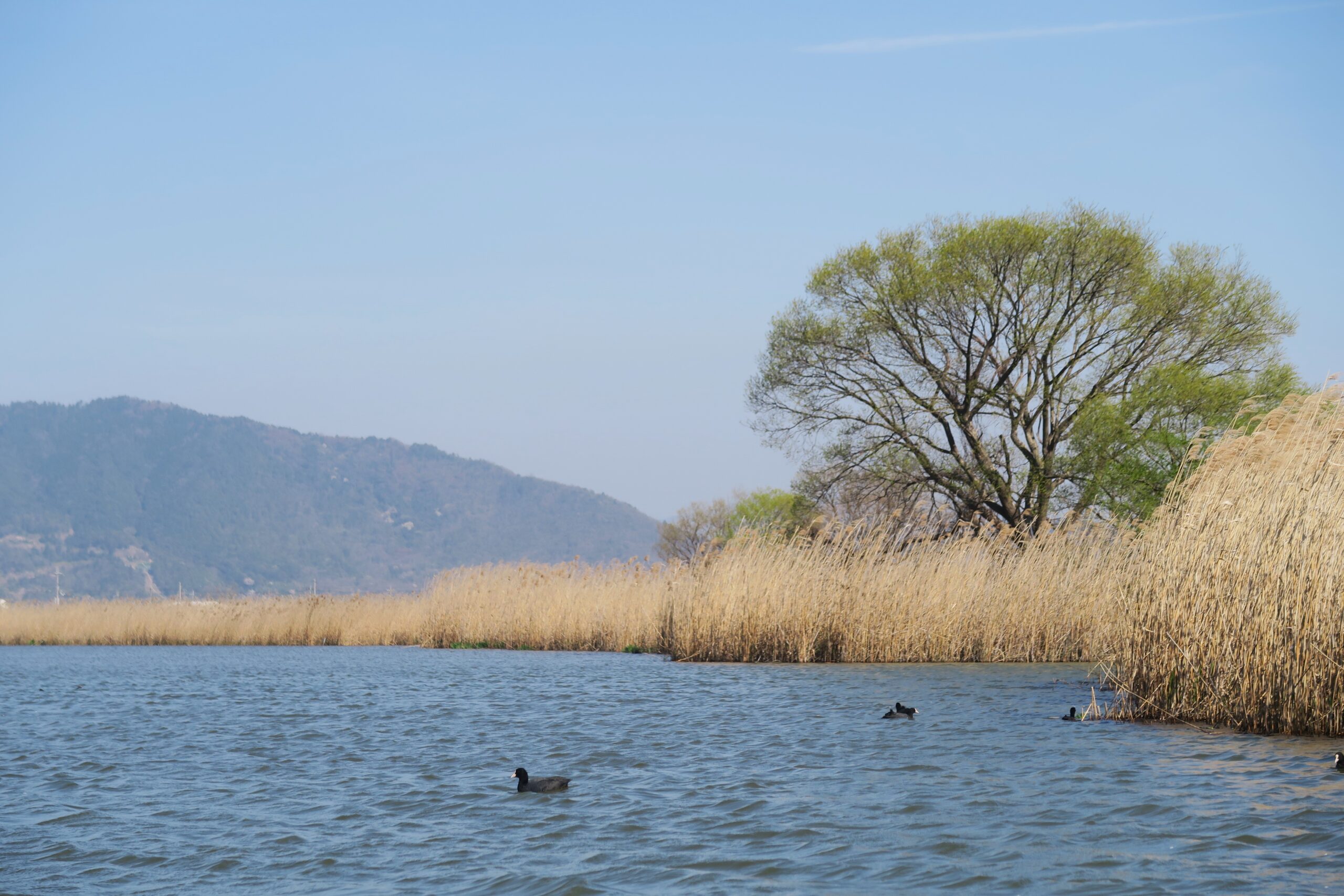 「ヨシ」は「葦(アシ)」とも呼ばれるイネ科の植物。水郷地帯の美しい景観を生み、夏には4mまで青々と茂り、秋になると葉を落とし黄金色に変化します。西の湖周辺のヨシは、ヨシ細工の円山として有名で、昔から葦簀等に使われてきました。水を浄化する機能を持ち、浄化された水は水辺に生息する鳥や魚たちにとって“命の水”となっています。琵琶湖の自然は固有種の湖魚を使った佃煮や鮒ずしなど、独特の食文化を育んできました。カルガモやカイツブリなどの水鳥の姿に癒されます。