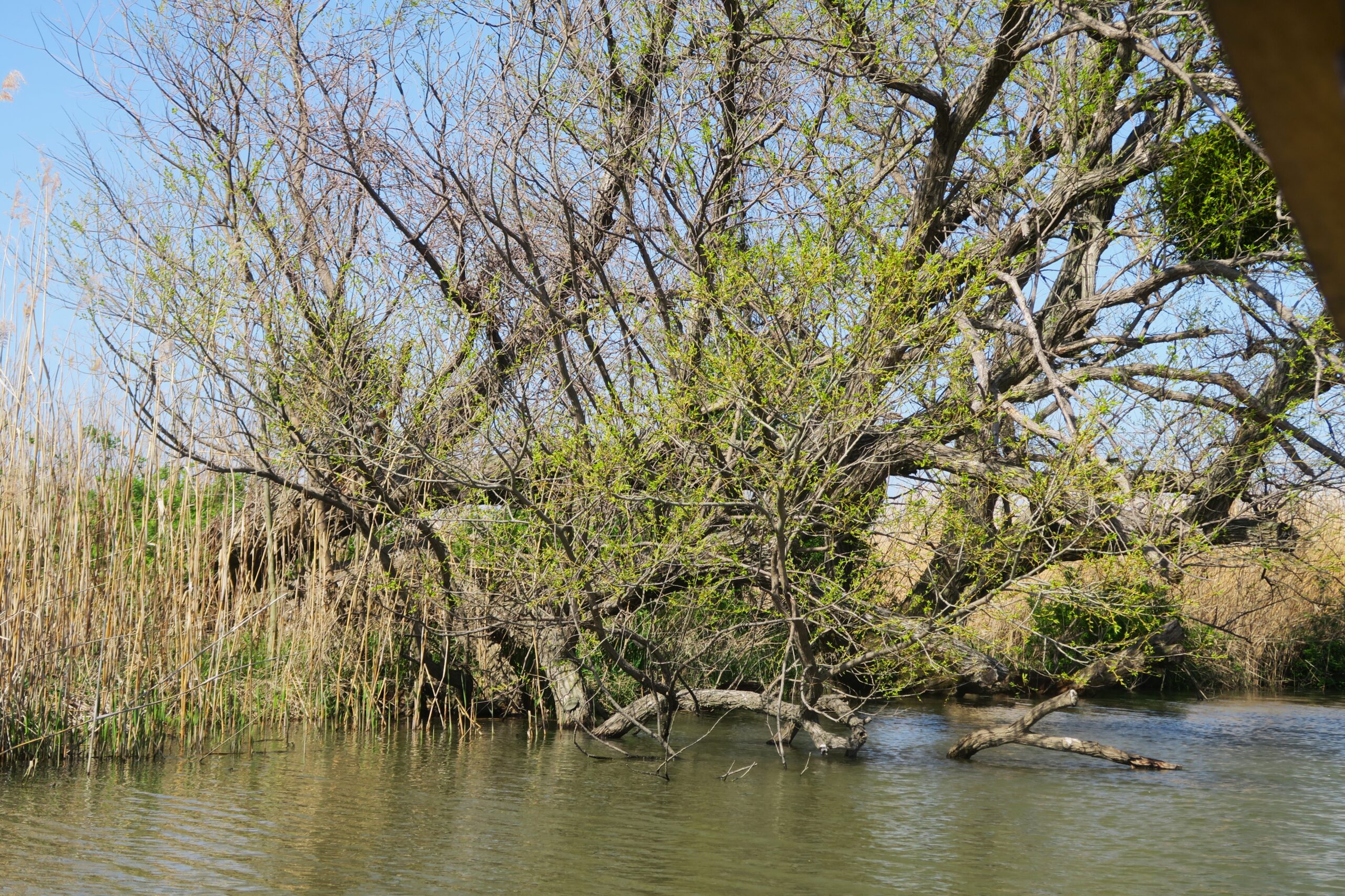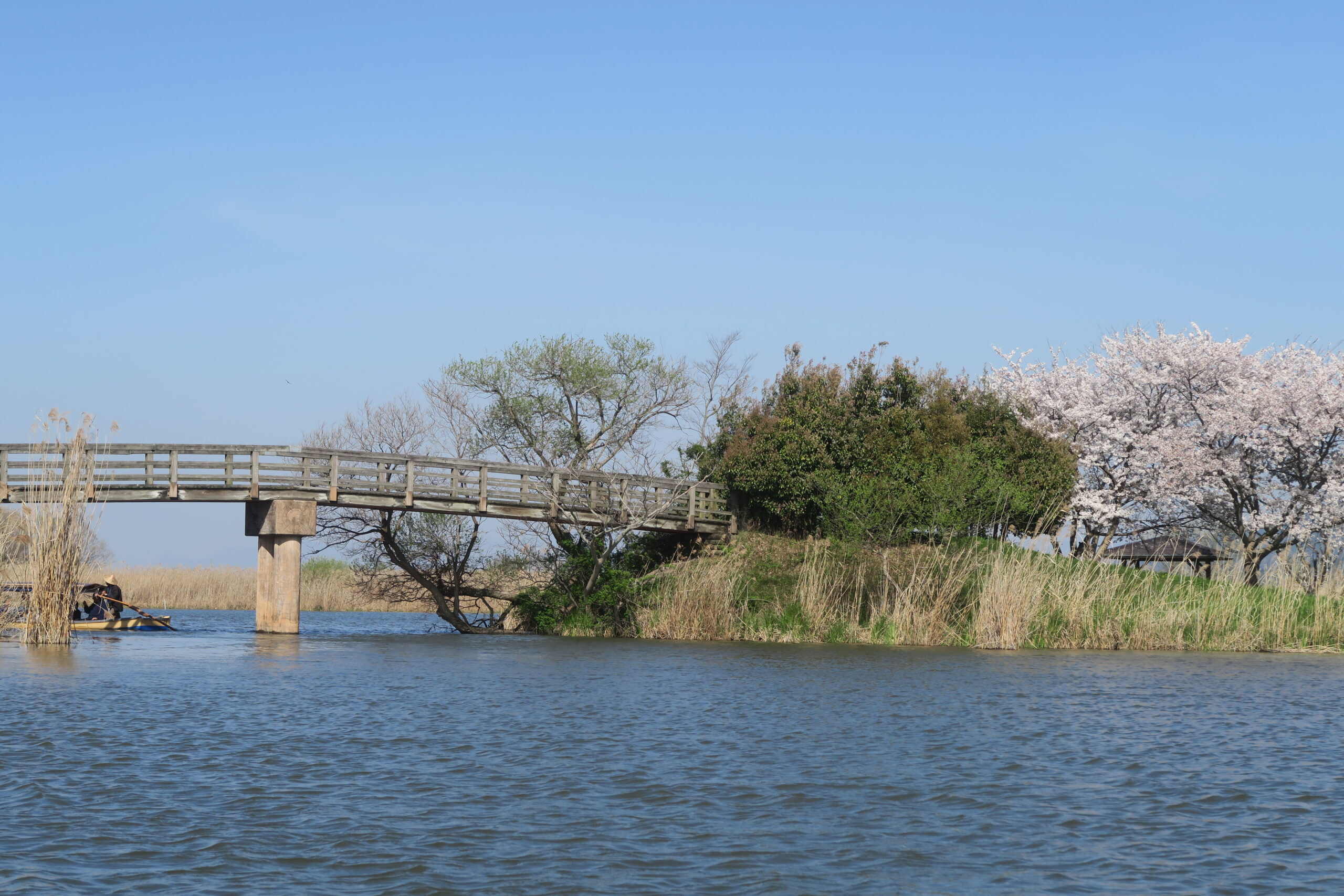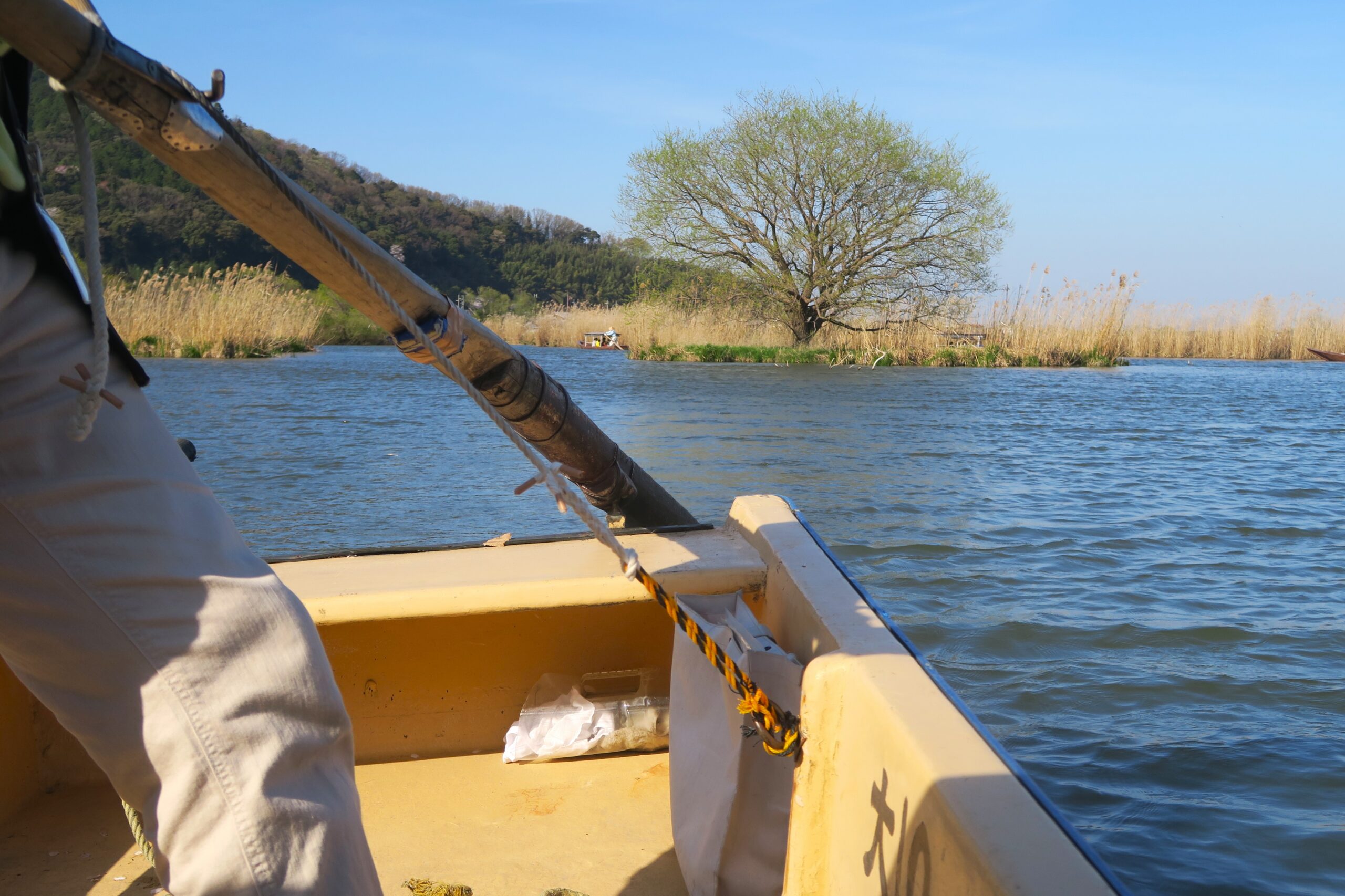 再び両側にヨシが繁る瓦堀と呼ばれる水路を行きます。舟の行く手に見えるのは、カワヤナギの古木。途中、ウナギの筒が仕掛けてあったり、桜並木の水路を通ったり様々な景色に出会えます。